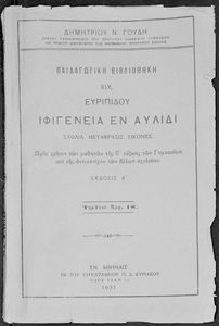 Κωδικός αναγνώρισης: 01-42022 Τίτλος: Ευριπίδου Ιφιγένεια εν Αυλίδι, προς χρήσιν των μαθητών της Ε΄ τάξεως των Γυμνασίων και της αντιστοίχου των άλλων σχολείων Συγγραφέας: Ευριπίδης, Δημήτριος Ν. Γουδής (μετάφραση, σχόλια) Μέγεθος και υπόστρωμα: Μαθητικό βοήθημα, 22εκ., μαλακό εξώφυλλο, 137 σελίδες. Εικόνες (ασπρόμαυρες). |