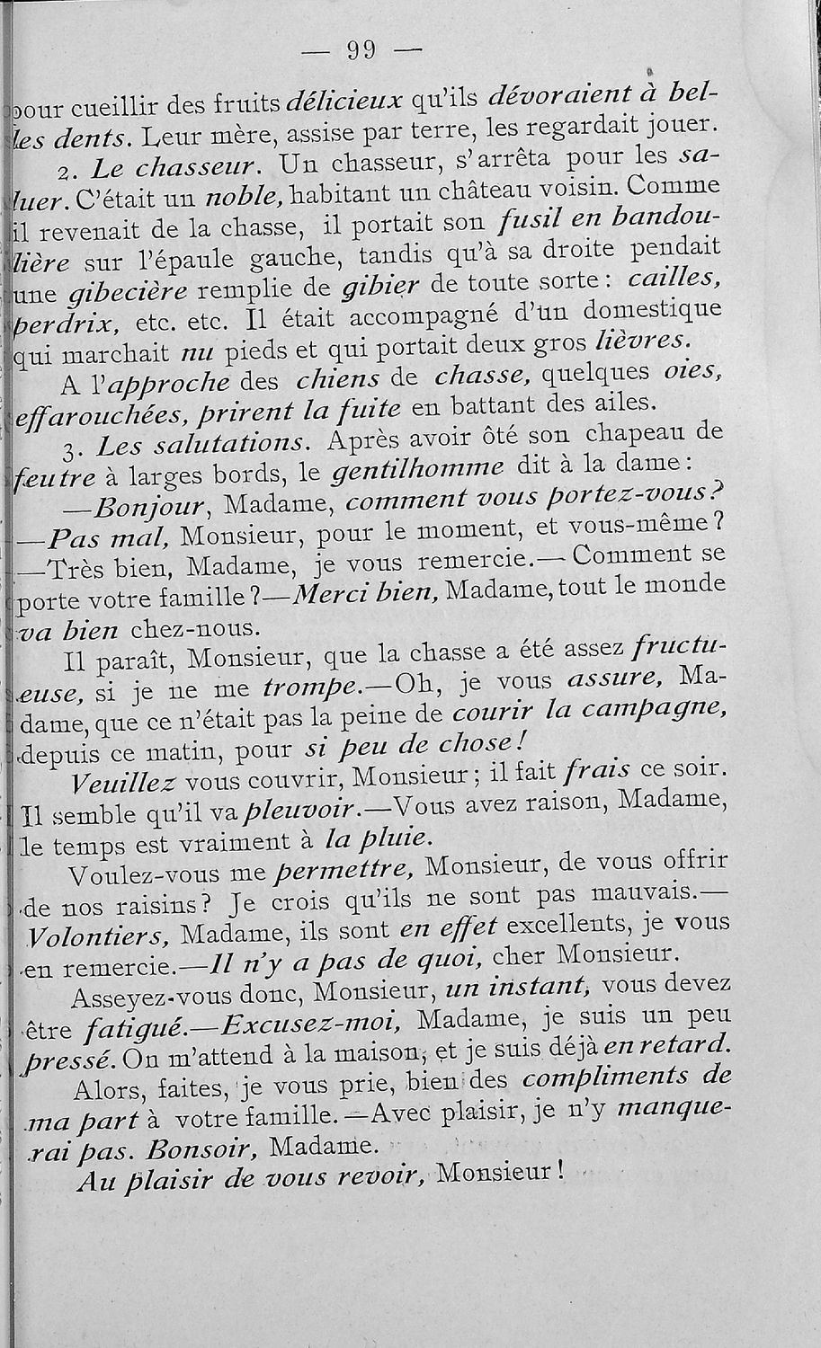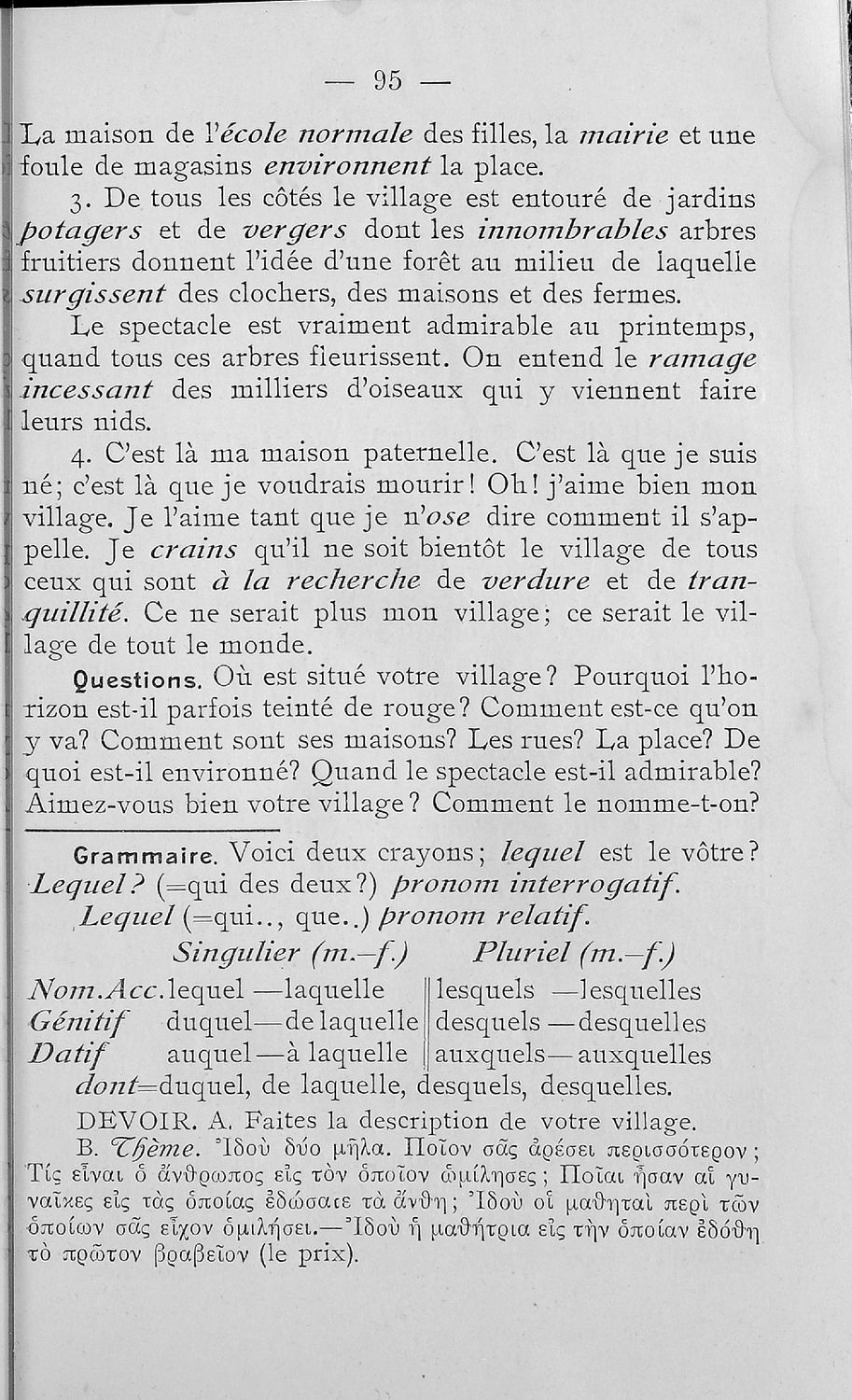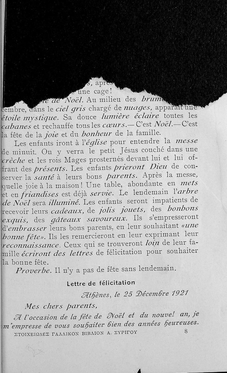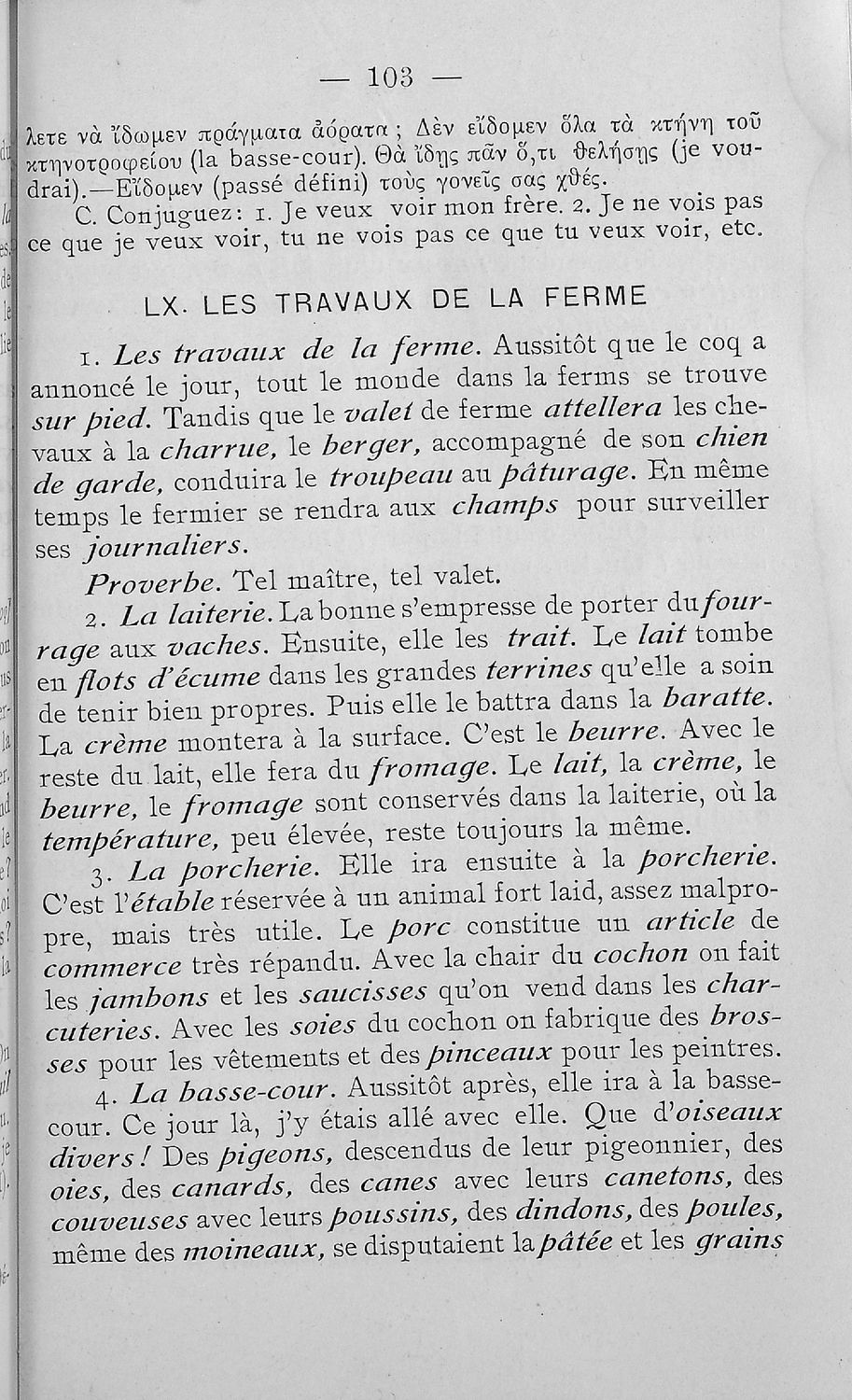 Σχολικό εγχειρίδιο Γαλλικών για τις Β΄ και Γ' Ελληνικού Σχολείου, Αστικού Σχολείου και Παρθεναγωγείου που περιλαμβάνει κείμενα, κανόνες γραμματικής και συντακτικού, και λεξιλογικά και πραγματολογικά σχόλια.