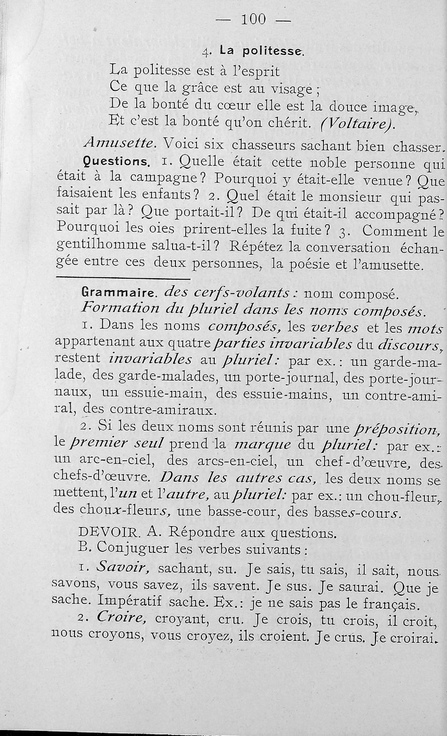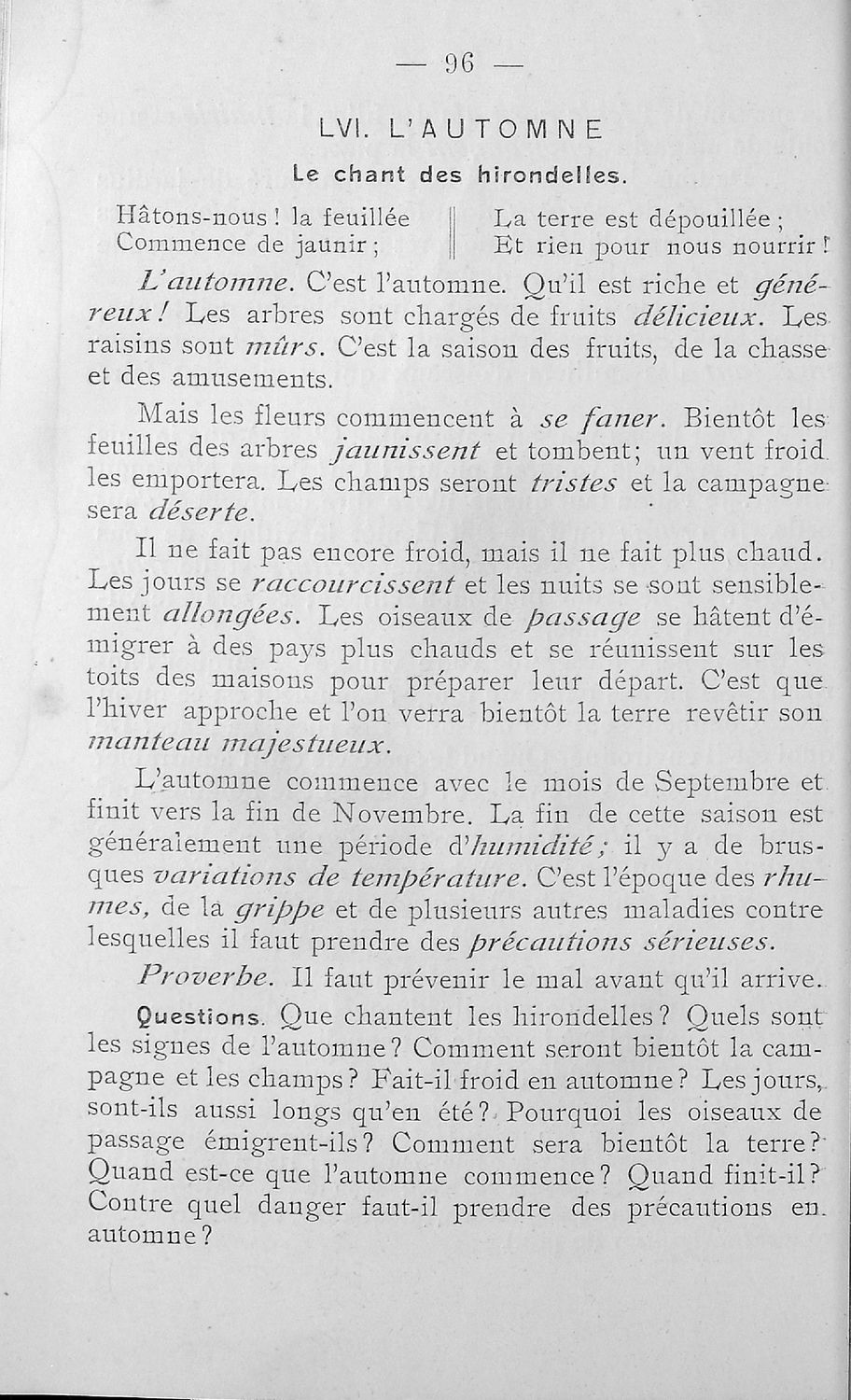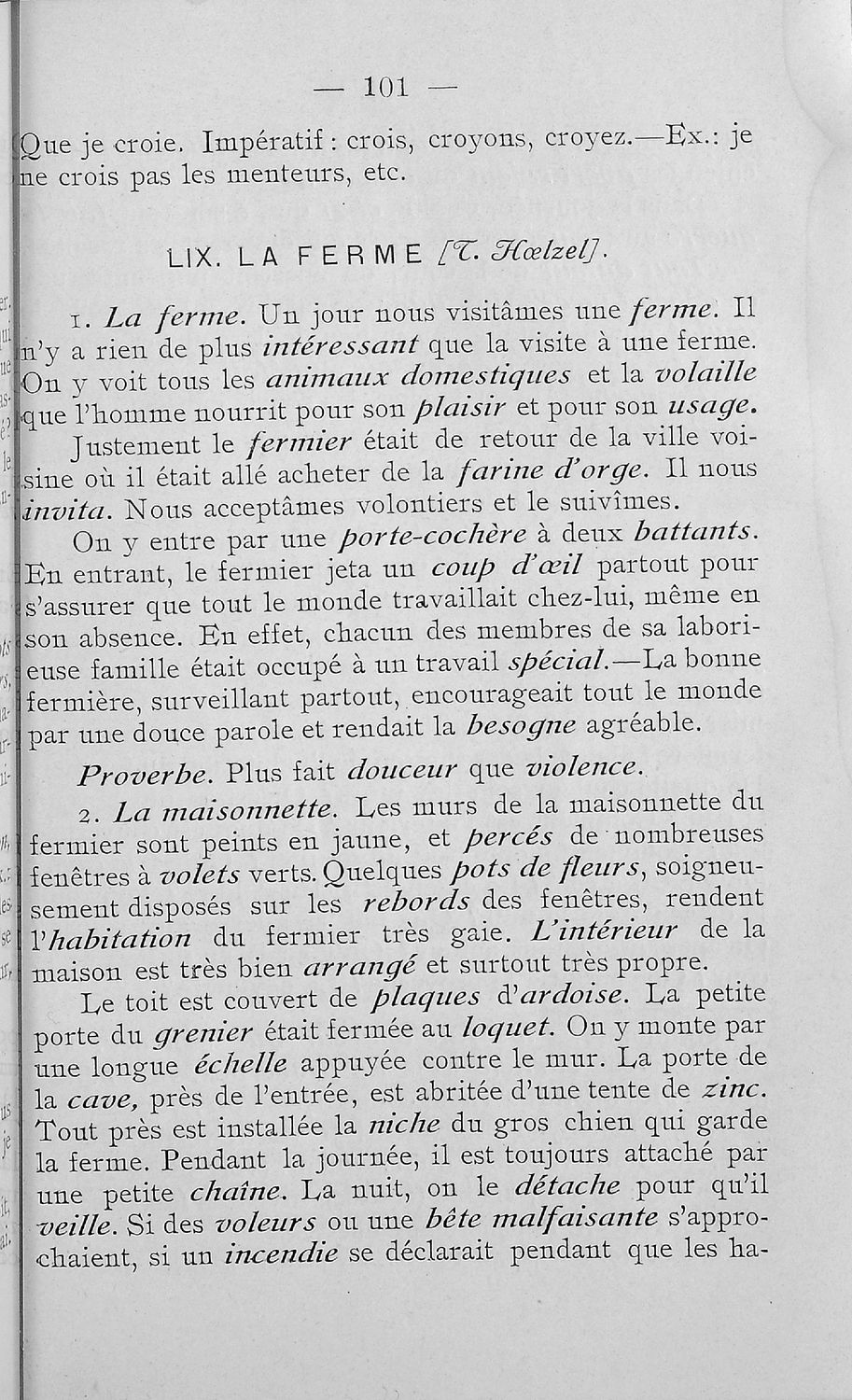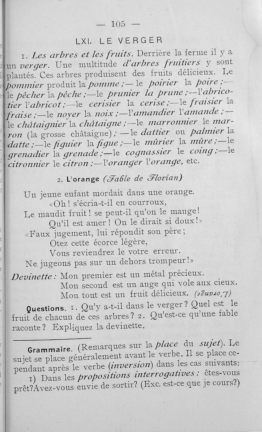 Σχολικό εγχειρίδιο Γαλλικών που περιλαμβάνει 54 κείμενα για τη διδασκαλία των γραμματικών και συντακτικών φαινομένων και της ορθογραφίας, λεξιλόγιο και παράρτημα με τους κανόνες συλλαβισμού.