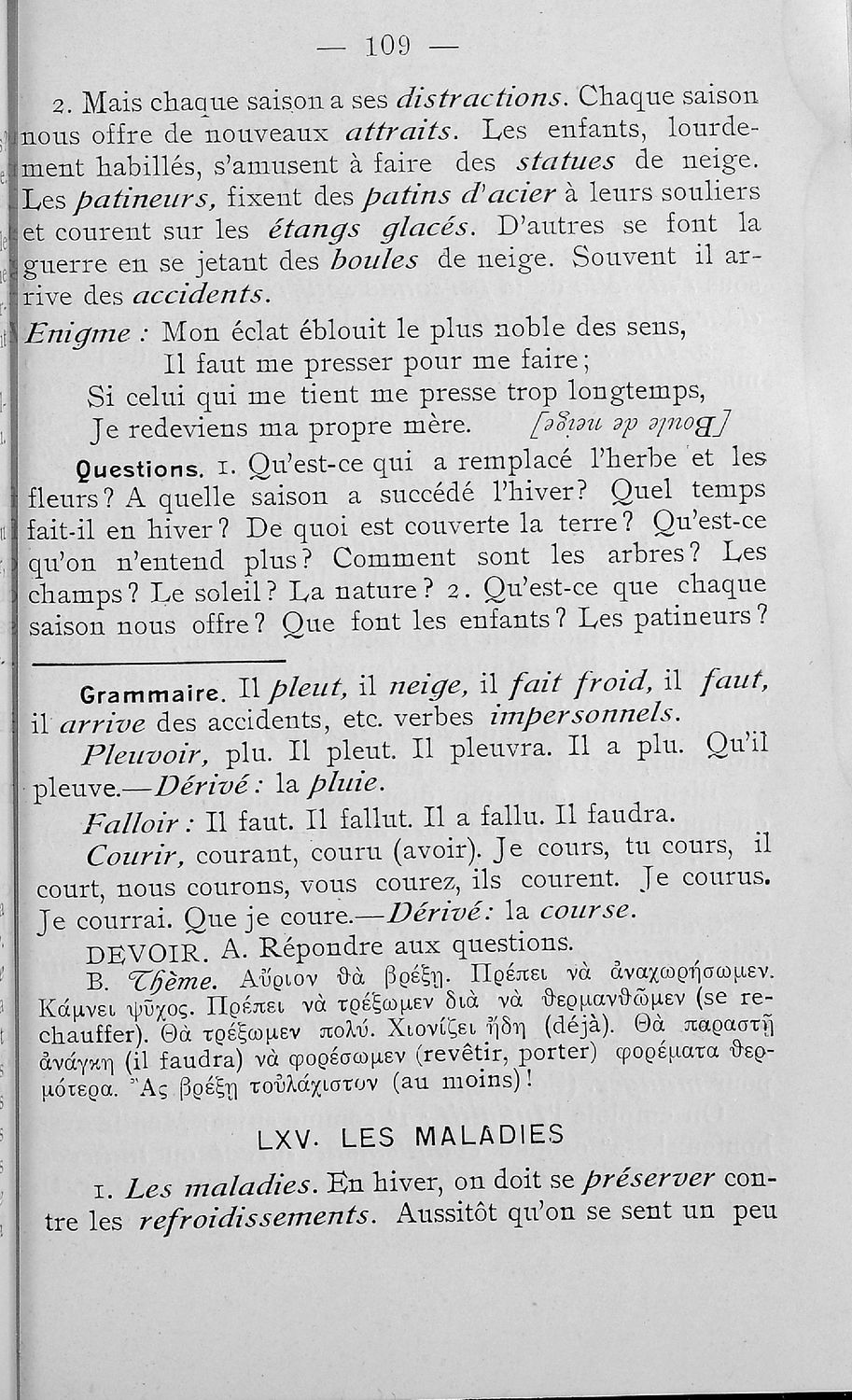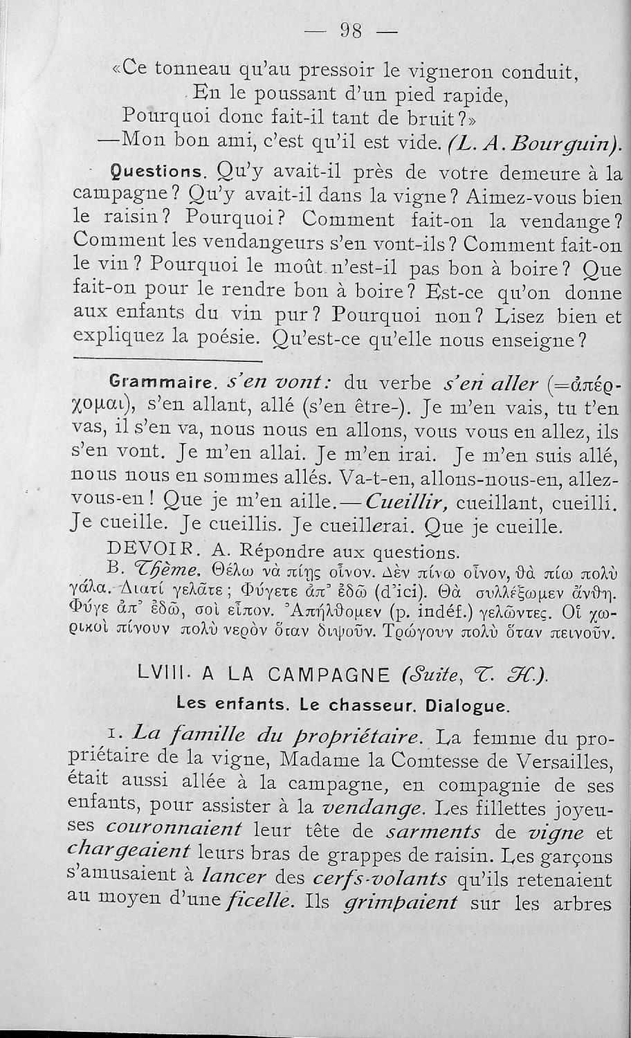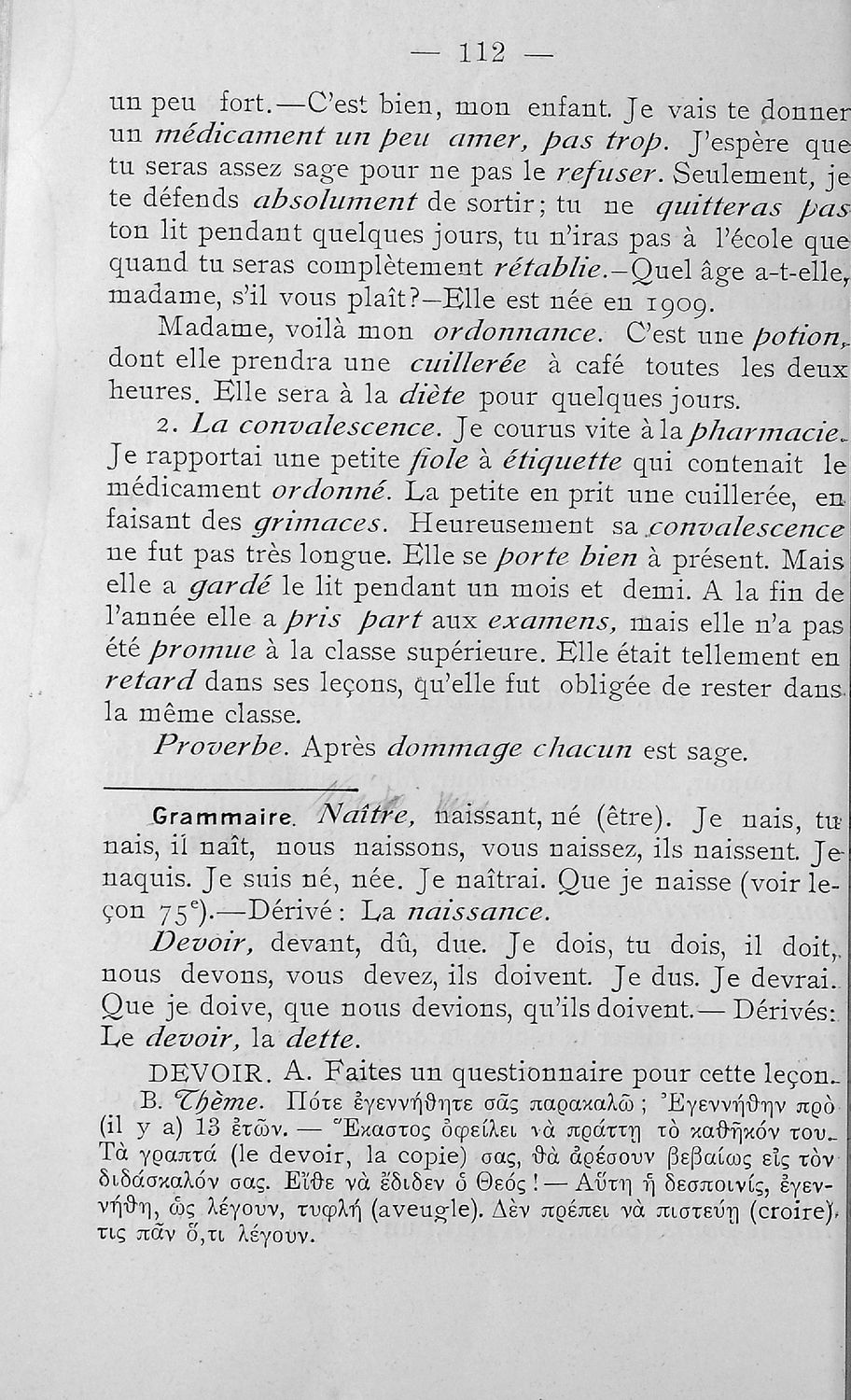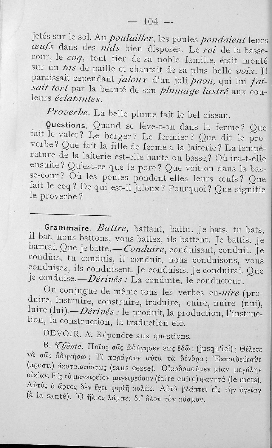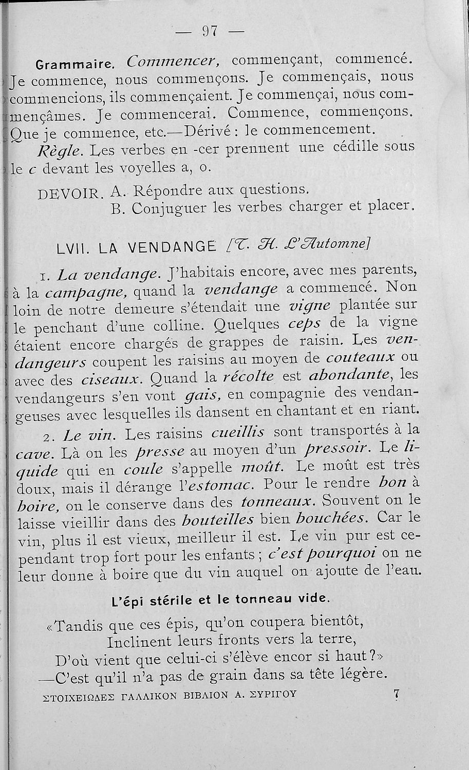 Σχολικό εγχειρίδιο Γαλλικών Β΄ και Γ' Ελληνικού Σχολείου, Αστικού Σχολείου και Παρθεναγωγείου που περιλαμβάνει κείμενα, κανόνες γραμματικής και συντακτικού, ερωτήσεις και ασκήσεις κατανόησης, και λεξιλογικά ...