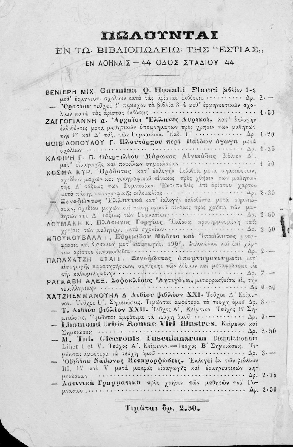 Σχολικό εγχειρίδιο Λατινικών για την Ε΄ Γυμνασίου παλαιού τύπου και την ΣΤ΄ Γυμνασίου νέου τύπου ου περιέχει βιογραφικό σημείωμα των Κικέρωνα και Οβίδιου, εισαγωγικά σχόλια, κείμενο και ερμηνευτικές σημειώσεις.