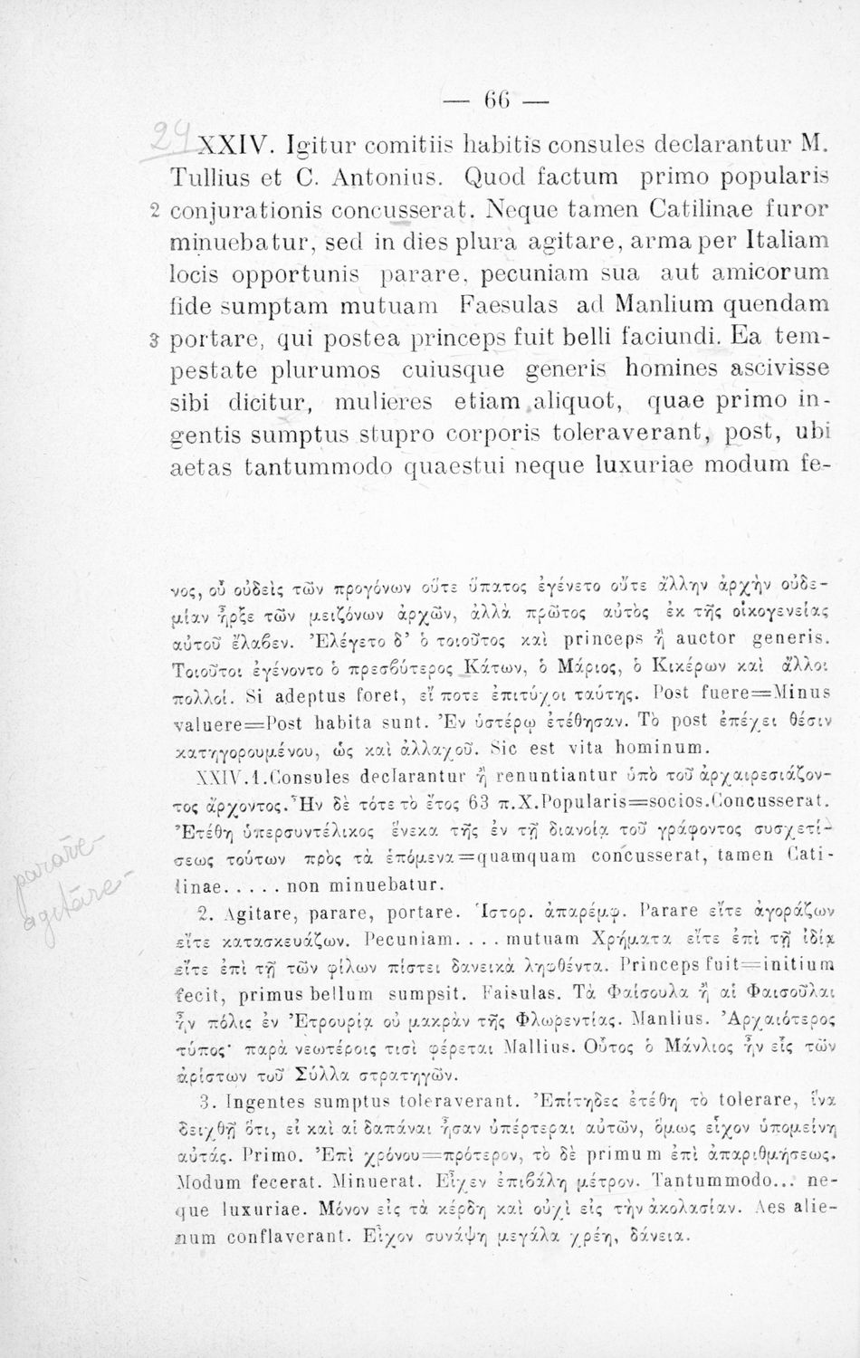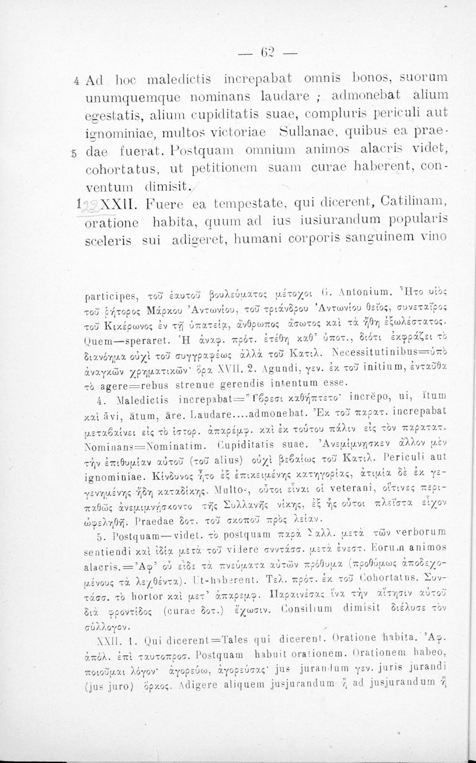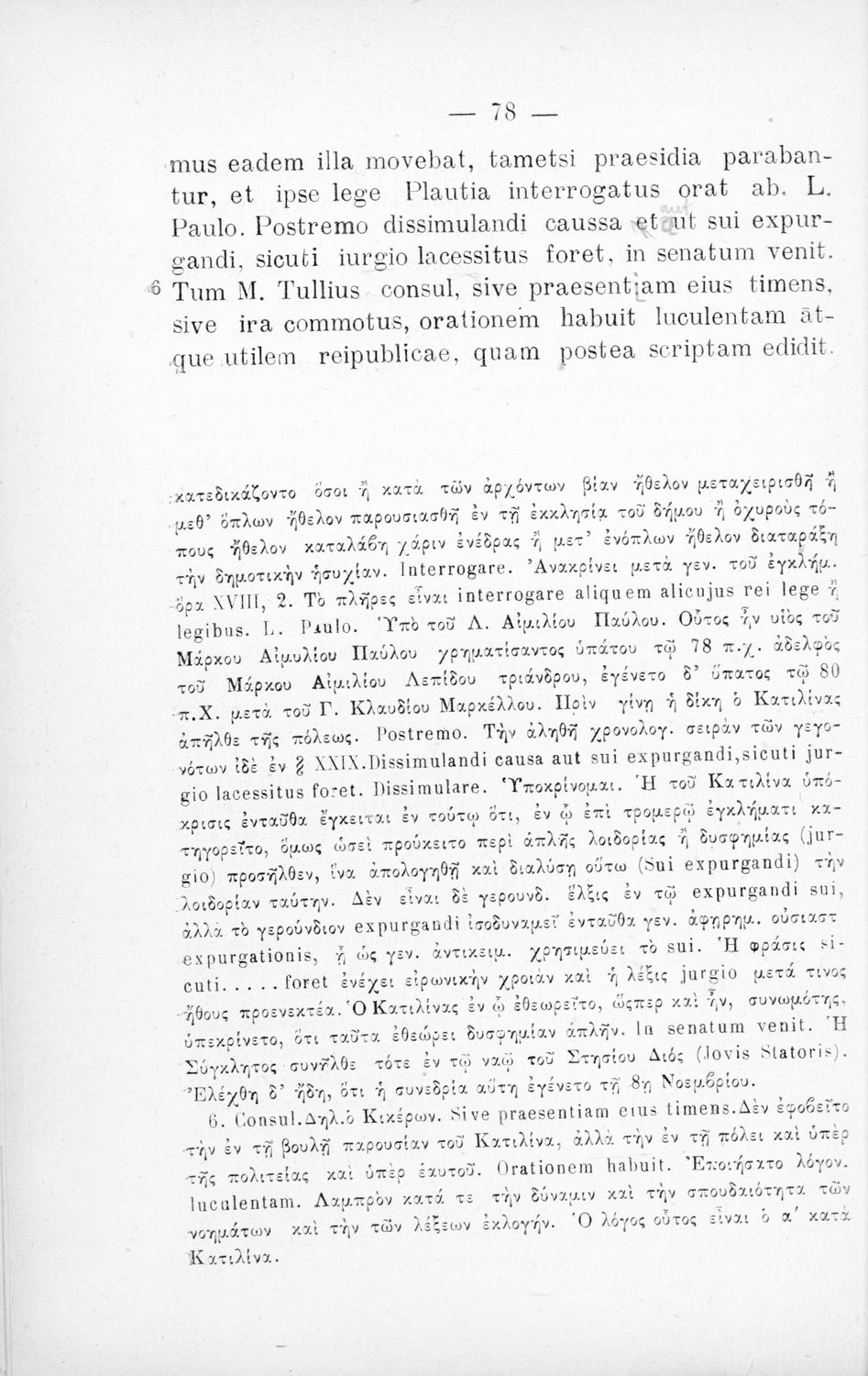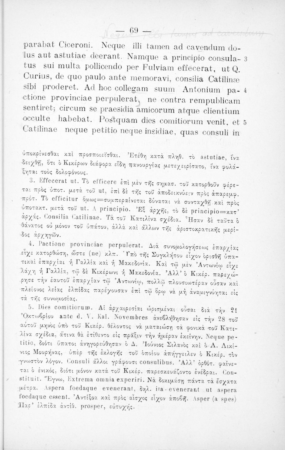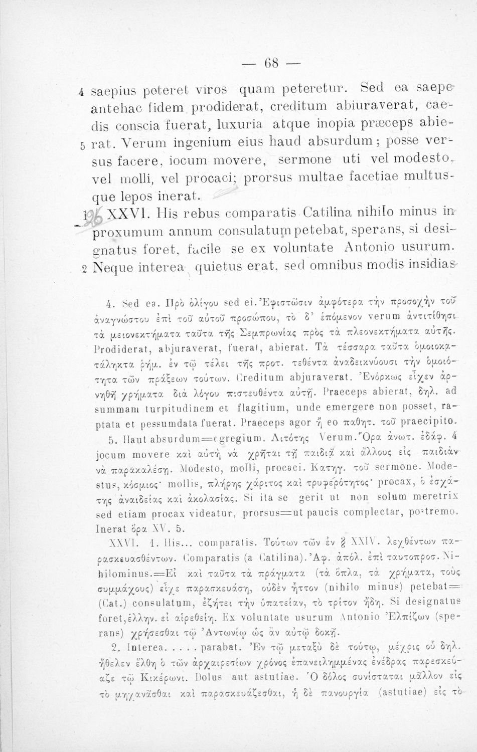 Μαθητικό βοήθημα Λατινικών που περιλαμβάνει μετάφραση του Τρίτου και Τέταρτου κατά Κατιλίνα λόγων και περίληψη της υπόθεσής τους.