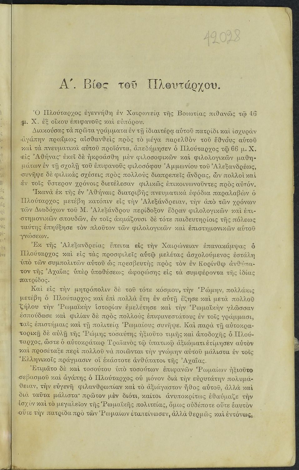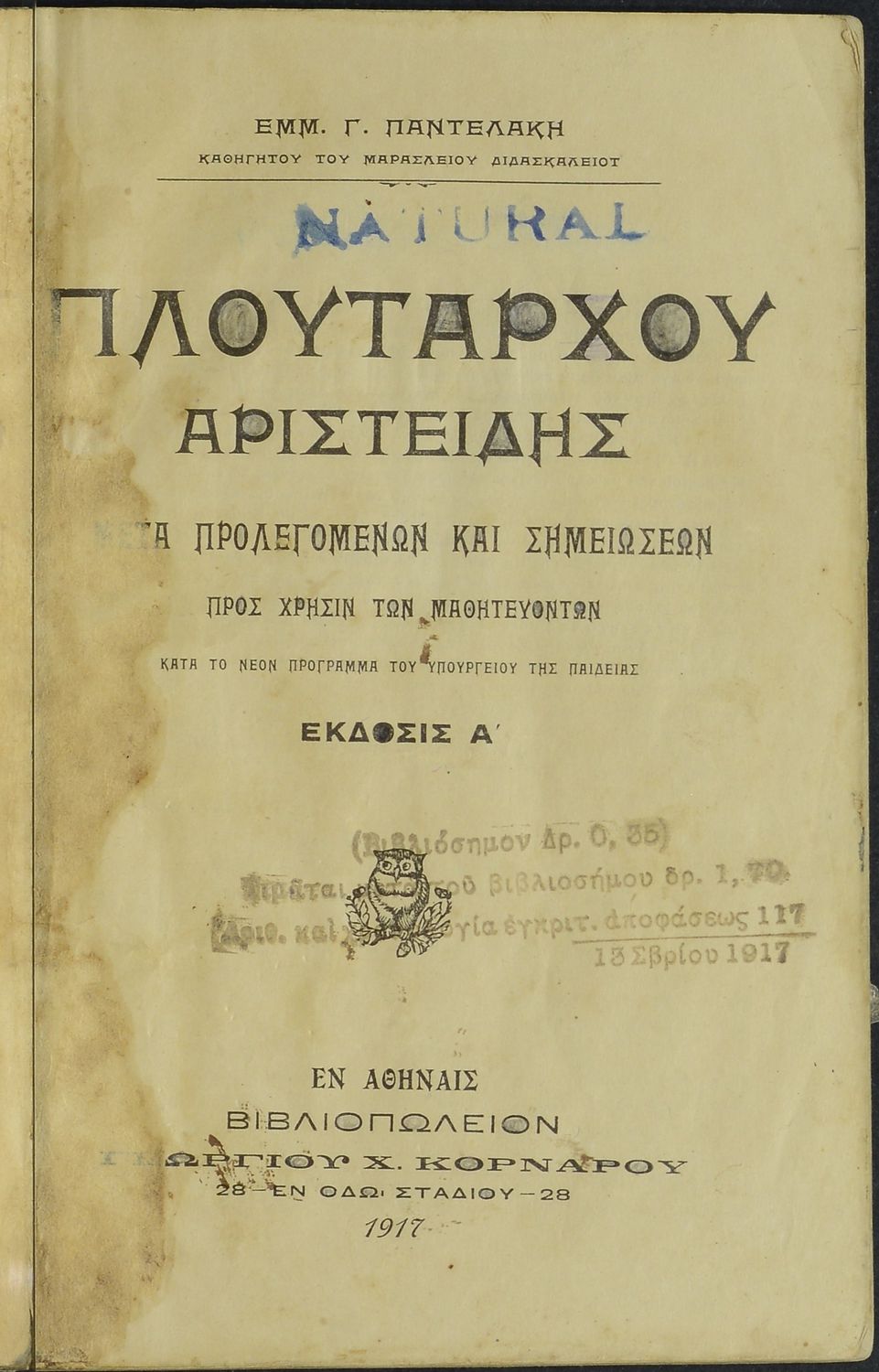 Κωδικός αναγνώρισης: 01-42028 Τίτλος: Πλουτάρχου Αριστείδης. Μετά προλεγομένων και σημειώσεων. Προς χρήσιν των μαθητευόντων Συγγραφέας: Πλούταρχος, Εμμ. Γ. Παντελάκης (σχόλια) Μέγεθος και υπόστρωμα: Σχολικό εγχειρίδιο, μαλακό εξώφυλλο, 71 σελίδες. |