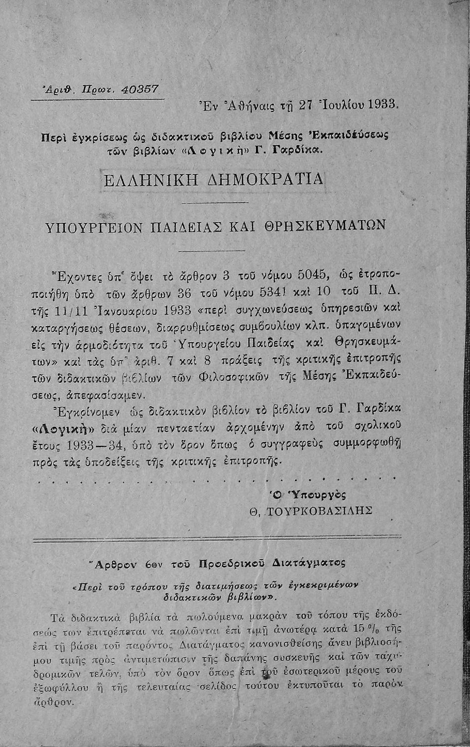 Υπουργική απόφαση / Σύμβαση: 40357/27-7-1933