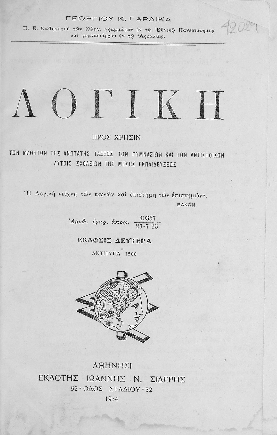 Τίτλος: Λογική προς χρήσιν των μαθητών της ανωτάτης τάξεως των Γυμνασίων και των αντιστοίχων αυτοίς σχολείων της Μέσης Εκπαιδεύσεως