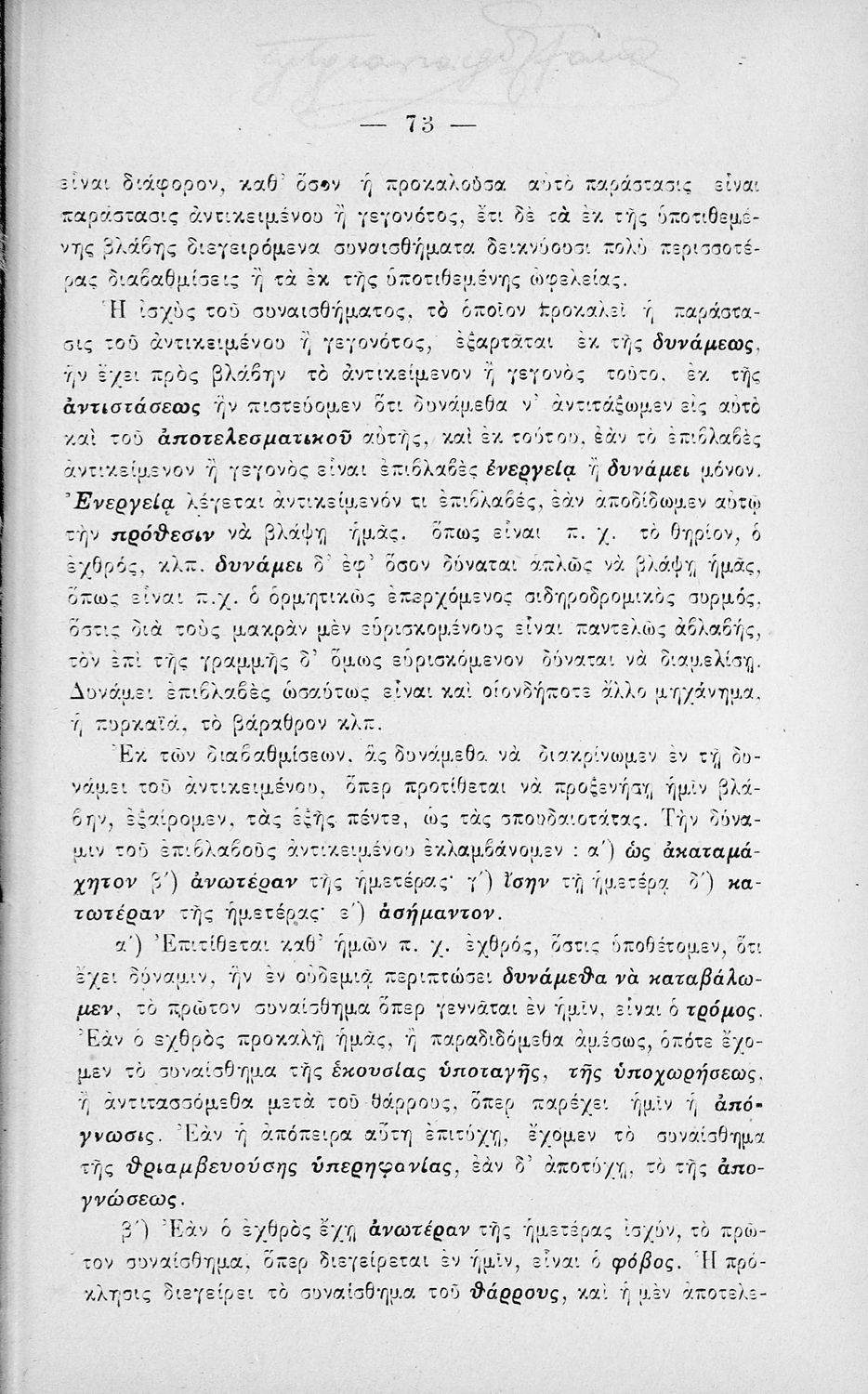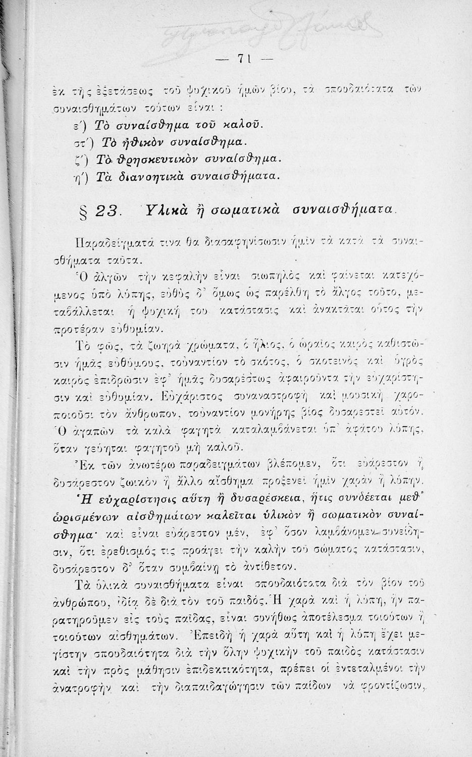 Βαθμίδα εκπαίδευσης: Δευτεροβάθμια Τάξη: Γ' Γυμνασίου Μάθημα: Ψυχολογία Γλώσσα: Καθαρεύουσα Παρουσίαση περιεχομένου: Σχολικό εγχειρίδιο Εμπειρικής Ψυχολογίας για τη Γ΄ Γυμνασίου χωρισμένο σε τρία τμήματα: το γνωστικό, το συναισθηματικό και το βουλητικό. Εξετάζει και τις ανωμαλίες της συνείδησης. |