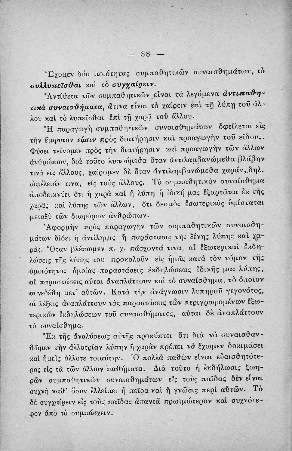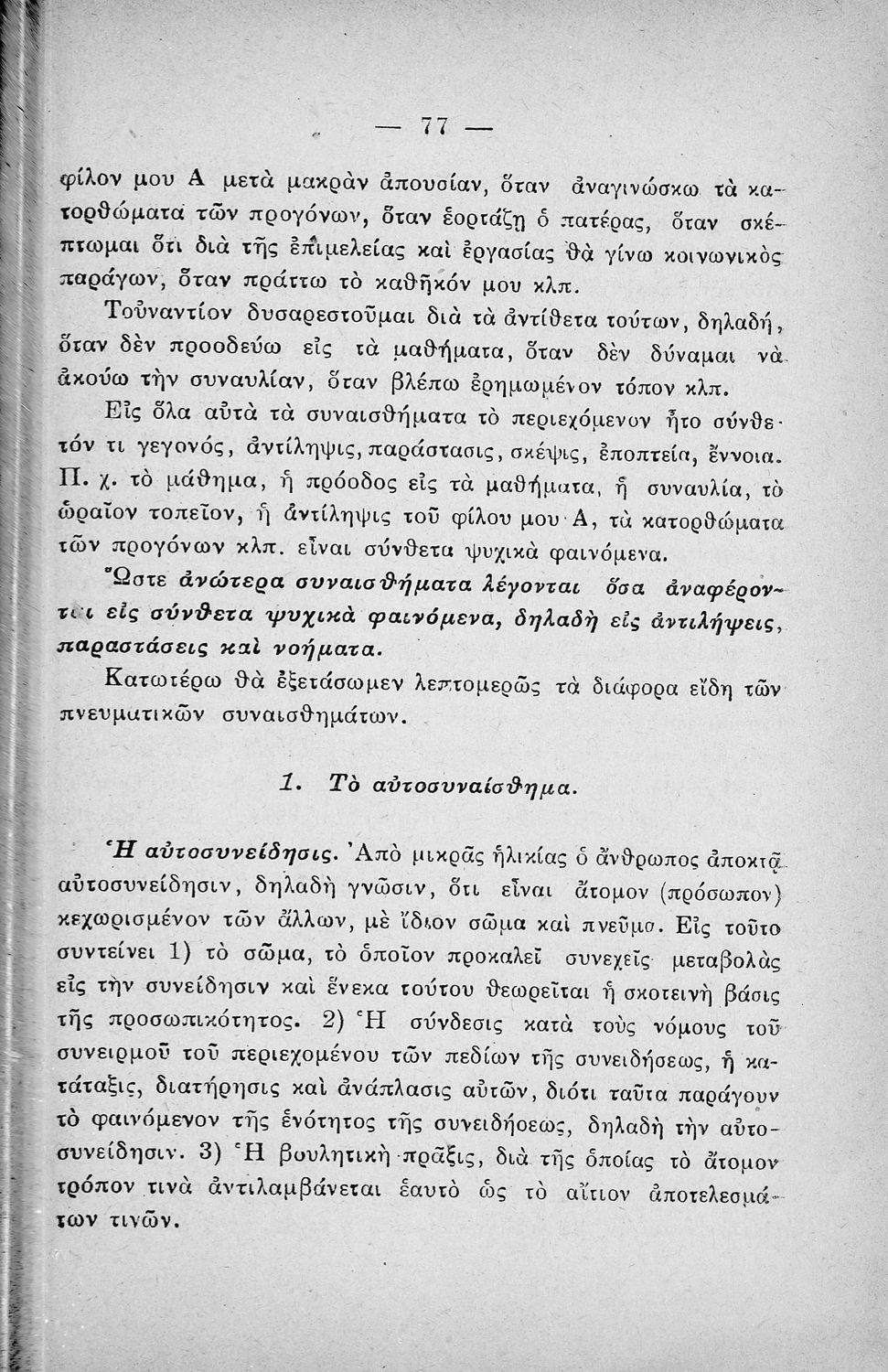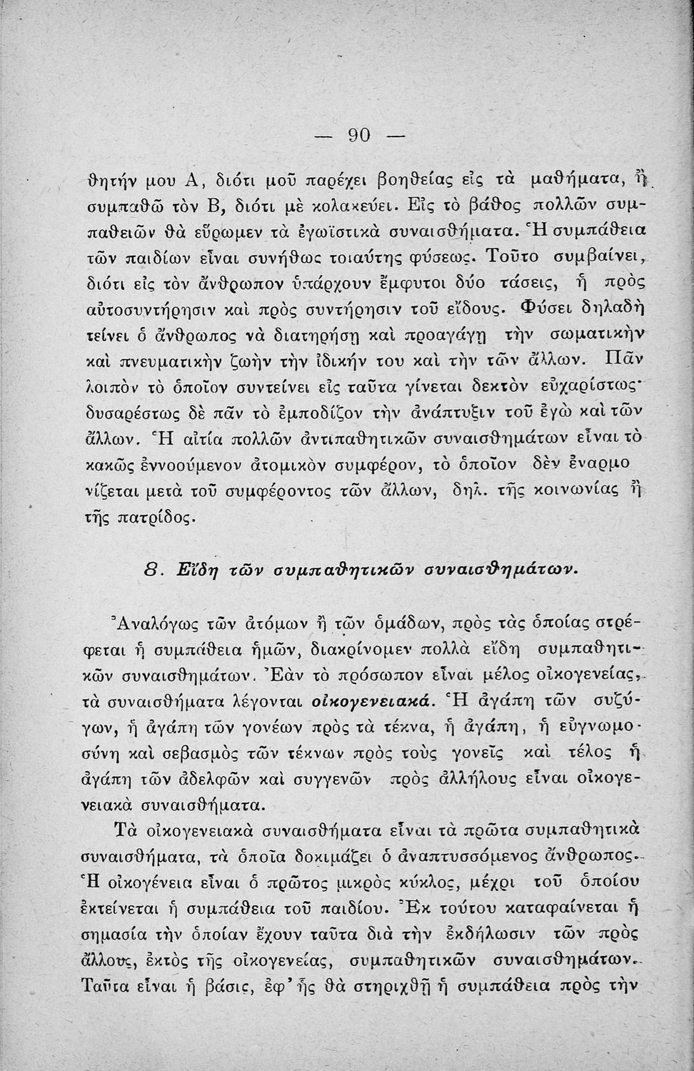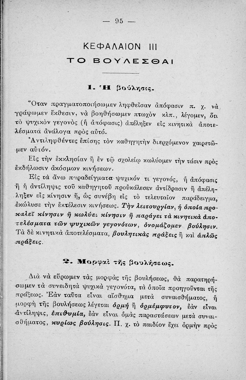 Βαθμίδα εκπαίδευσης: Δευτεροβάθμια Τάξη: Γ' Γυμνασίου Μάθημα: Ψυχολογία Γλώσσα: Απλή καθαρεύουσα Παρουσίαση περιεχομένου: Σχολικό εγχειρίδιο Πειραματικής Ψυχολογίας για τη Γ΄ Γυμνασίου χωρισμένο σε τρία τμήματα: το παριστάναι, το συναισθάνεσθαι, και το βούλεσθαι. |
