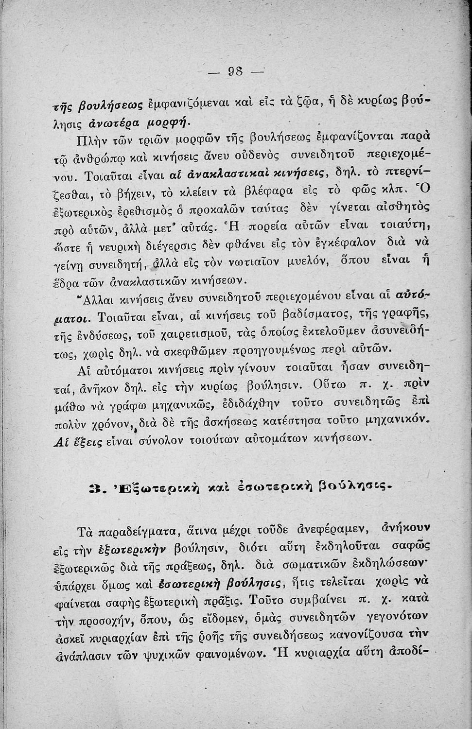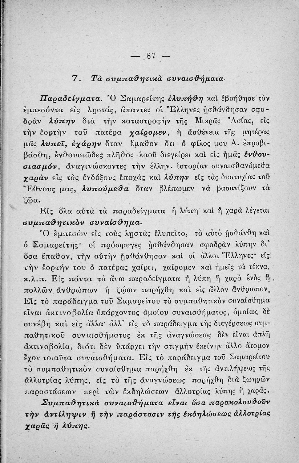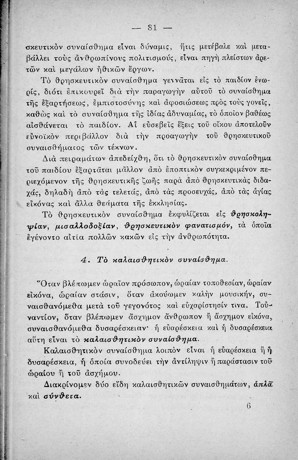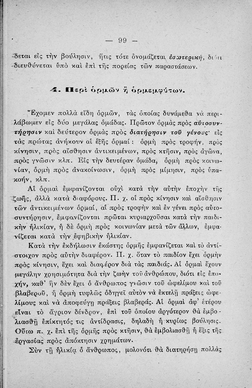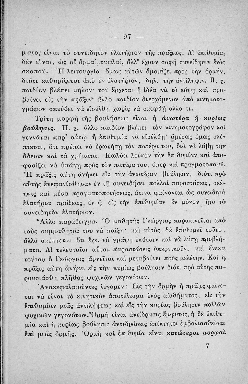 Βαθμίδα εκπαίδευσης: Δευτεροβάθμια Τάξη: Γ' Γυμνασίου Μάθημα: Ψυχολογία Γλώσσα: Απλή καθαρεύουσα Παρουσίαση περιεχομένου: Σχολικό εγχειρίδιο Πειραματικής Ψυχολογίας για τη Γ΄ Γυμνασίου χωρισμένο σε τρία τμήματα: το παριστάναι, το συναισθάνεσθαι, και το βούλεσθαι. |