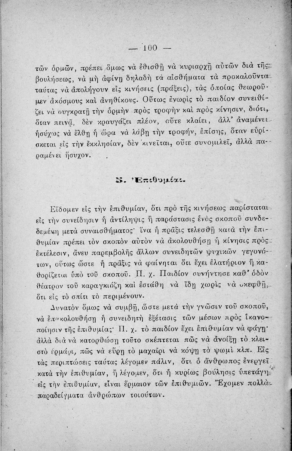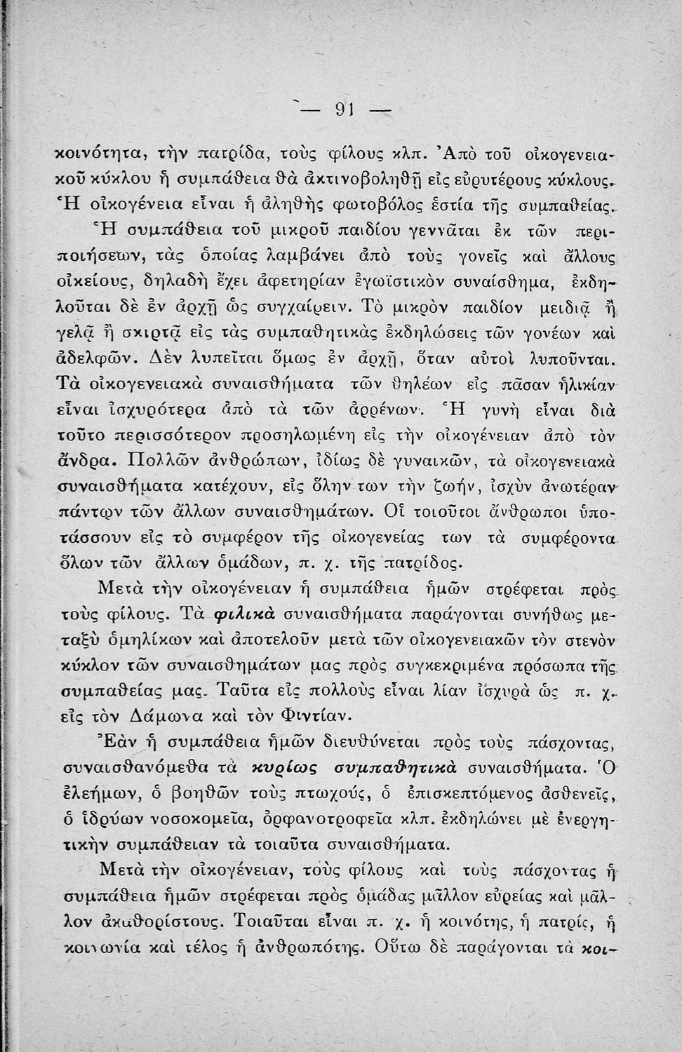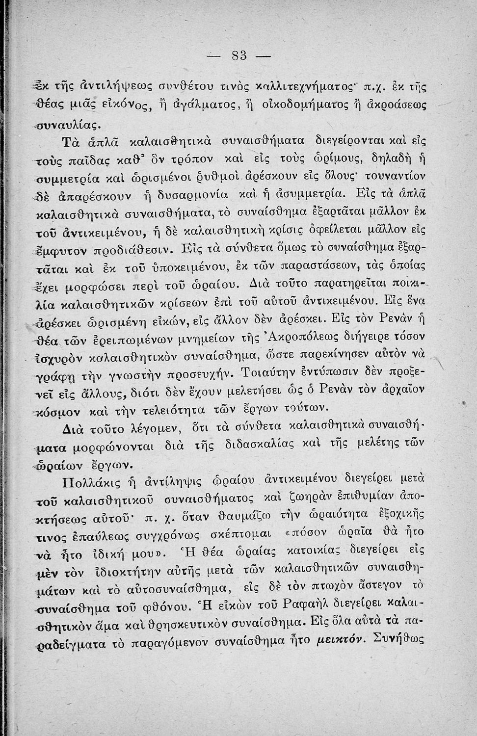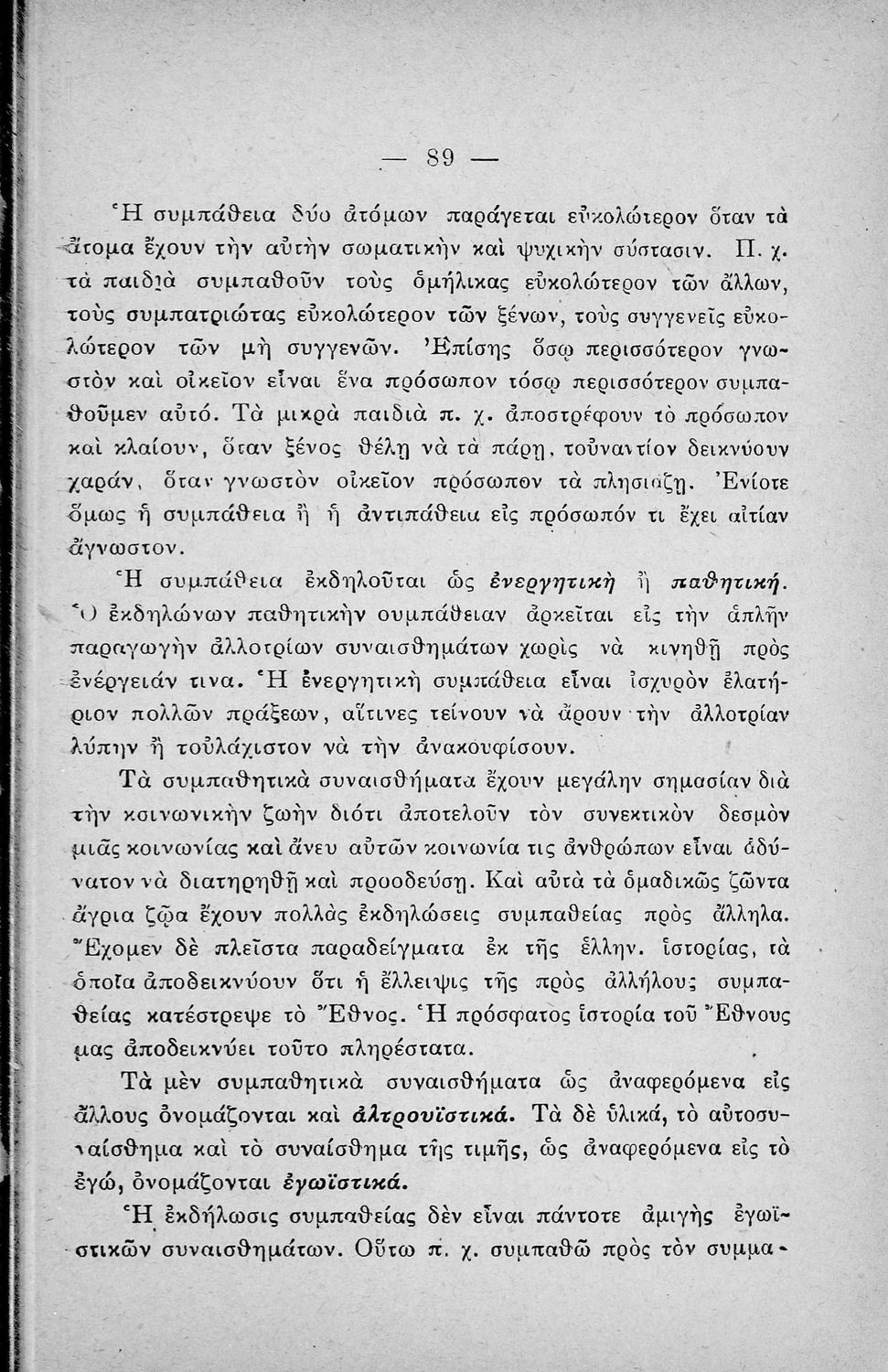 Βαθμίδα εκπαίδευσης: Δευτεροβάθμια Τάξη: Γ' Γυμνασίου Μάθημα: Ψυχολογία Γλώσσα: Απλή καθαρεύουσα Παρουσίαση περιεχομένου: Σχολικό εγχειρίδιο Πειραματικής Ψυχολογίας για τη Γ΄ Γυμνασίου χωρισμένο σε τρία τμήματα: το παριστάναι, το συναισθάνεσθαι, και το βούλεσθαι. |