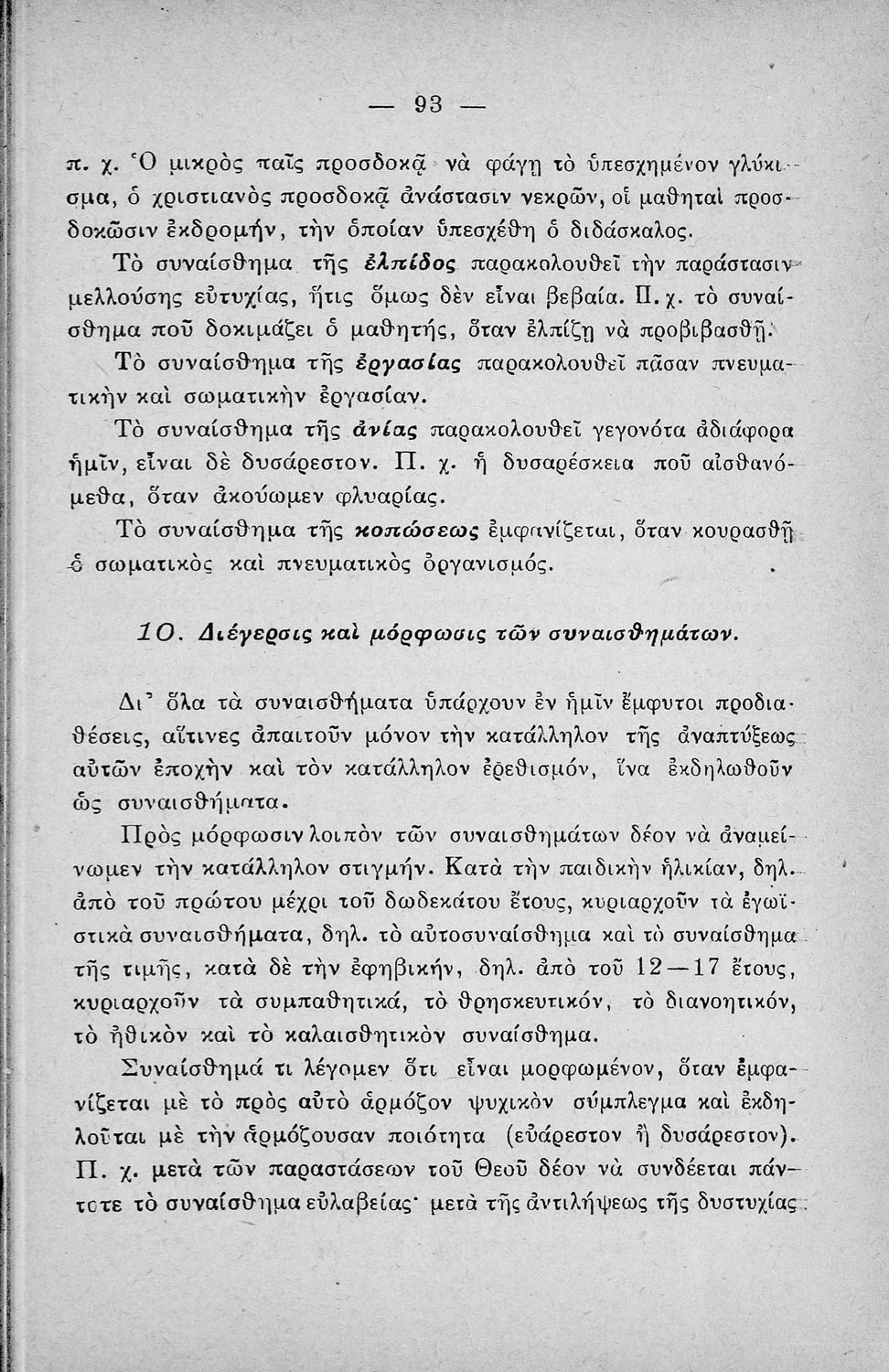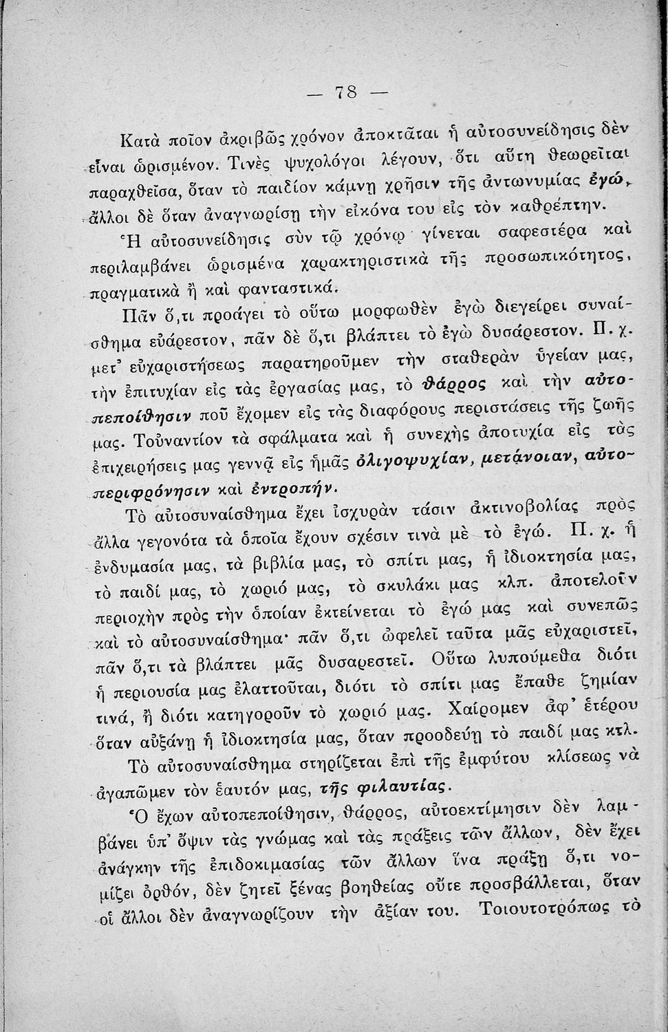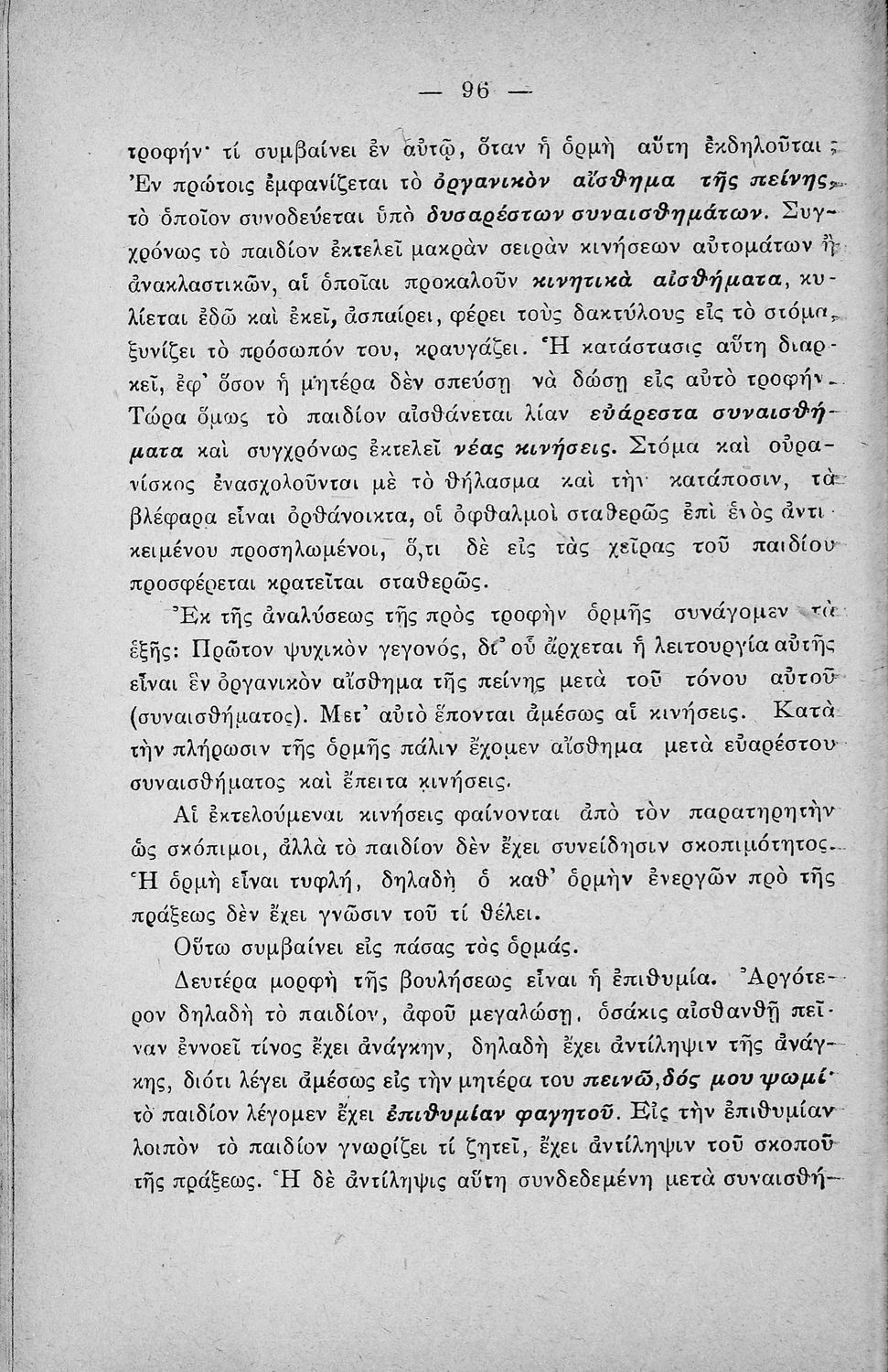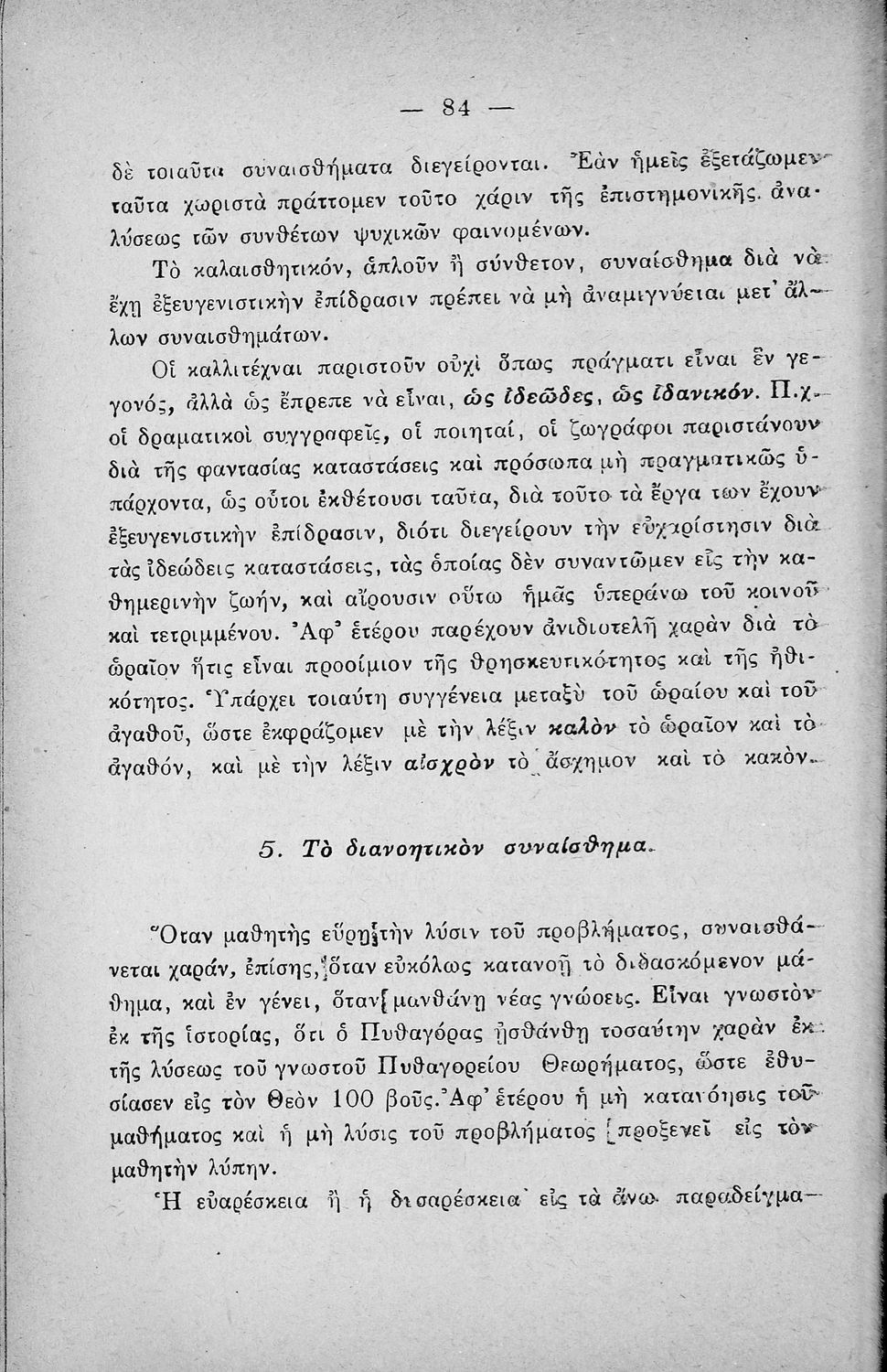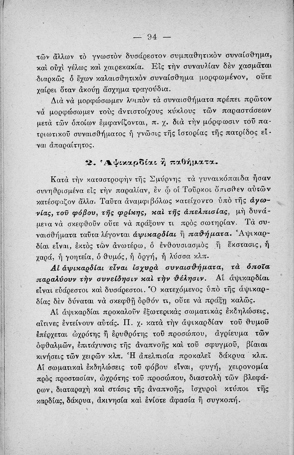 Βαθμίδα εκπαίδευσης: Δευτεροβάθμια Τάξη: Γ' Γυμνασίου Μάθημα: Ψυχολογία Γλώσσα: Απλή καθαρεύουσα Παρουσίαση περιεχομένου: Σχολικό εγχειρίδιο Πειραματικής Ψυχολογίας για τη Γ΄ Γυμνασίου χωρισμένο σε τρία τμήματα: το παριστάναι, το συναισθάνεσθαι, και το βούλεσθαι. |
