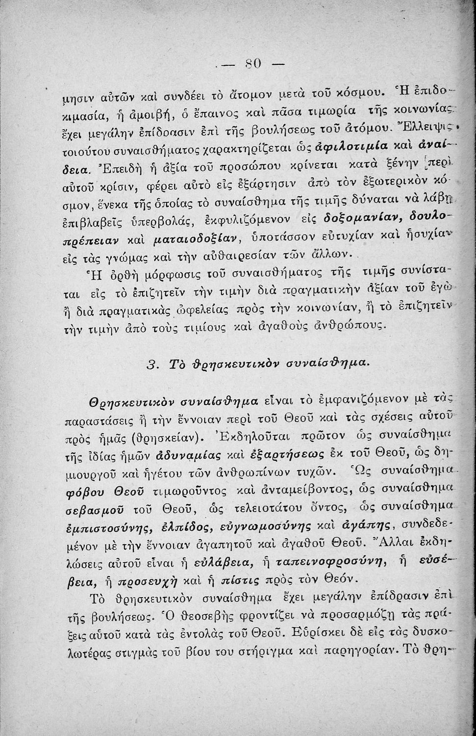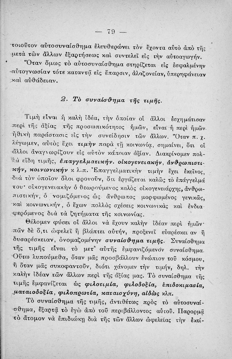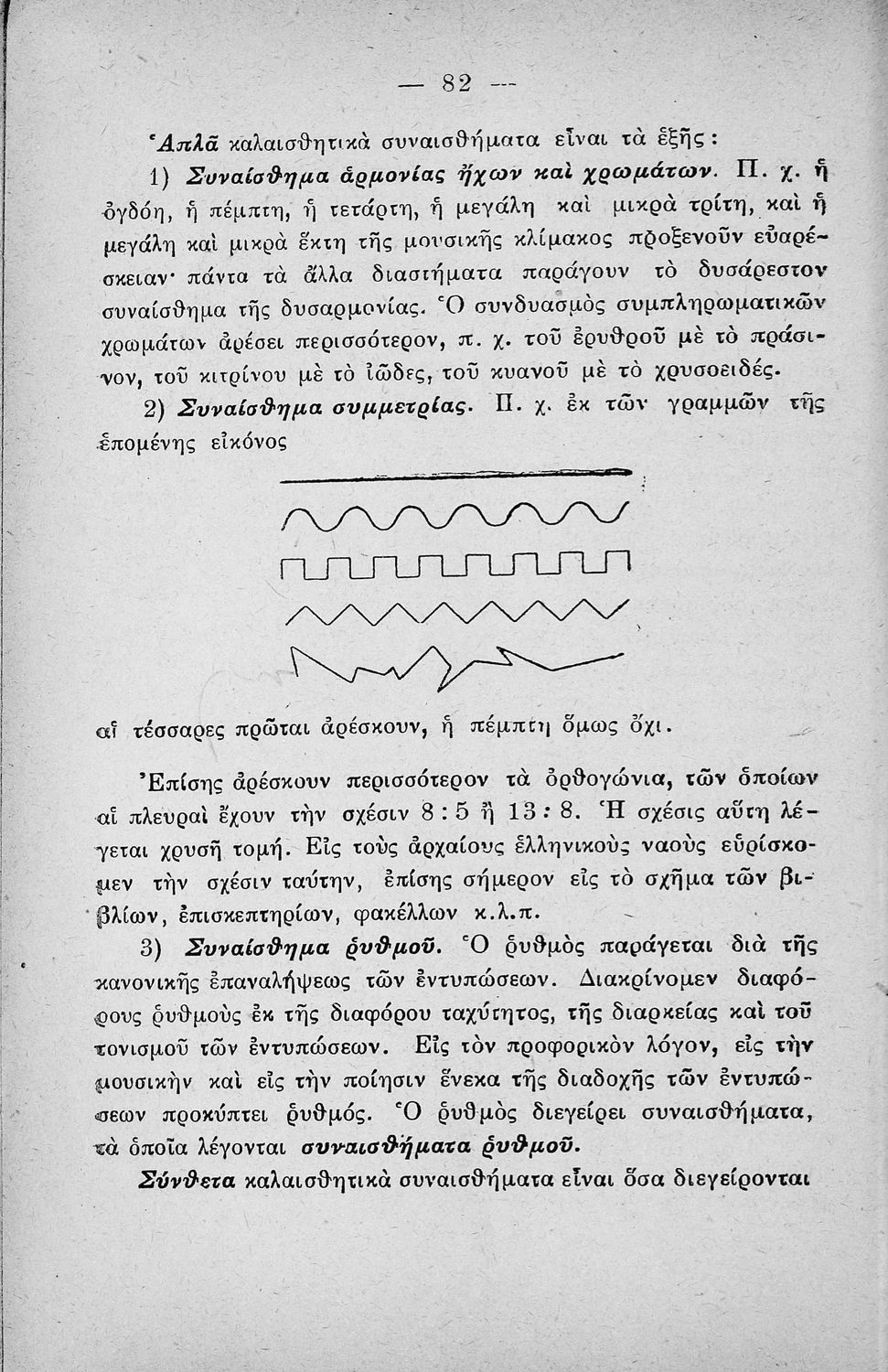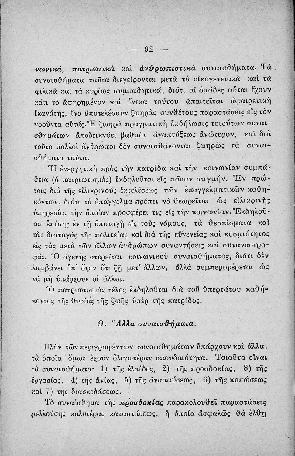 Βαθμίδα εκπαίδευσης: Δευτεροβάθμια Τάξη: Γ' Γυμνασίου Μάθημα: Ψυχολογία Γλώσσα: Απλή καθαρεύουσα Παρουσίαση περιεχομένου: Σχολικό εγχειρίδιο Πειραματικής Ψυχολογίας για τη Γ΄ Γυμνασίου χωρισμένο σε τρία τμήματα: το παριστάναι, το συναισθάνεσθαι, και το βούλεσθαι. |