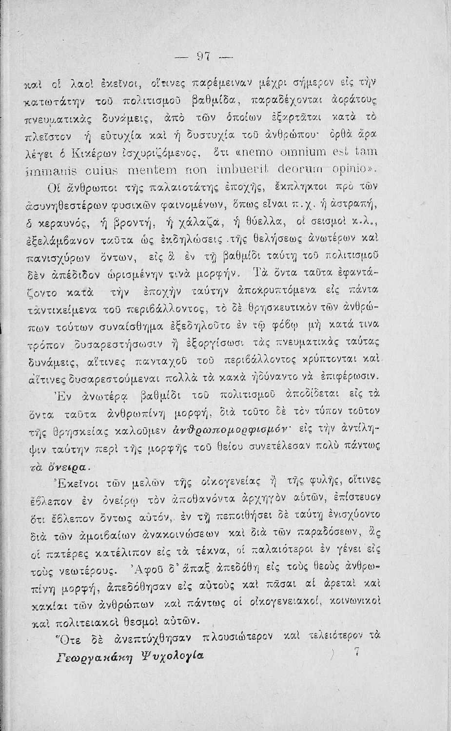 Βαθμίδα εκπαίδευσης: Δευτεροβάθμια Τάξη: Γ' Γυμνασίου Μάθημα: Ψυχολογία Γλώσσα: Καθαρεύουσα Παρουσίαση περιεχομένου: Σχολικό εγχειρίδιο Εμπειρικής Ψυχολογίας για τη Γ΄ Γυμνασίου χωρισμένο σε τρία τμήματα: το γνωστικό, το συναισθηματικό και το βουλητικό. Εξετάζει και τις ανωμαλίες της συνείδησης. |