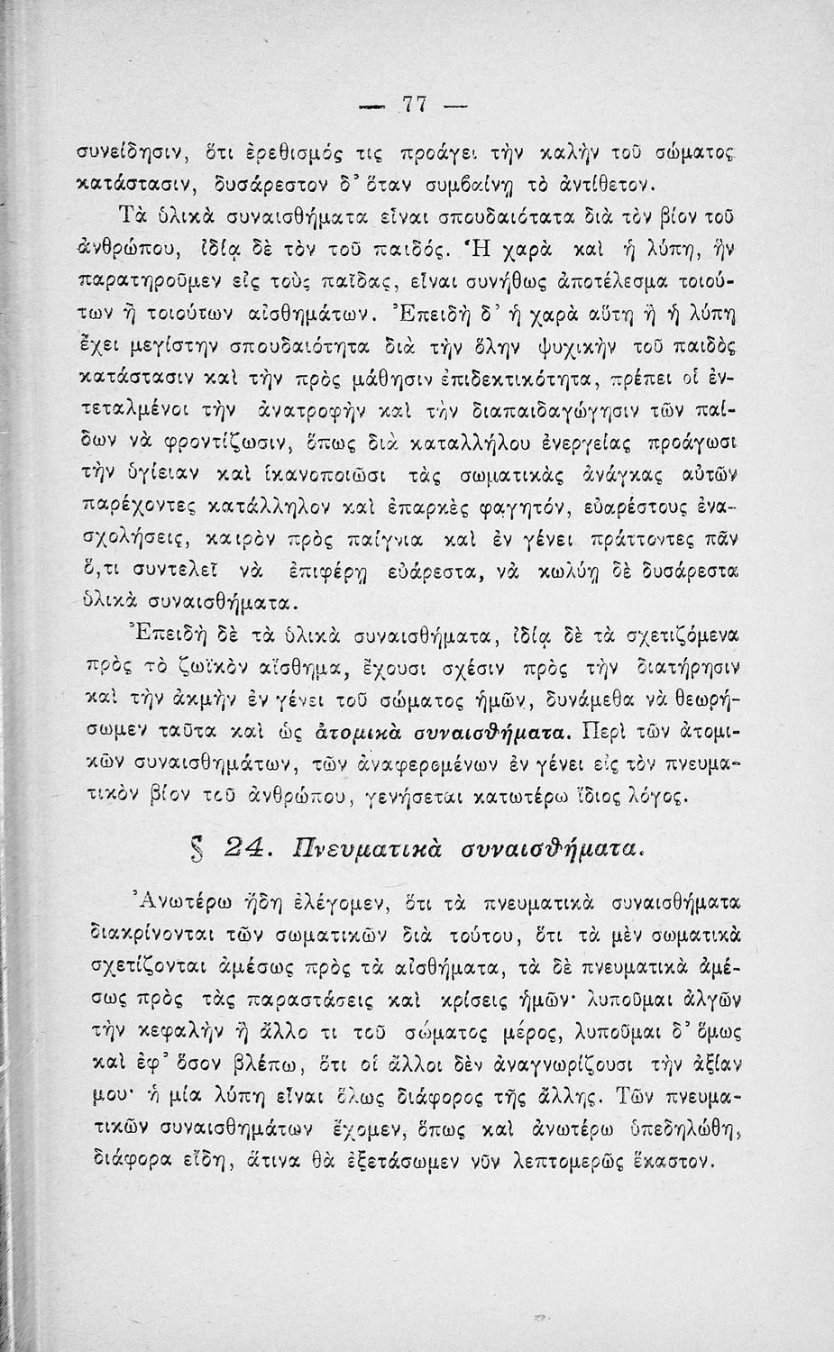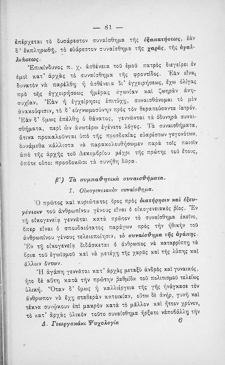 Βαθμίδα εκπαίδευσης: Δευτεροβάθμια Τάξη: Γ' Γυμνασίου Μάθημα: Ψυχολογία Γλώσσα: Καθαρεύουσα Παρουσίαση περιεχομένου: Σχολικό εγχειρίδιο Εμπειρικής Ψυχολογίας για τη Γ΄ Γυμνασίου χωρισμένο σε τρία τμήματα: το γνωστικό, το συναισθηματικό και το βουλητικό. Εξετάζει και τις ανωμαλίες της συνείδησης. |