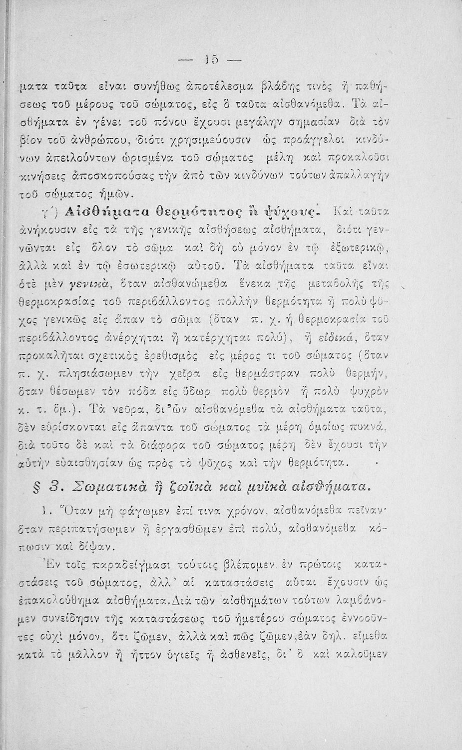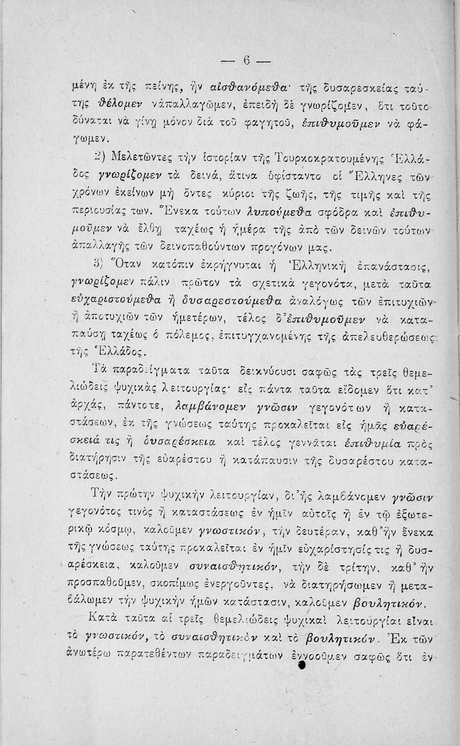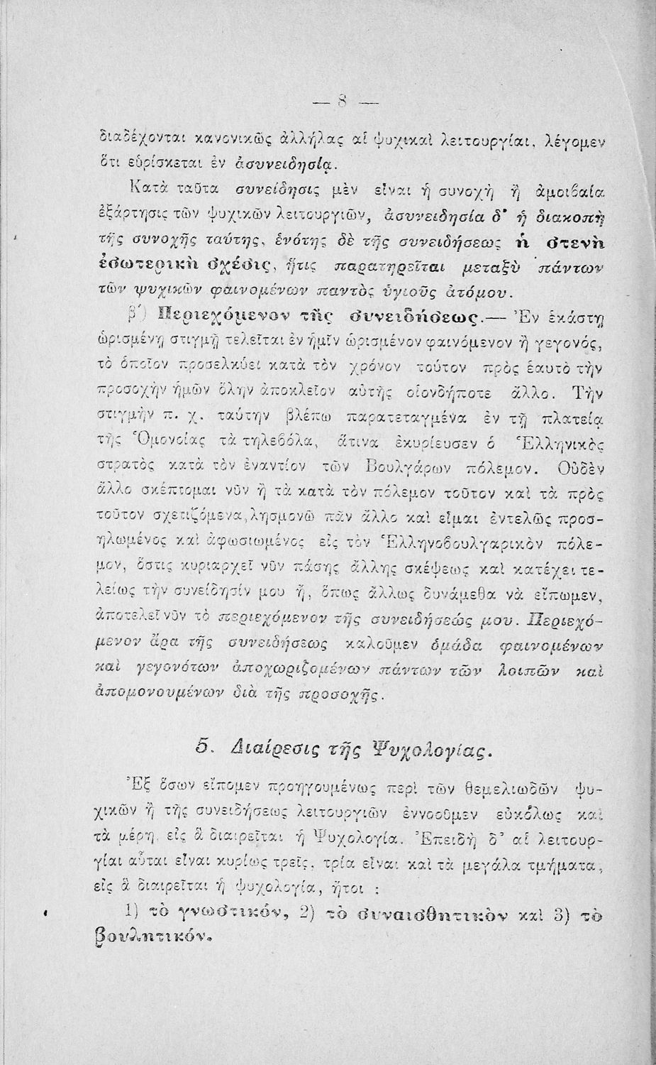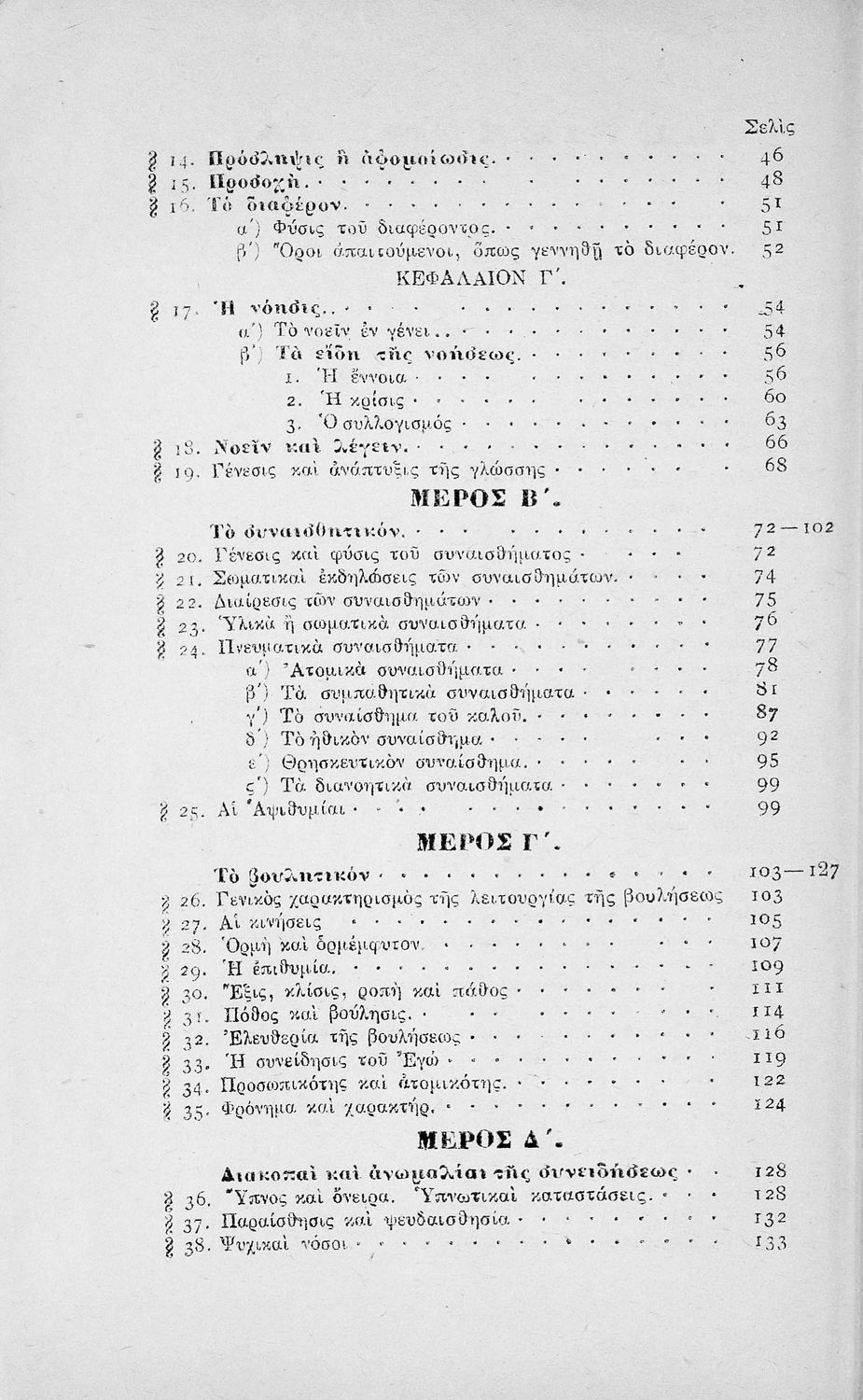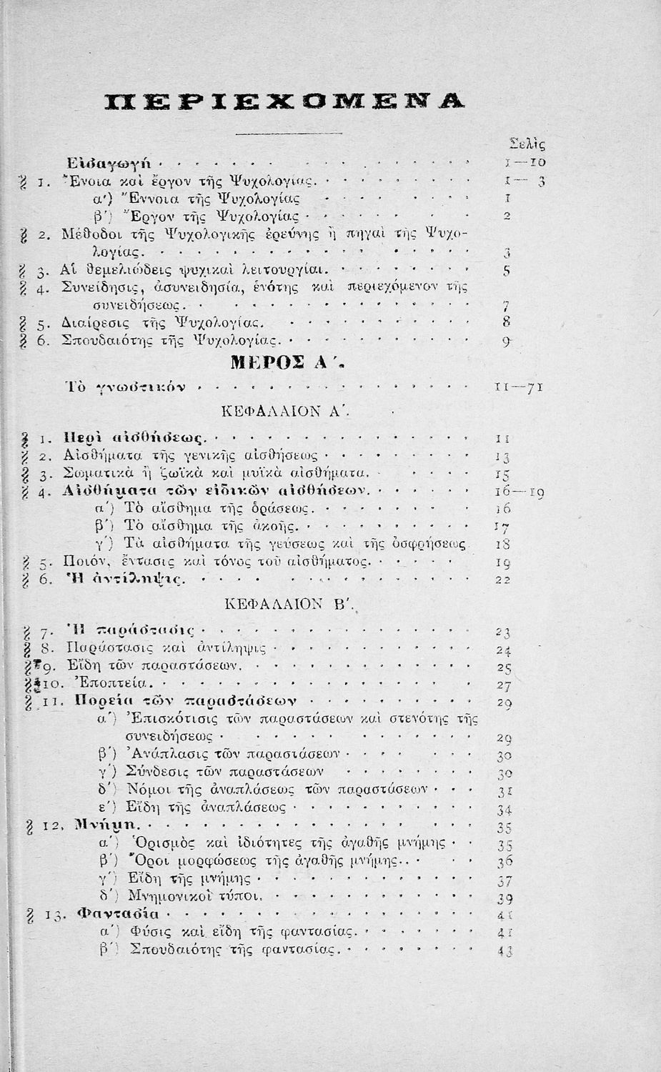 Σχολικό εγχειρίδιο Πειραματικής Ψυχολογίας για τη Γ΄ Γυμνασίου χωρισμένο σε τρία τμήματα: το παριστάναι, το συναισθάνεσθαι, και το βούλεσθαι.