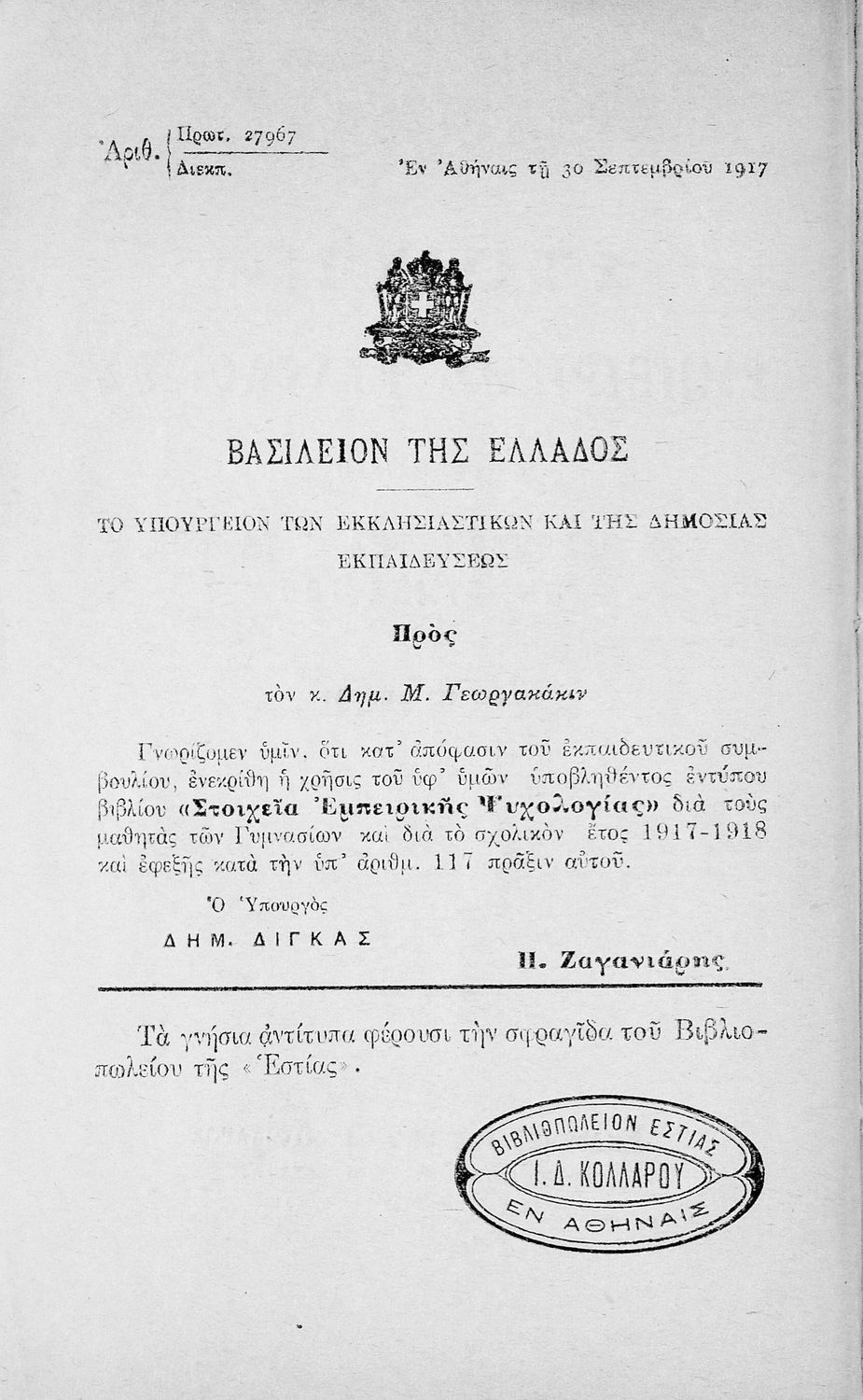 Τίτλος: Στοιχεία εμπειρικής ψυχολογίας προς χρήσιν των μαθητών της Γ΄ τάξεως των Γυμνασίων