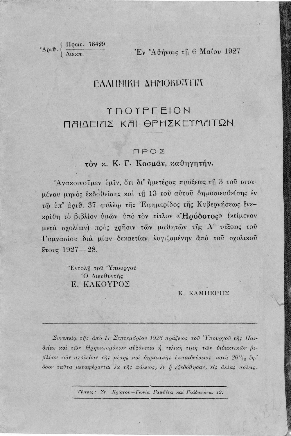 Εκδότης: Ιωάννης Δ. Κολλάρος και ΣΙΑ, Βιβλιοπωλείο της "Εστίας" Έτος έκδοσης: 1927 Τόπος έκδοσης: Αθήνα Έκδοση: 11η Υπουργική απόφαση / Σύμβαση: 18429/6-5-1927 Έτος έγκρισης: 1927 |