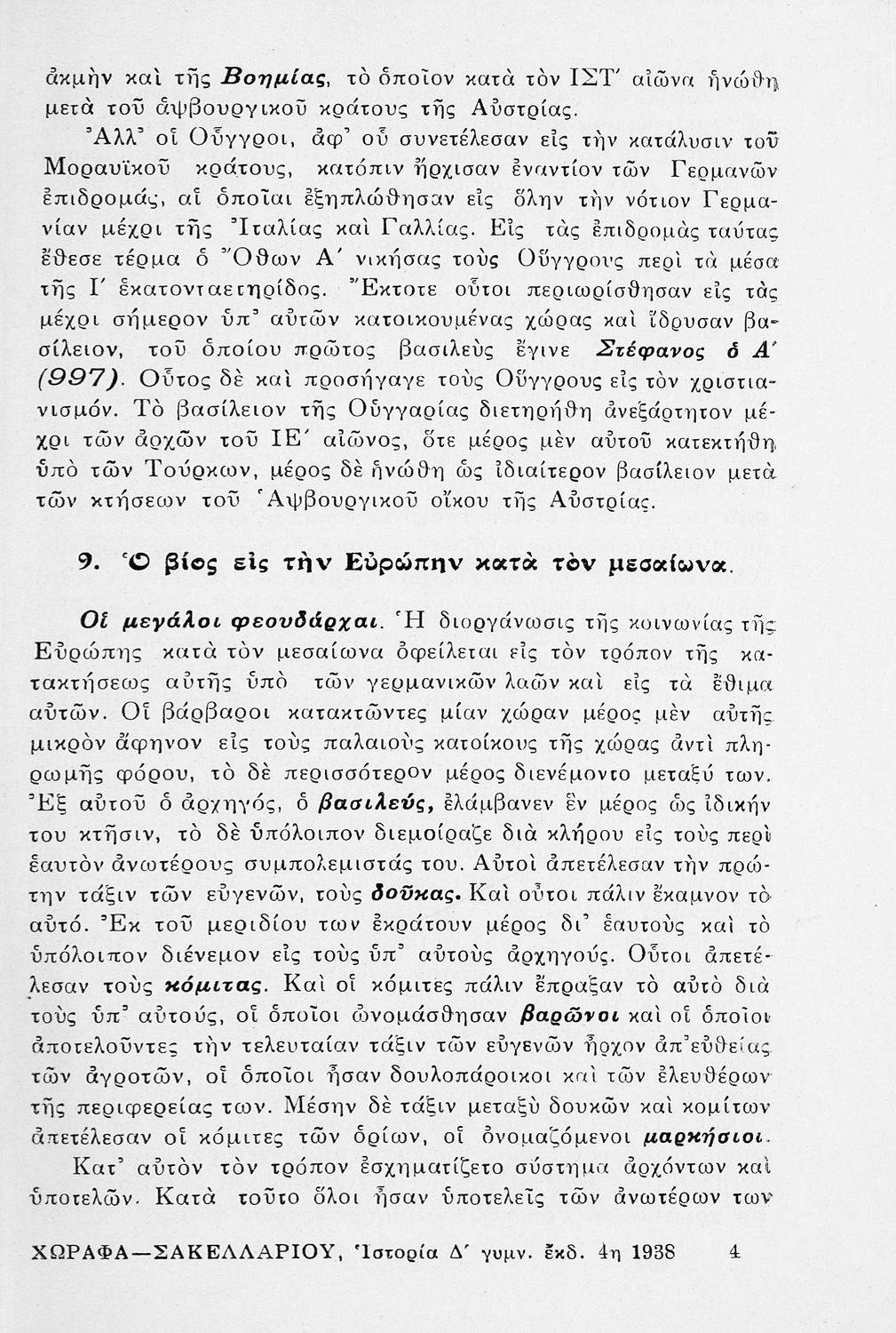 Σχολικό εγχειρίδιο Ιστορίας Δ΄ Γυμνασίου που καλύπτει την περίοδο από τη βασιλεία του Βασίλειου του Α΄ του Μακεδόνα ως την άλωση της Κωνσταντινούπολης από τους Οθωμανούς. Περιέχει και εκτενή αναφορά στην μεσαιωνική ιστορία της Ευρώπης.