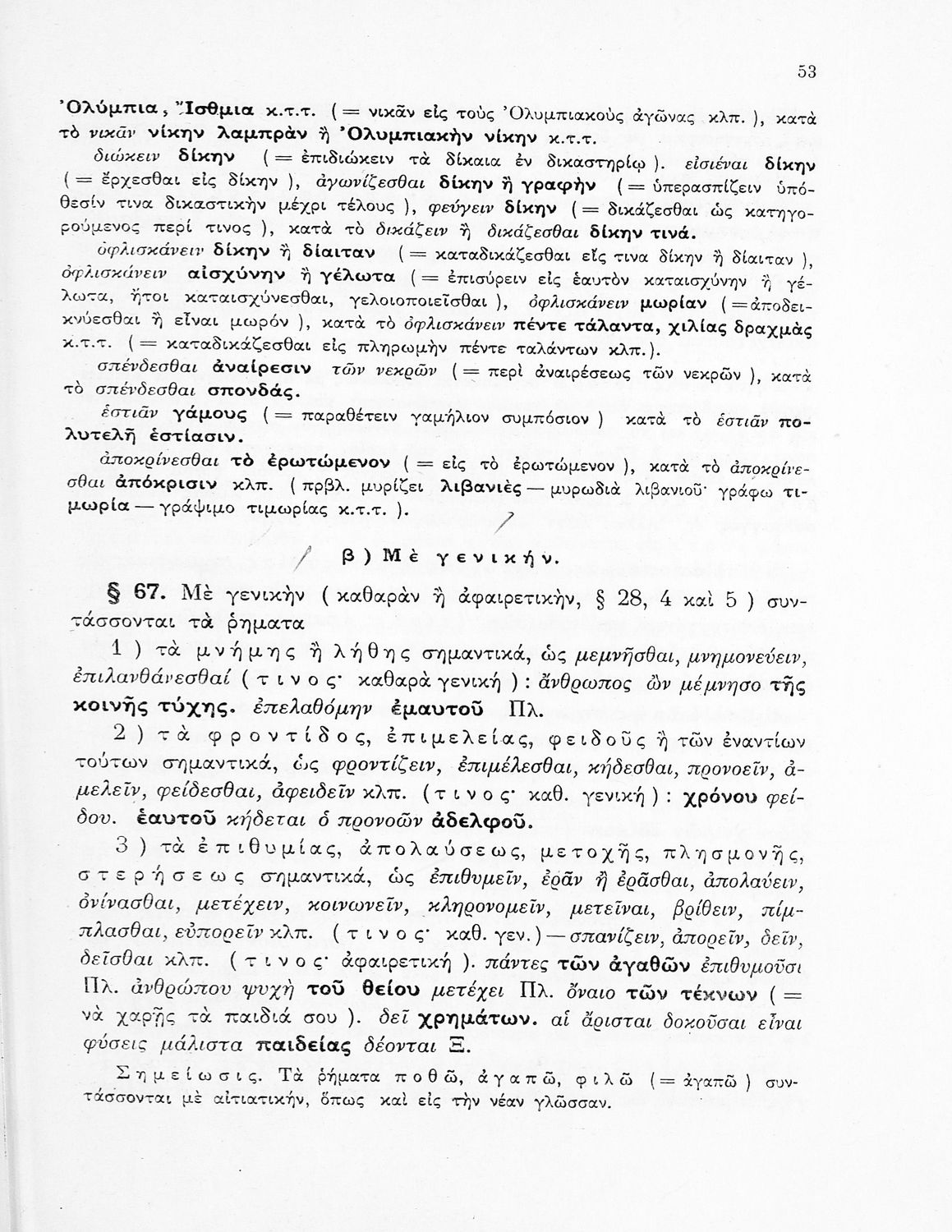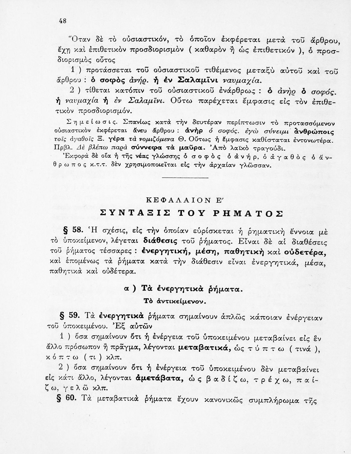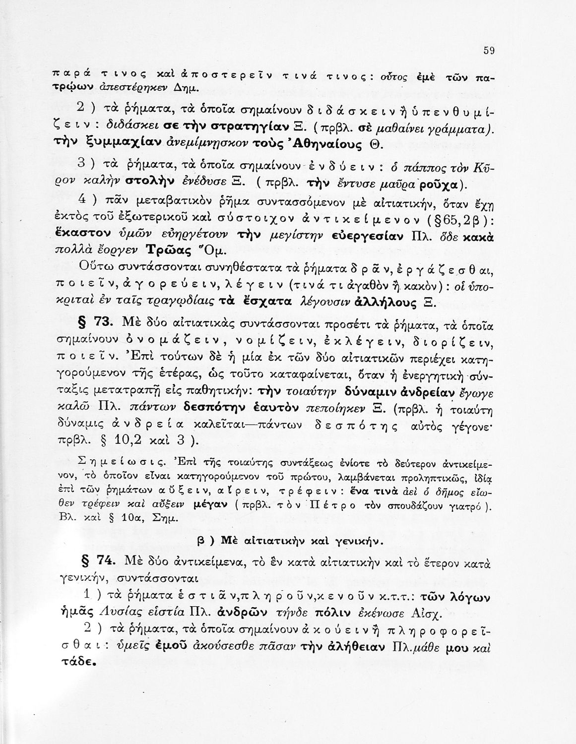 Βαθμίδα εκπαίδευσης: Δευτεροβάθμια Μάθημα: Αρχαία Ελληνικά Γλώσσα: Καθαρεύουσα Παρουσίαση περιεχομένου: Σχολικό εγχειρίδιο Αρχαίων Ελληνικών Γυμνασίου που εξετάζει τα μέρη του λόγου και την σύνταξή τους. |