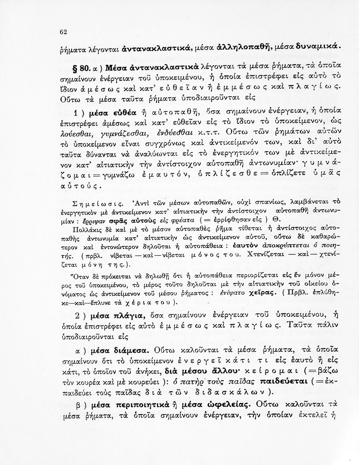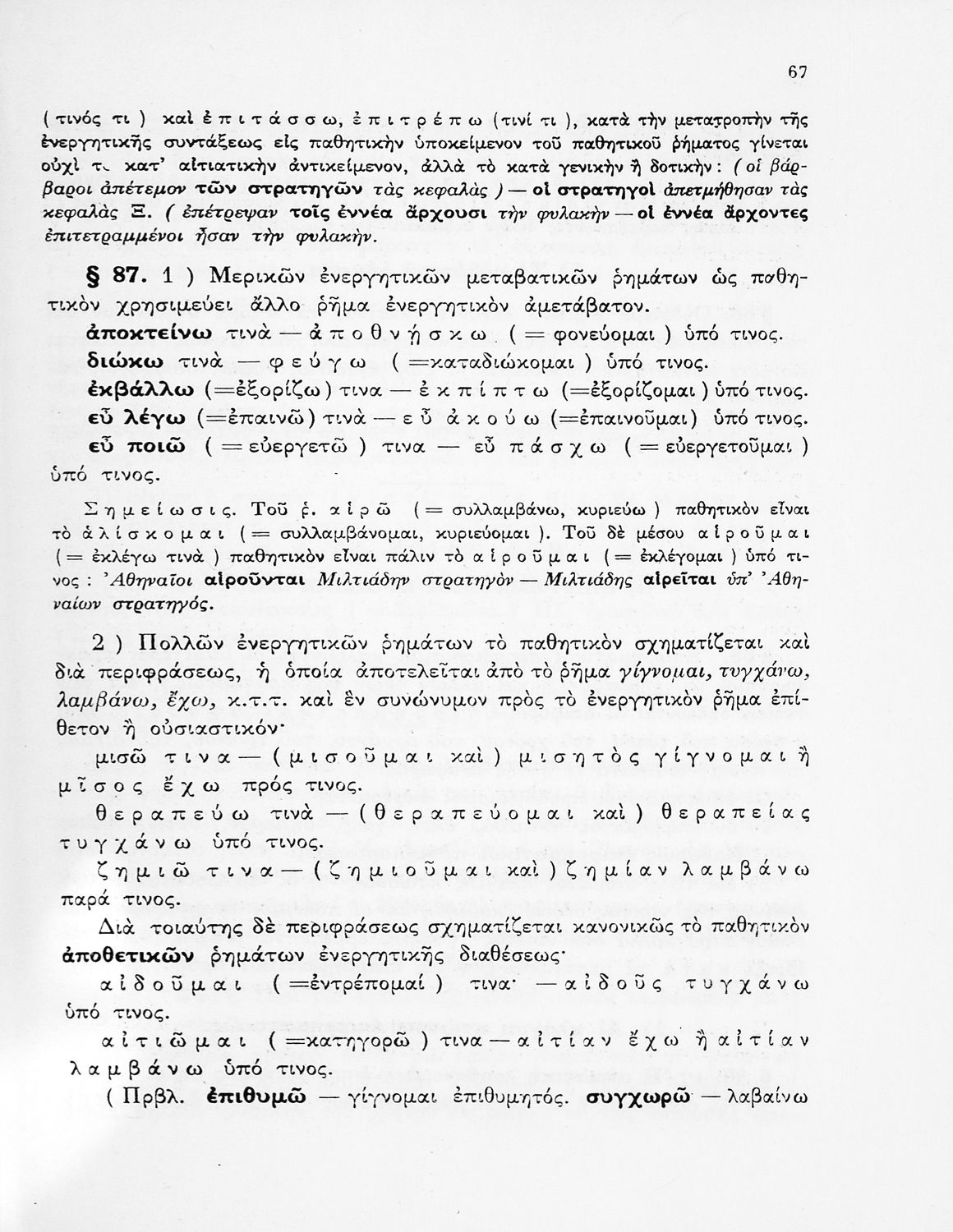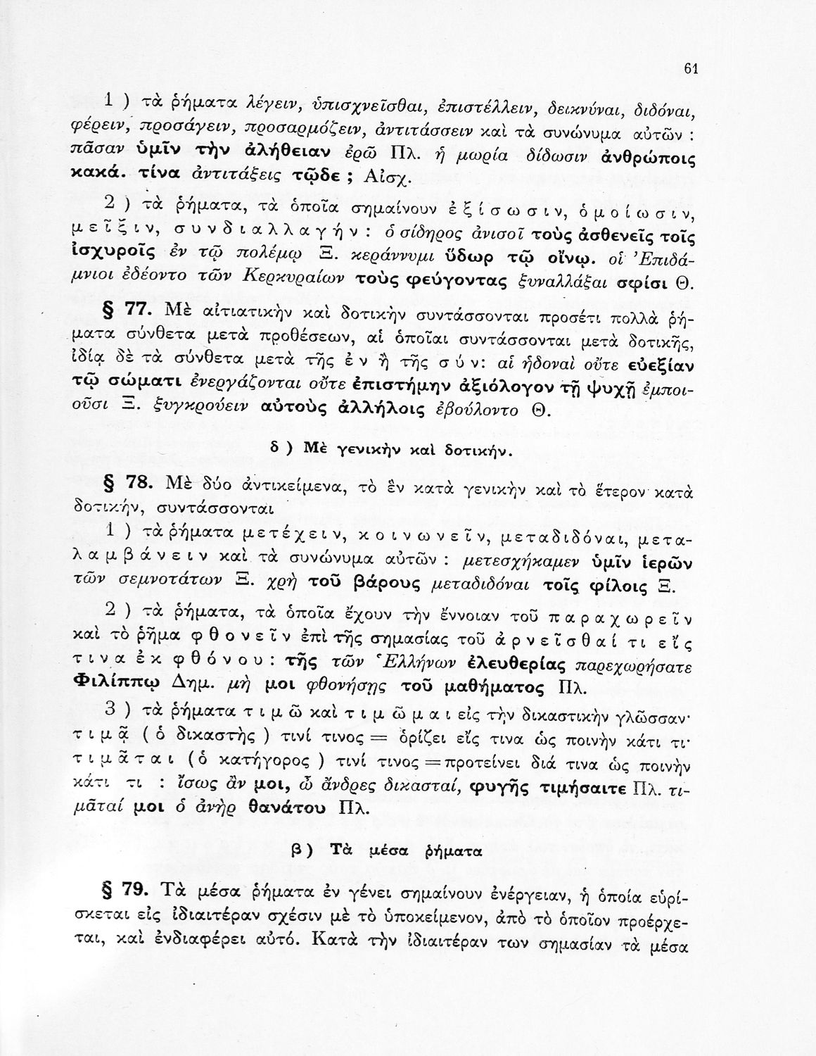 Βαθμίδα εκπαίδευσης: Δευτεροβάθμια Μάθημα: Αρχαία Ελληνικά Γλώσσα: Καθαρεύουσα Παρουσίαση περιεχομένου: Σχολικό εγχειρίδιο Αρχαίων Ελληνικών Γυμνασίου που εξετάζει τα μέρη του λόγου και την σύνταξή τους. |