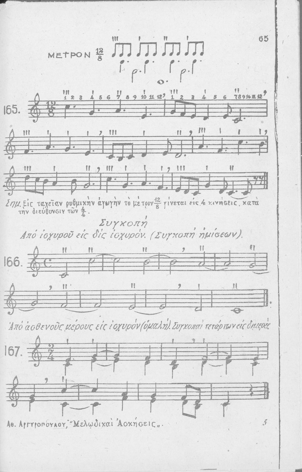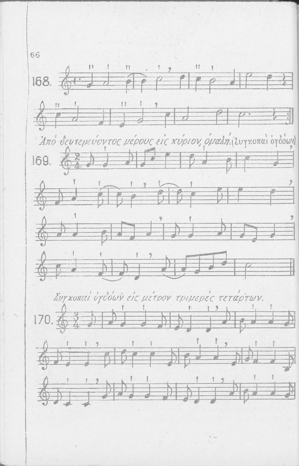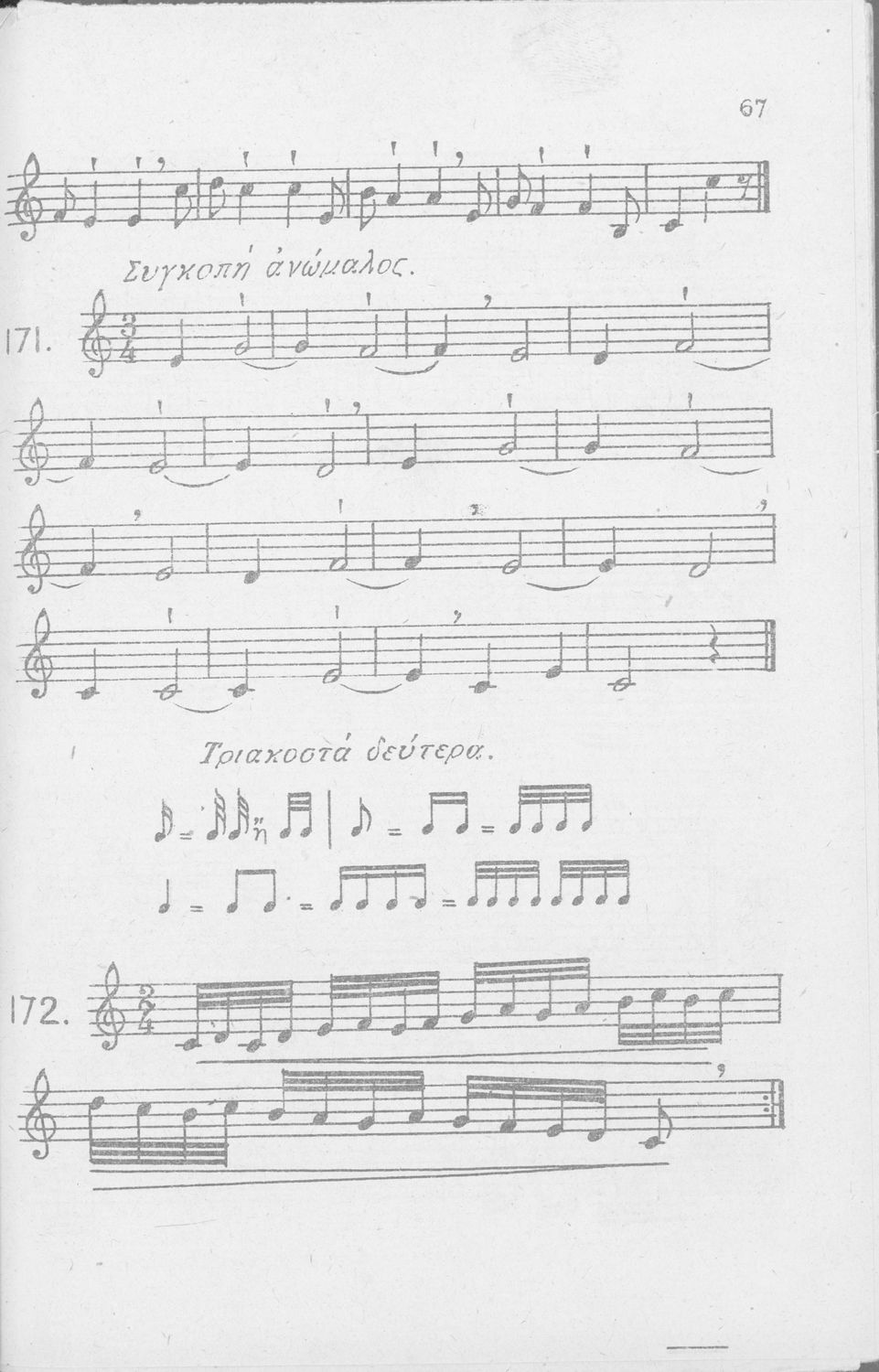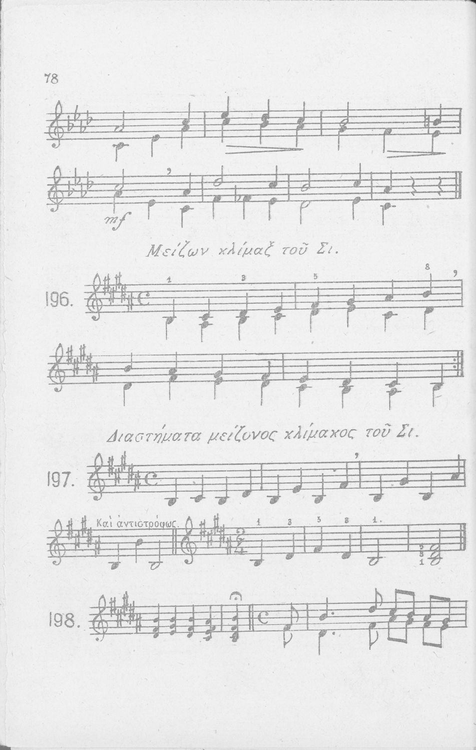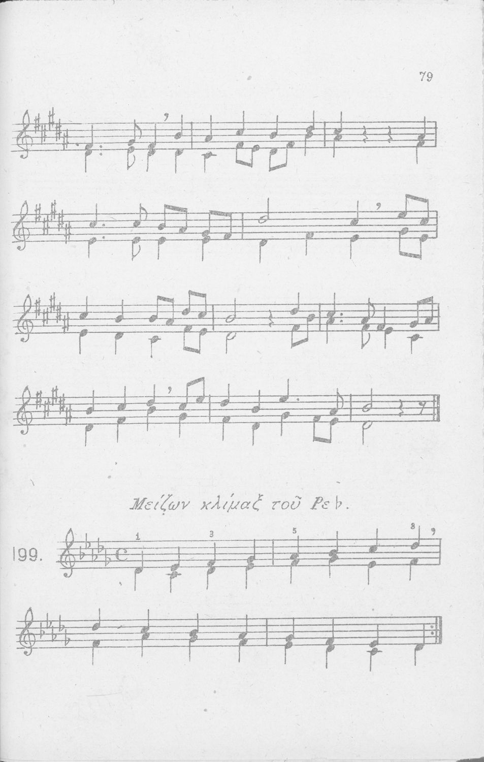 Σχολικό εγχειρίδιο Μουσικής για Γυμνάσια, Παρθεναγωγεία και Διδασκαλεία. Περιέχει ασκήσεις μελωδικές, χωρίς θεωρία.