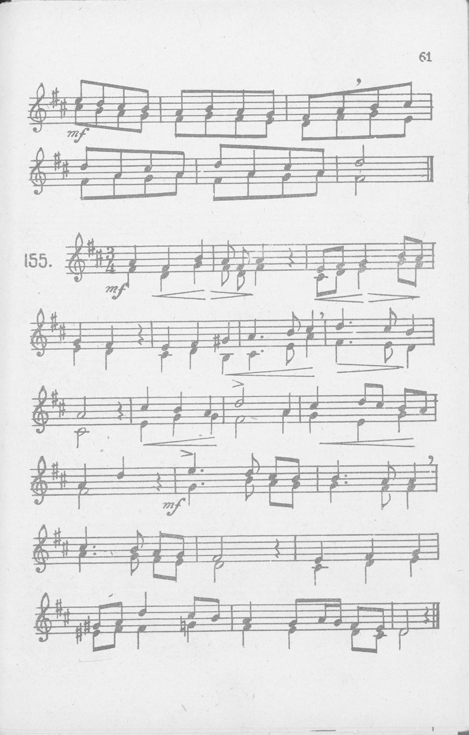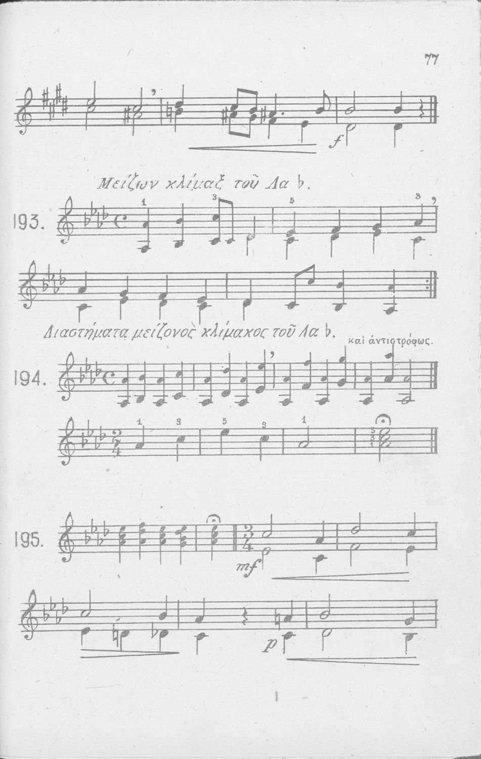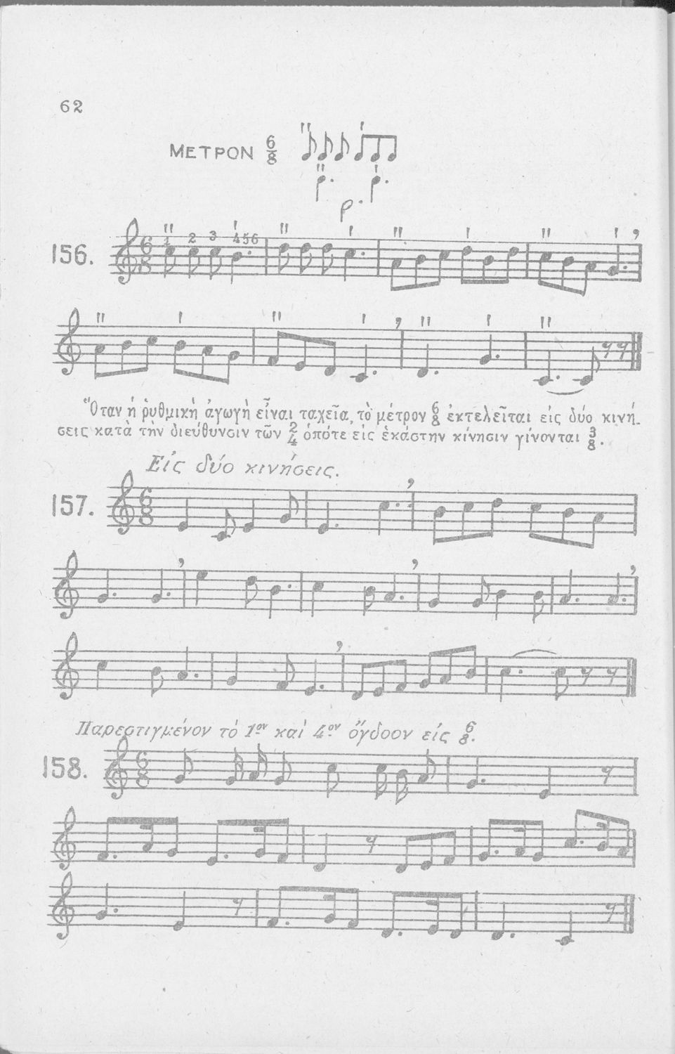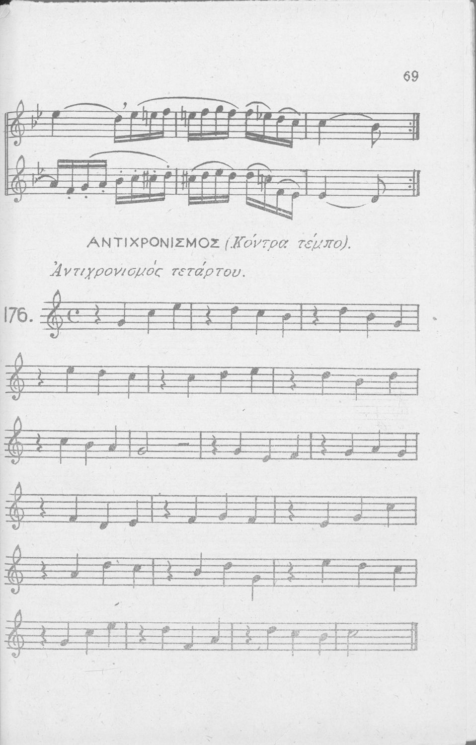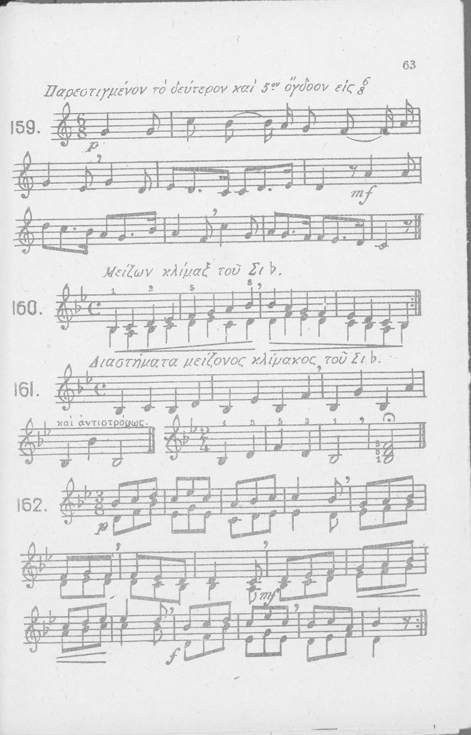 Σχολικό εγχειρίδιο Μουσικής για Γυμνάσια, Παρθεναγωγεία και Διδασκαλεία. Περιέχει ασκήσεις μελωδικές, χωρίς θεωρία.