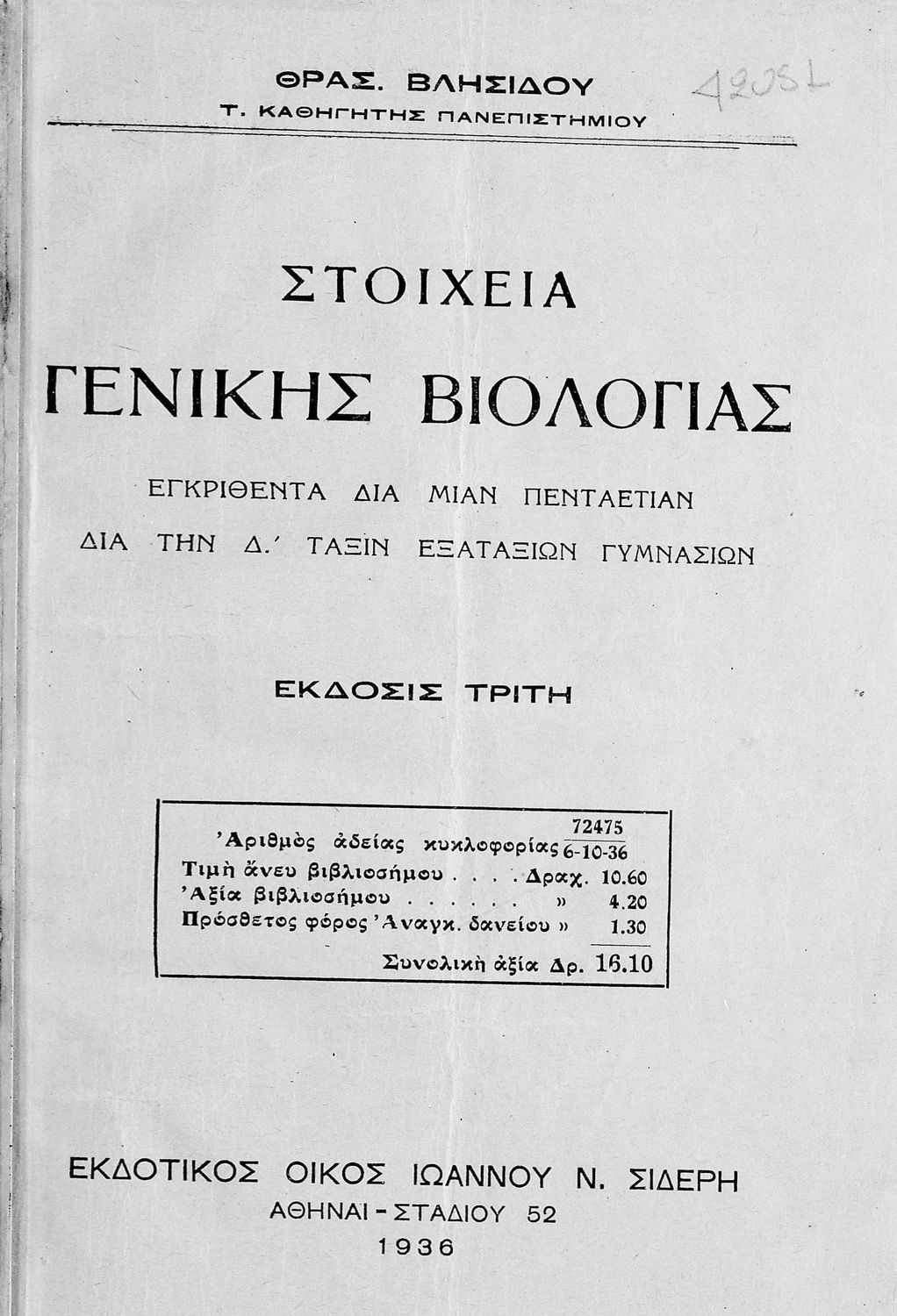 Εκδότης: Ιωάννης Ν. Σιδέρης Έτος έκδοσης: 1936 Τόπος έκδοσης: Αθήνα Έκδοση: 3η Υπουργική απόφαση / Σύμβαση: 41794 Έτος έγκρισης: 1933 |