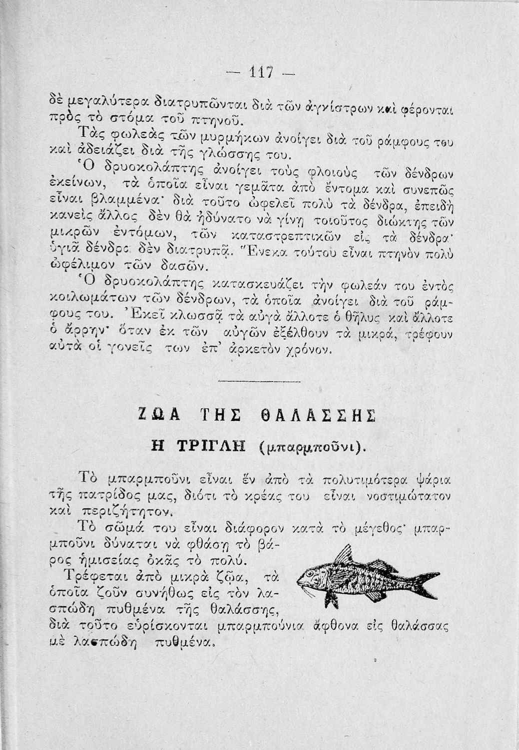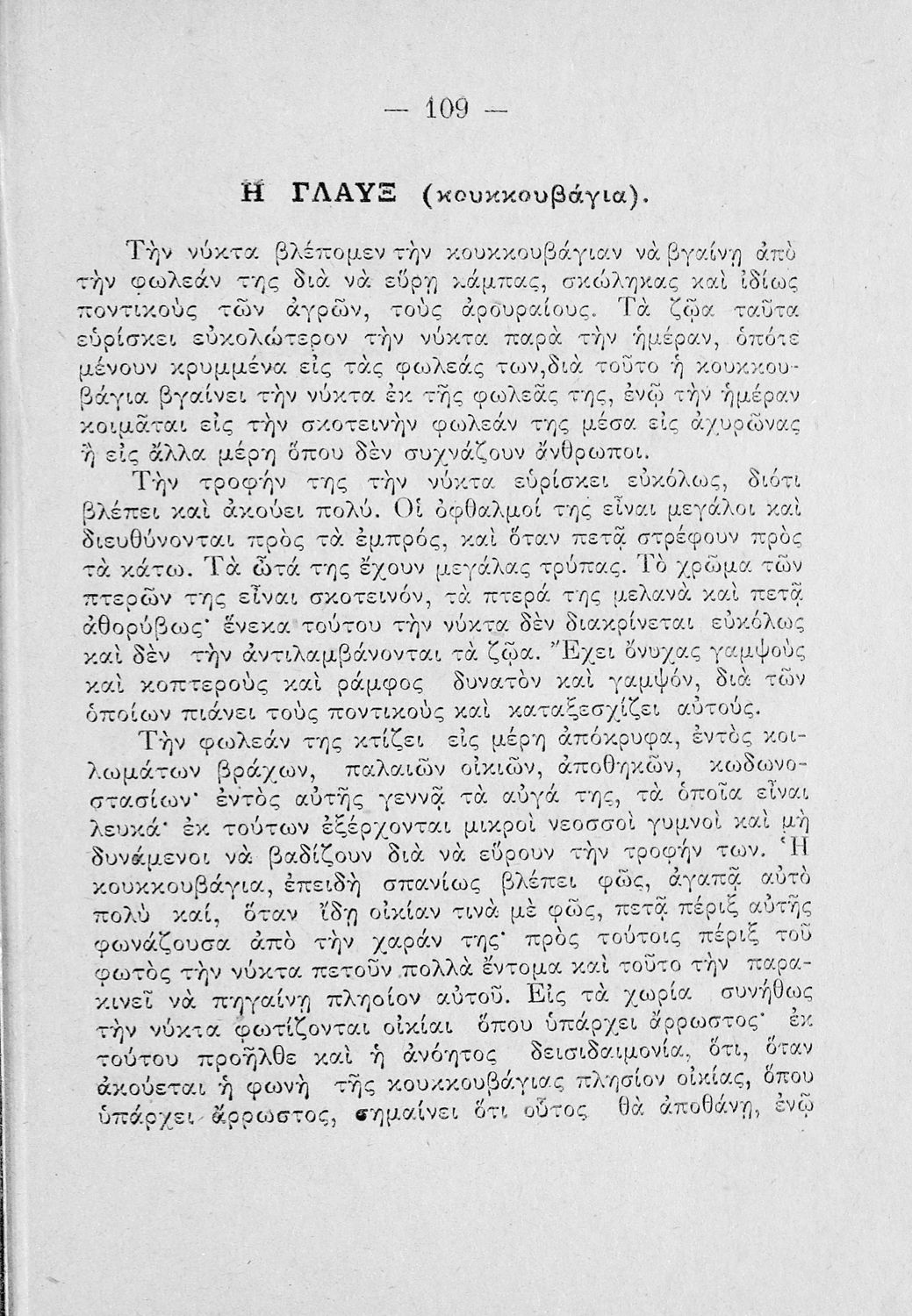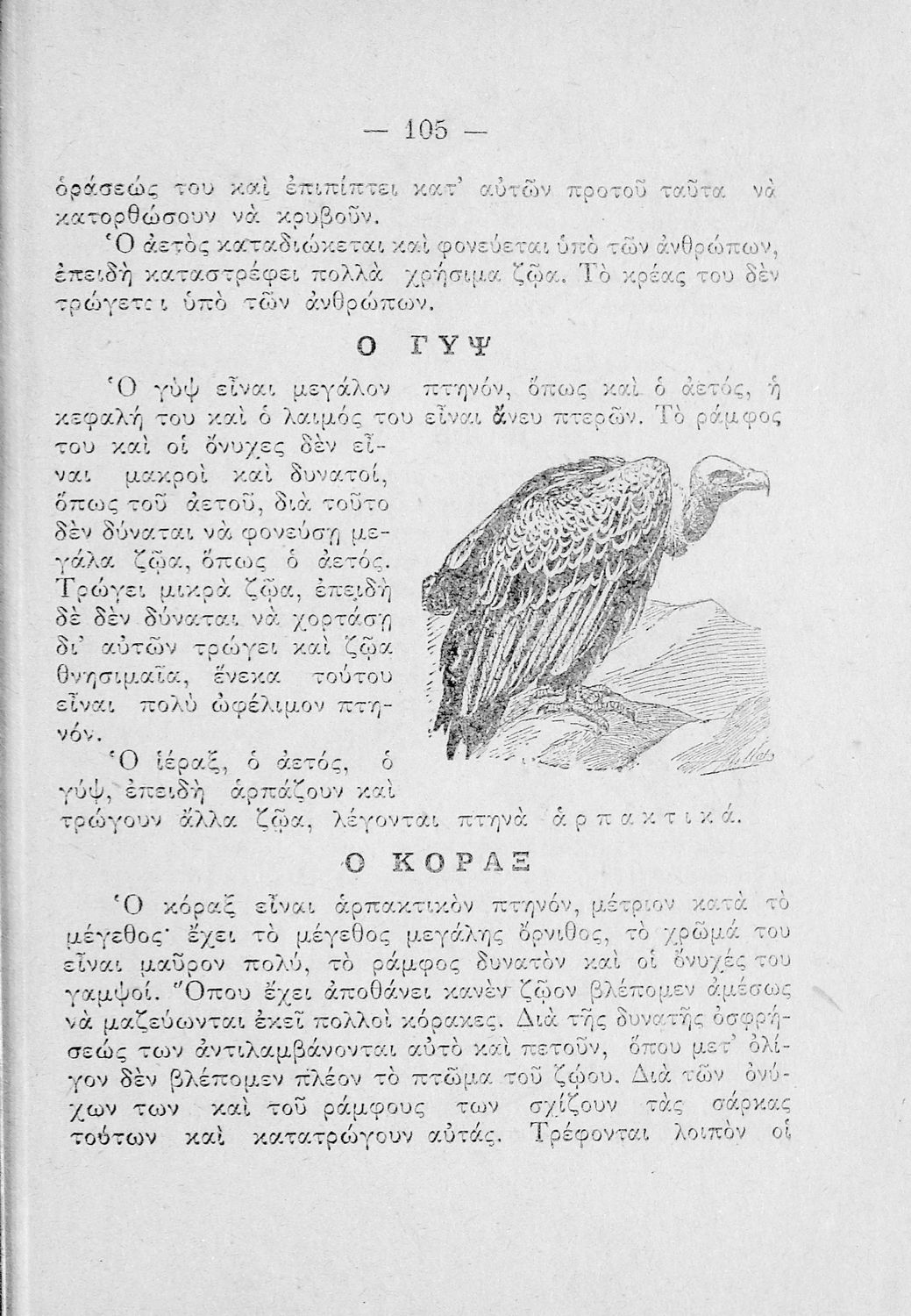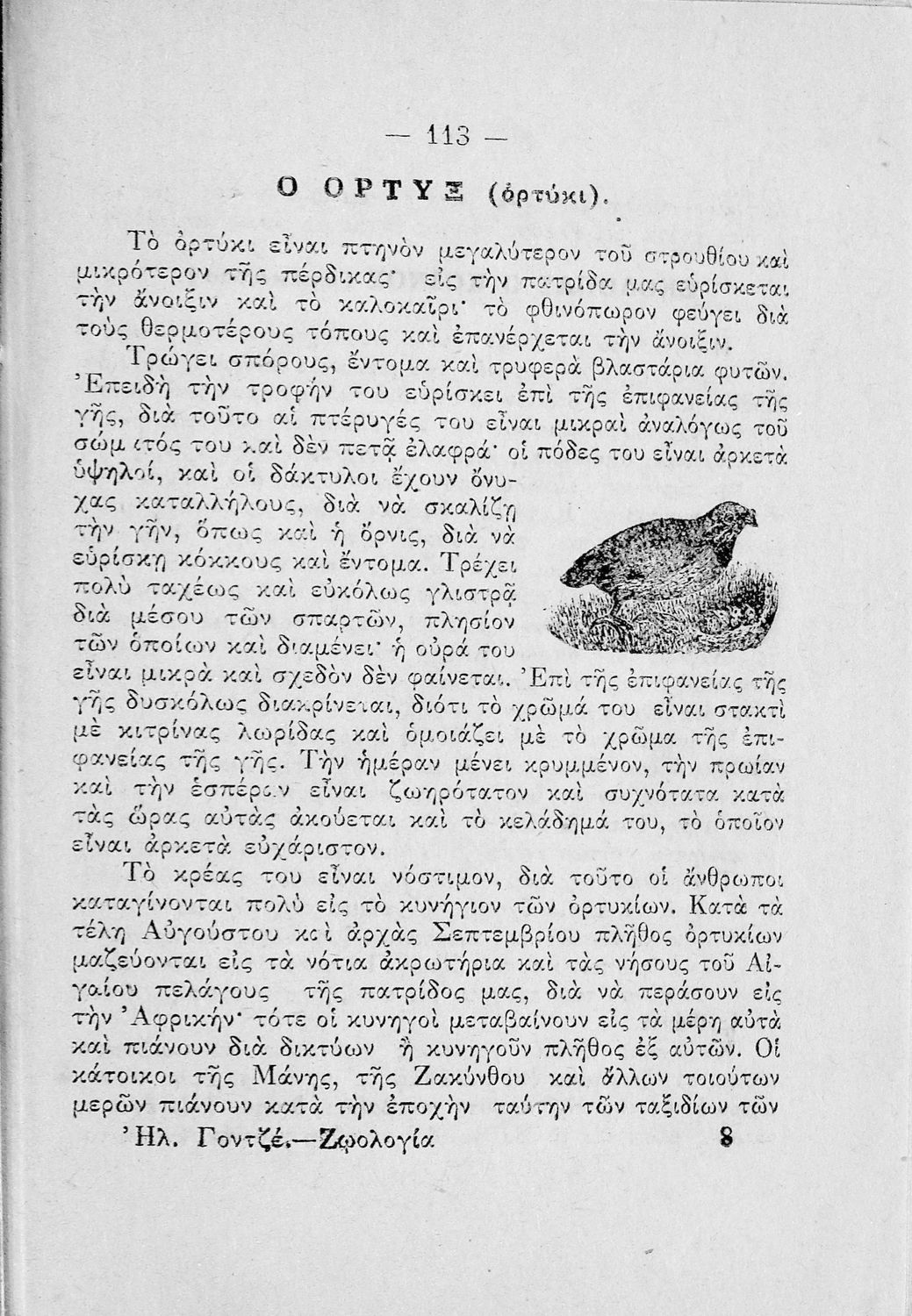 Βαθμίδα εκπαίδευσης: Πρωτοβάθμια Τάξη: Γ' Δημοτικού / Δ' Δημοτικού Μάθημα: Ζωολογία Γλώσσα: Απλή καθαρεύουσα Παρουσίαση περιεχομένου: Μαθητικό βοήθημα Ζωολογίας για τις Γ΄ και Δ΄ Δημοτικού που αποτελείται από μικρά κεφάλαια τα οποία είναι αφιερωμένα στην περιγραφή ενός ζώου. |