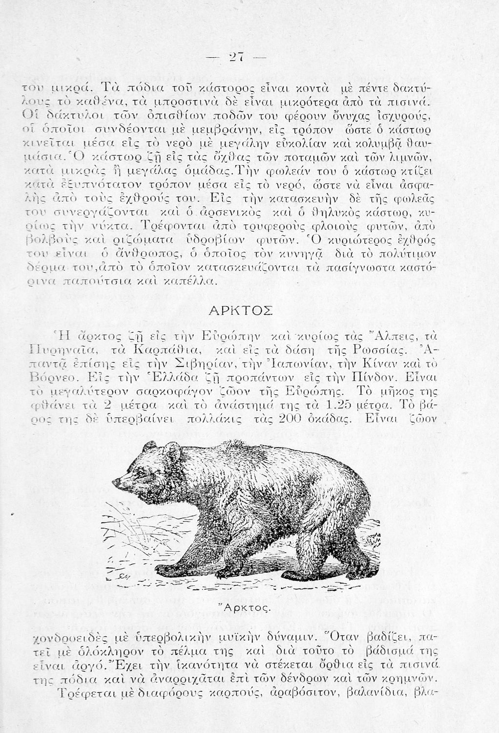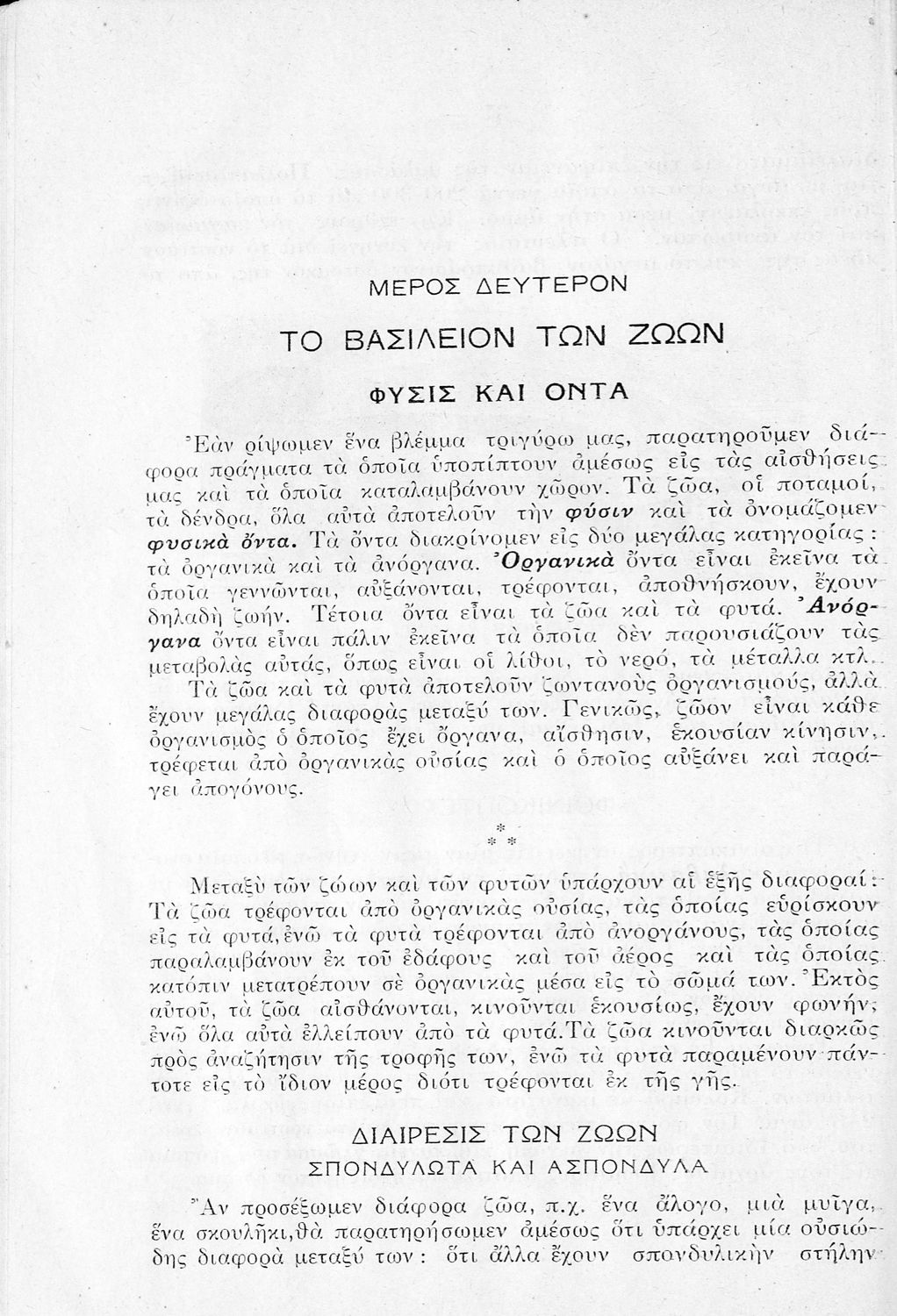 Βαθμίδα εκπαίδευσης: Πρωτοβάθμια Τάξη: Ε' Δημοτικού / ΣΤ' Δημοτικού Μάθημα: Ζωολογία, Ανθρωπολογία Γλώσσα: Απλή καθαρεύουσα Παρουσίαση περιεχομένου: Μαθητικό βοήθημα Ζωολογίας και Ανθρωπολογίας για τις Ε΄ και ΣΤ΄ Δημοτικού χωρισμένο σε τρία μέρη: την ταξινόμηση των ζώων ανάλογα με το περιβάλλον στο οποίο διαβιούν, το ζωικό βασίλειο και την ανθρώπινη φυσιολογία και ανατομία. |