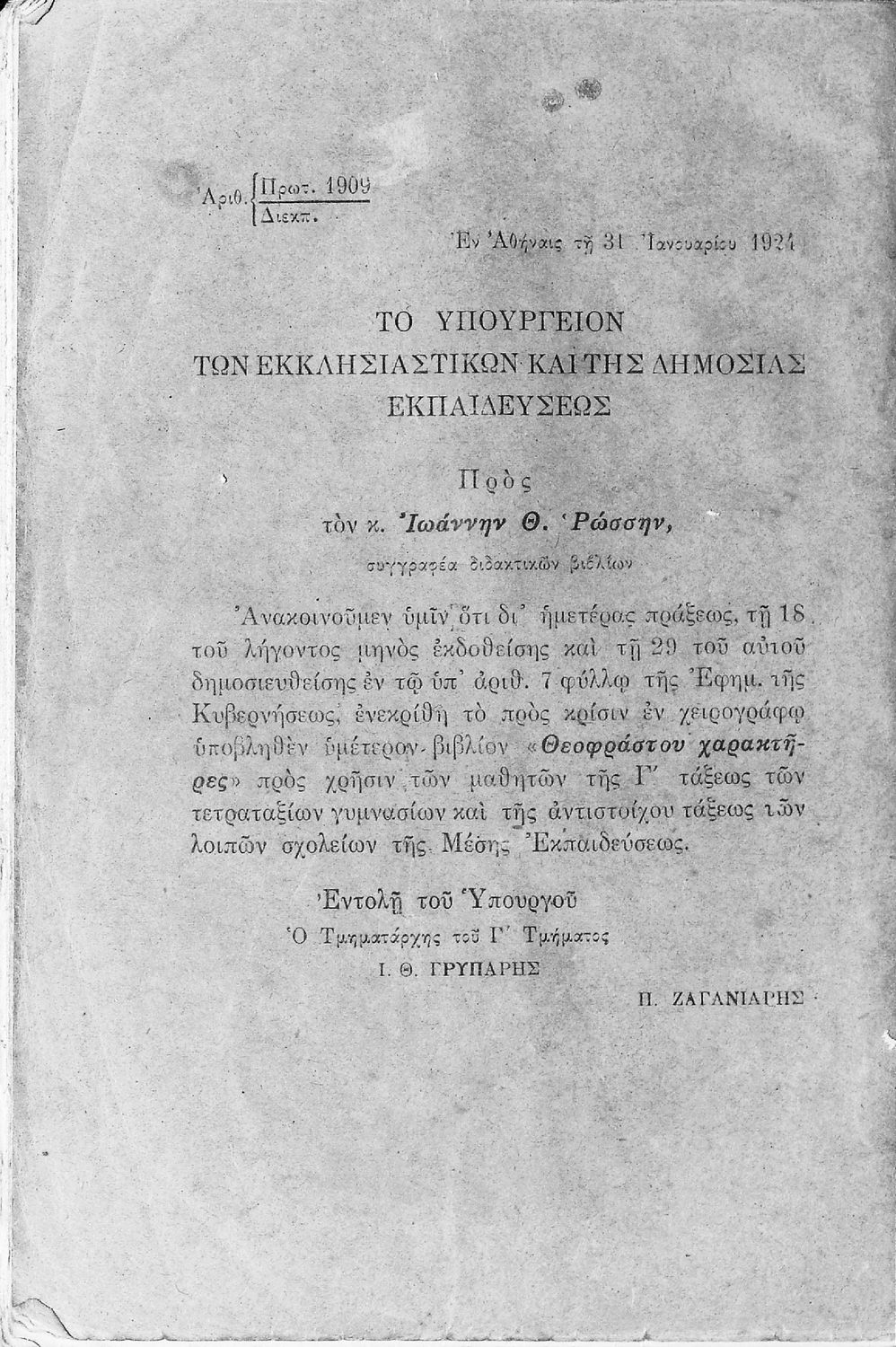 Βαθμίδα εκπαίδευσης: Δευτεροβάθμια Τάξη: Γ' Γυμνασίου Μάθημα: Αρχαία Ελληνικά Γλώσσα: Καθαρεύουσα Παρουσίαση περιεχομένου: Σχολικό εγχειρίδιο Αρχαίων Ελληνικών Γ΄ Γυμνασίου που περιέχει τους Χαρακτήρες του Θεόφραστου, και ερμηνευτικές και πραγματολογικές παρατηρήσεις. |