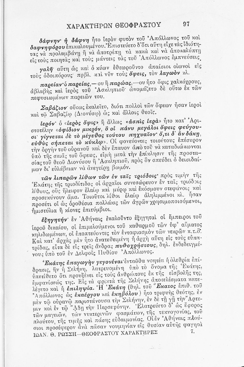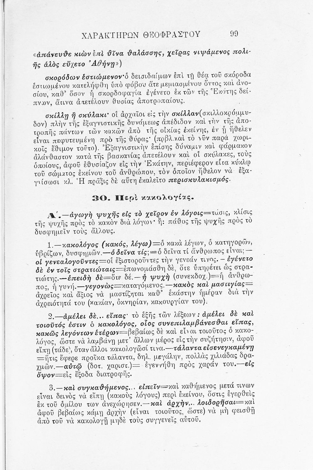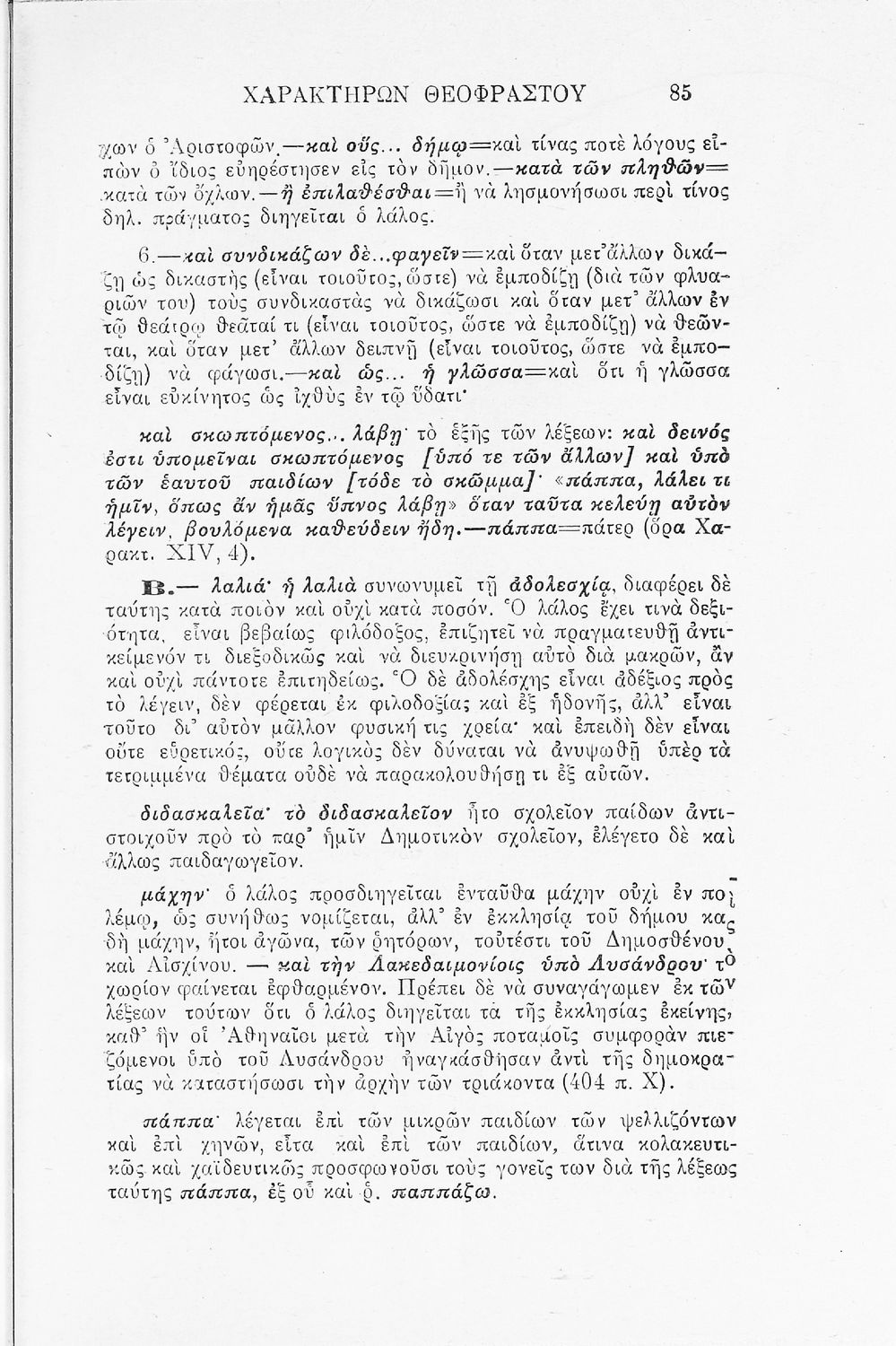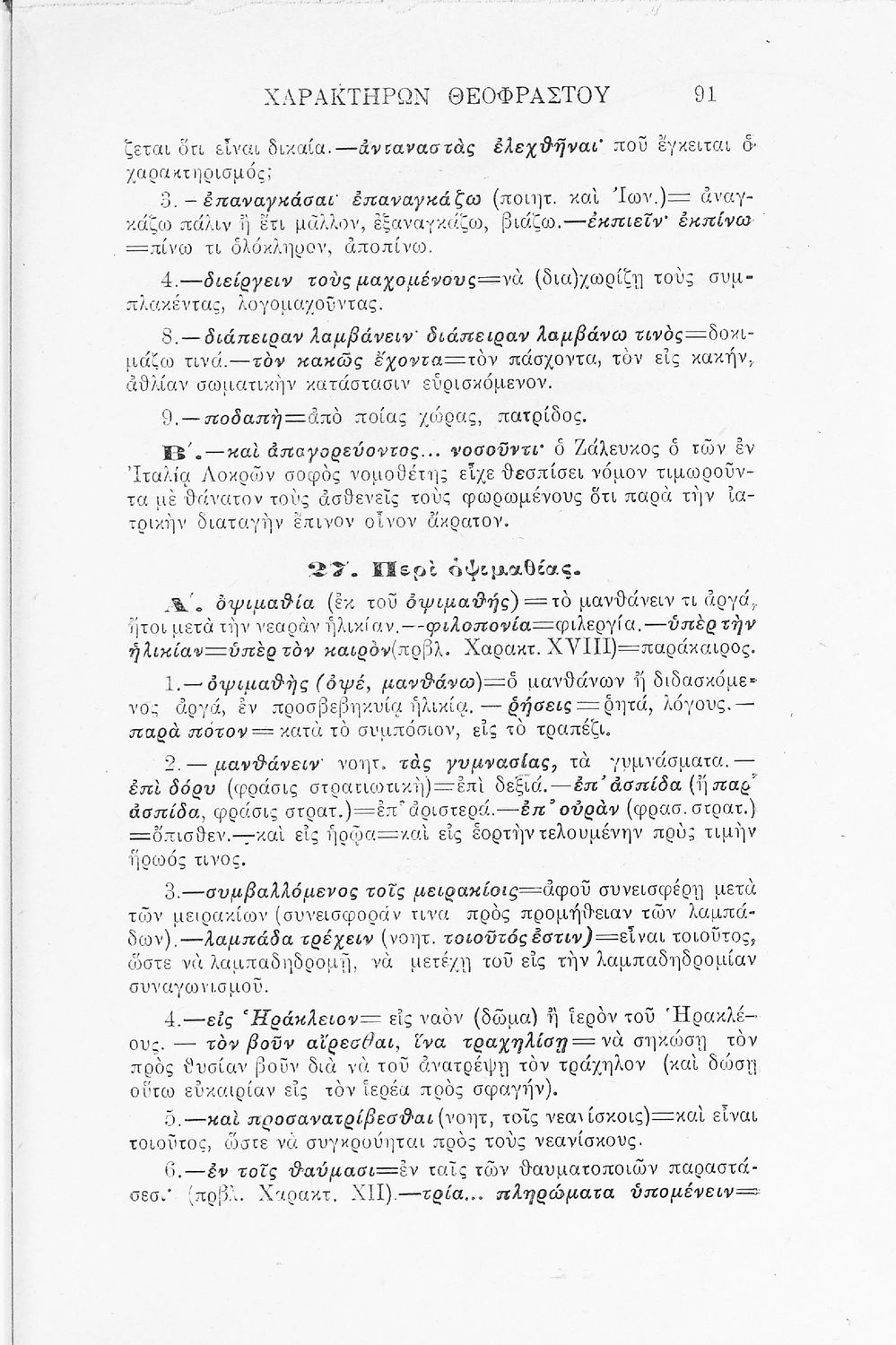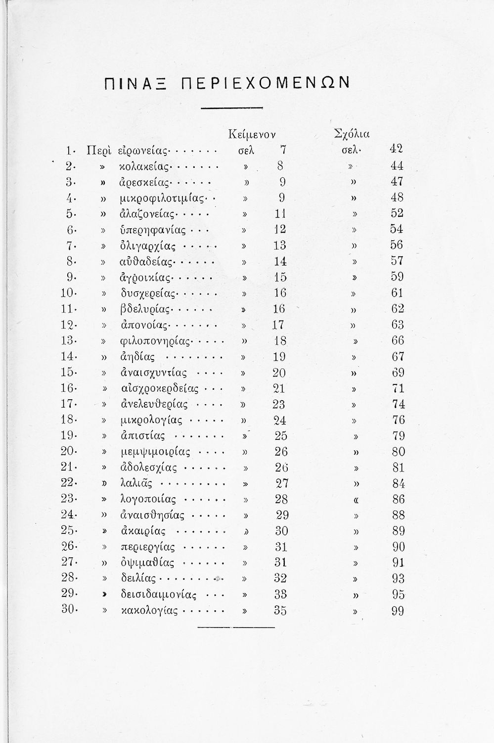 Βαθμίδα εκπαίδευσης: Δευτεροβάθμια Τάξη: Γ' Γυμνασίου Μάθημα: Αρχαία Ελληνικά Γλώσσα: Καθαρεύουσα Παρουσίαση περιεχομένου: Σχολικό εγχειρίδιο Αρχαίων Ελληνικών Γ΄ Γυμνασίου που περιέχει τους Χαρακτήρες του Θεόφραστου, και ερμηνευτικές και πραγματολογικές παρατηρήσεις. |