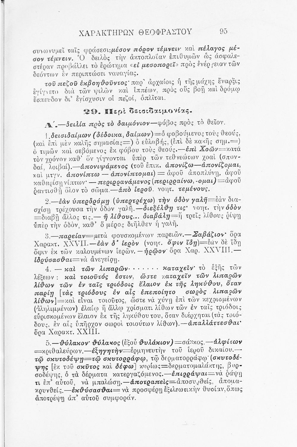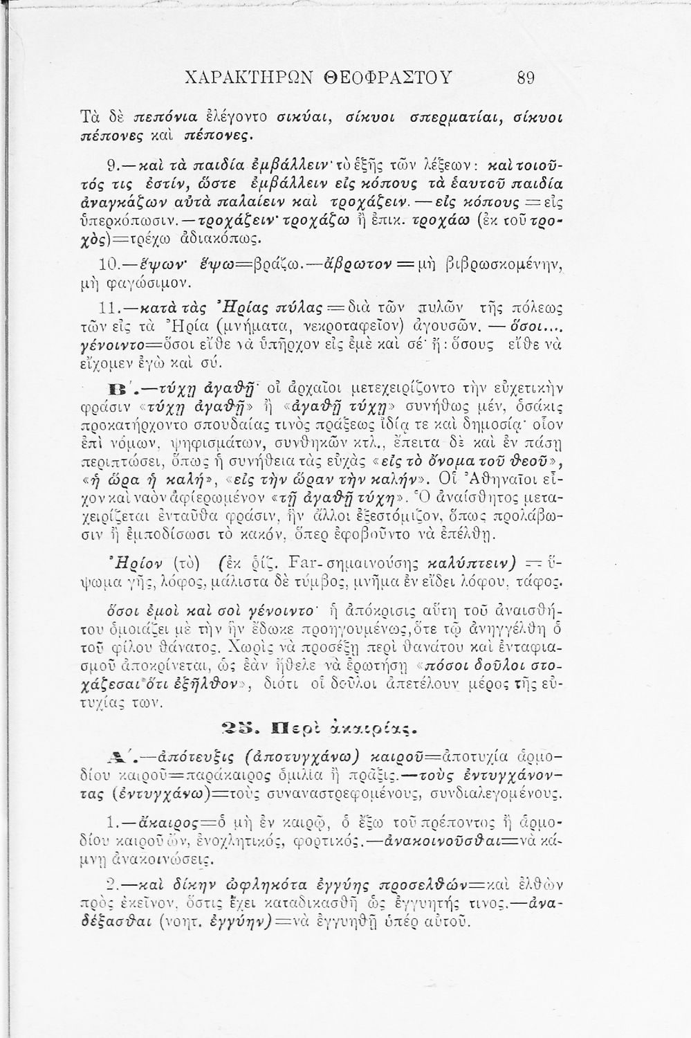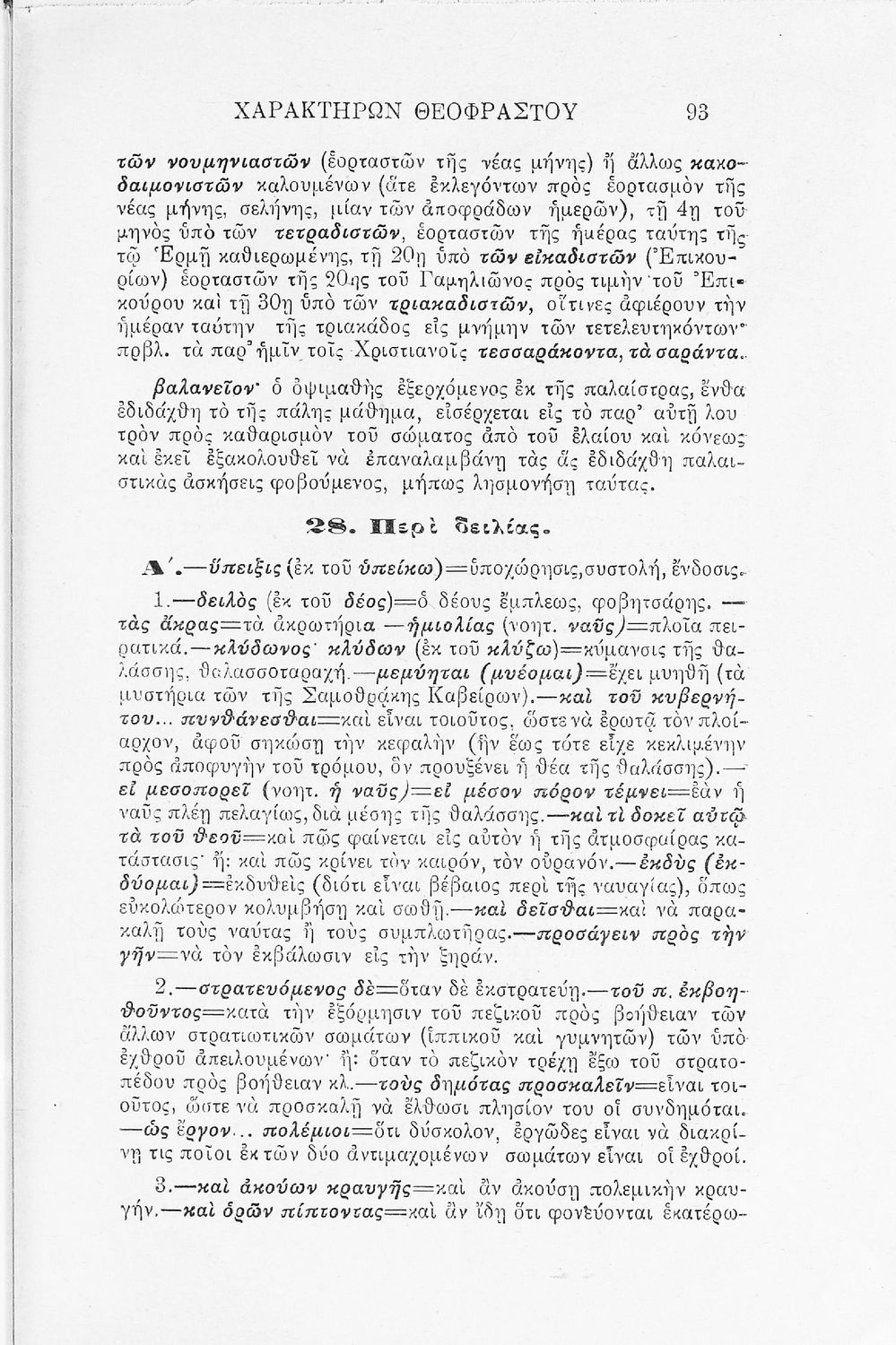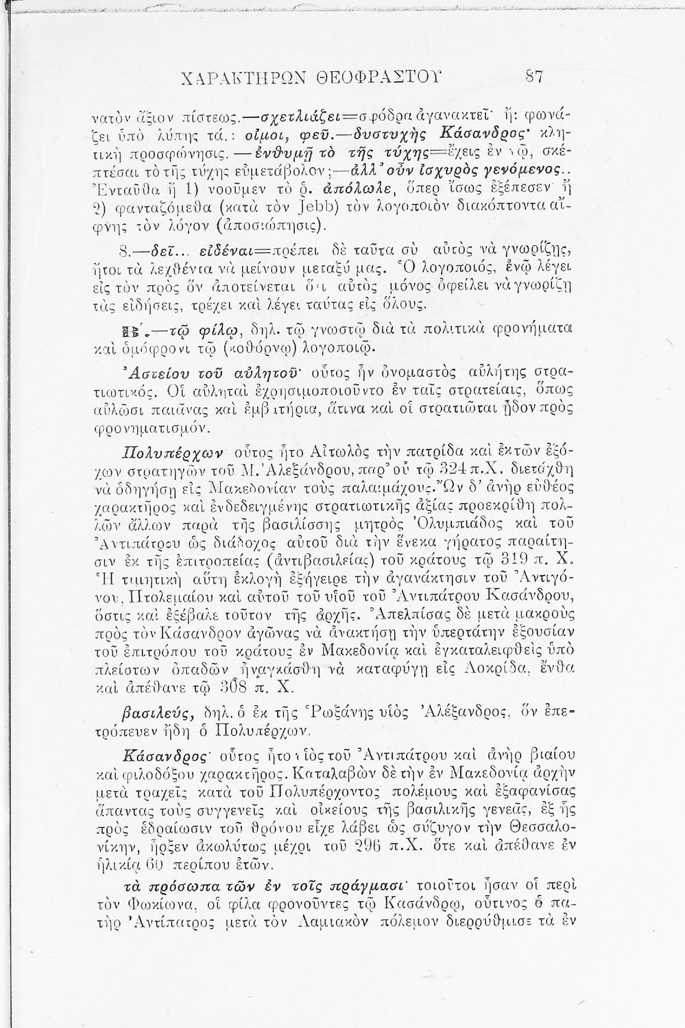 Βαθμίδα εκπαίδευσης: Δευτεροβάθμια Τάξη: Γ' Γυμνασίου Μάθημα: Αρχαία Ελληνικά Γλώσσα: Καθαρεύουσα Παρουσίαση περιεχομένου: Σχολικό εγχειρίδιο Αρχαίων Ελληνικών Γ΄ Γυμνασίου που περιέχει τους Χαρακτήρες του Θεόφραστου, και ερμηνευτικές και πραγματολογικές παρατηρήσεις. |