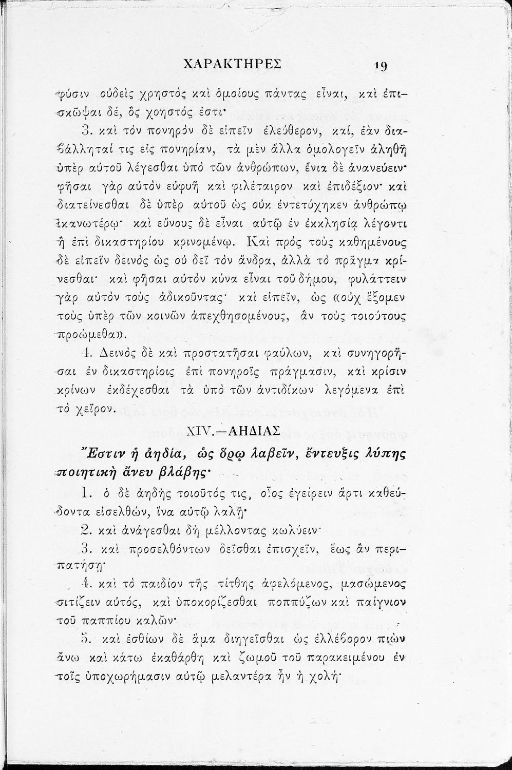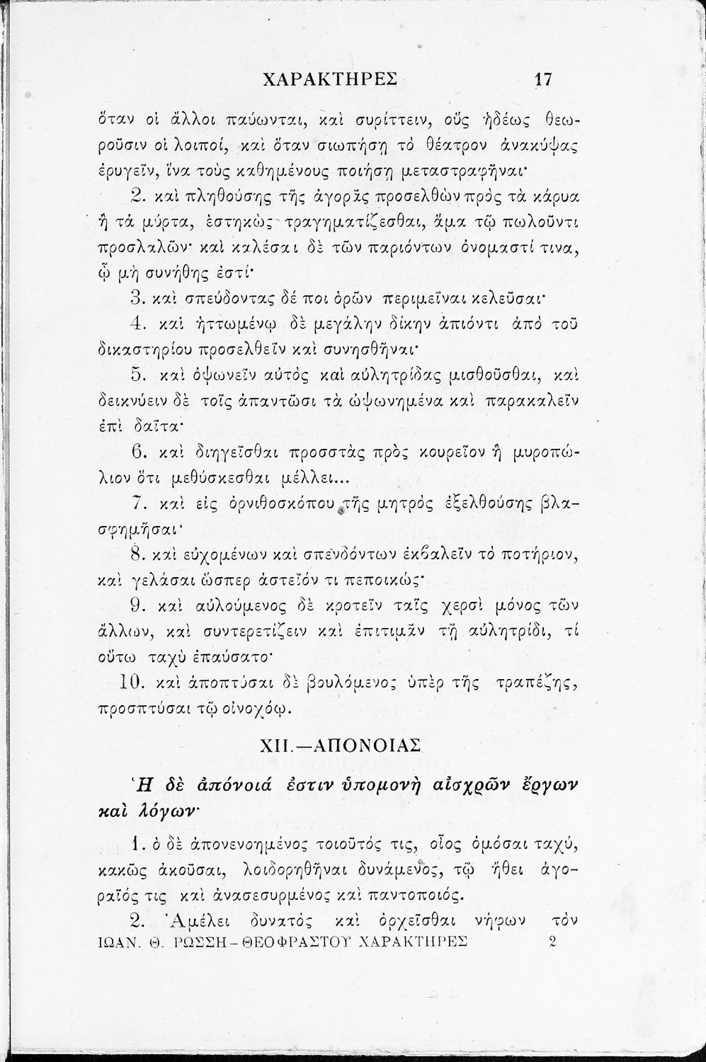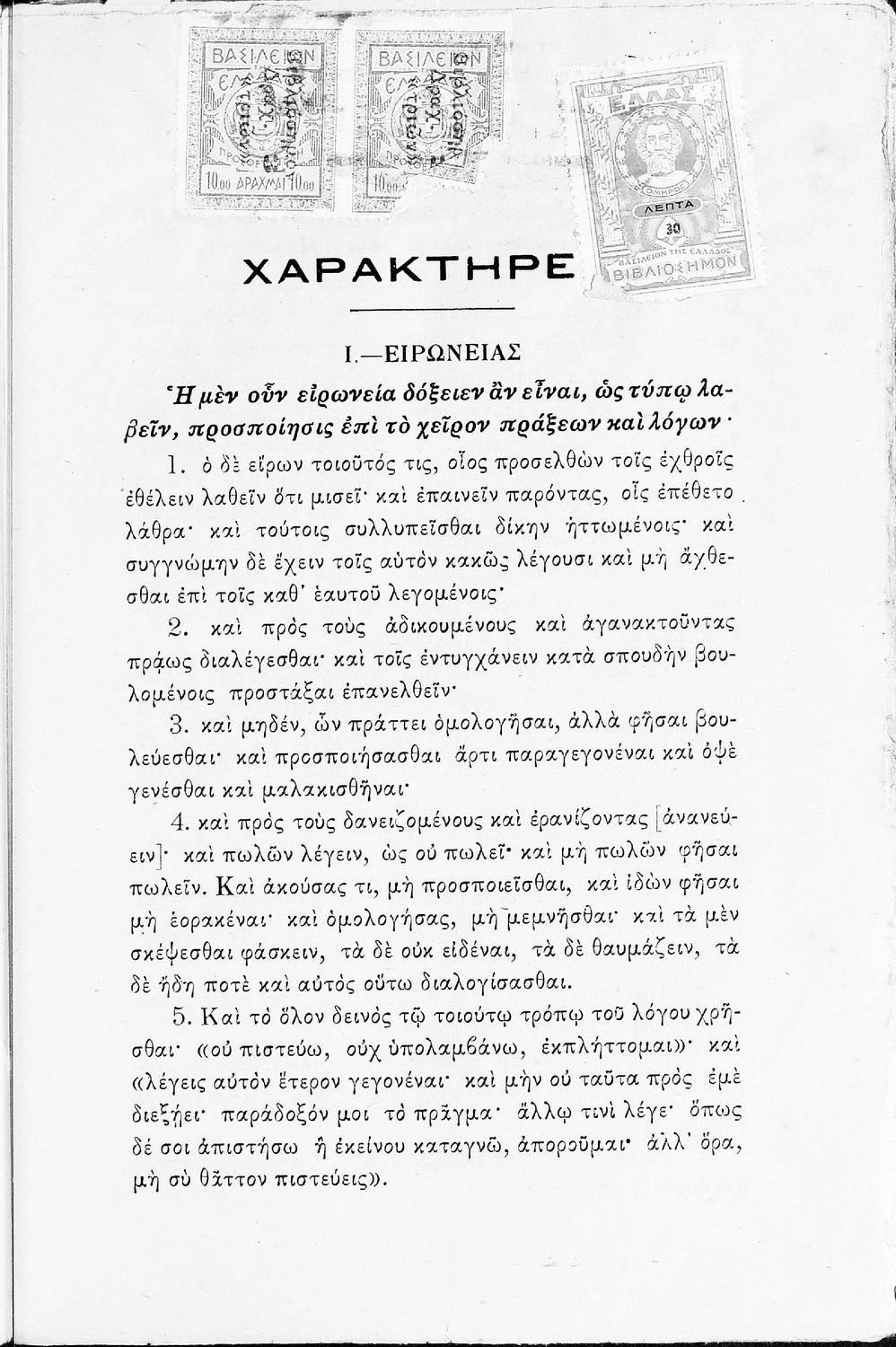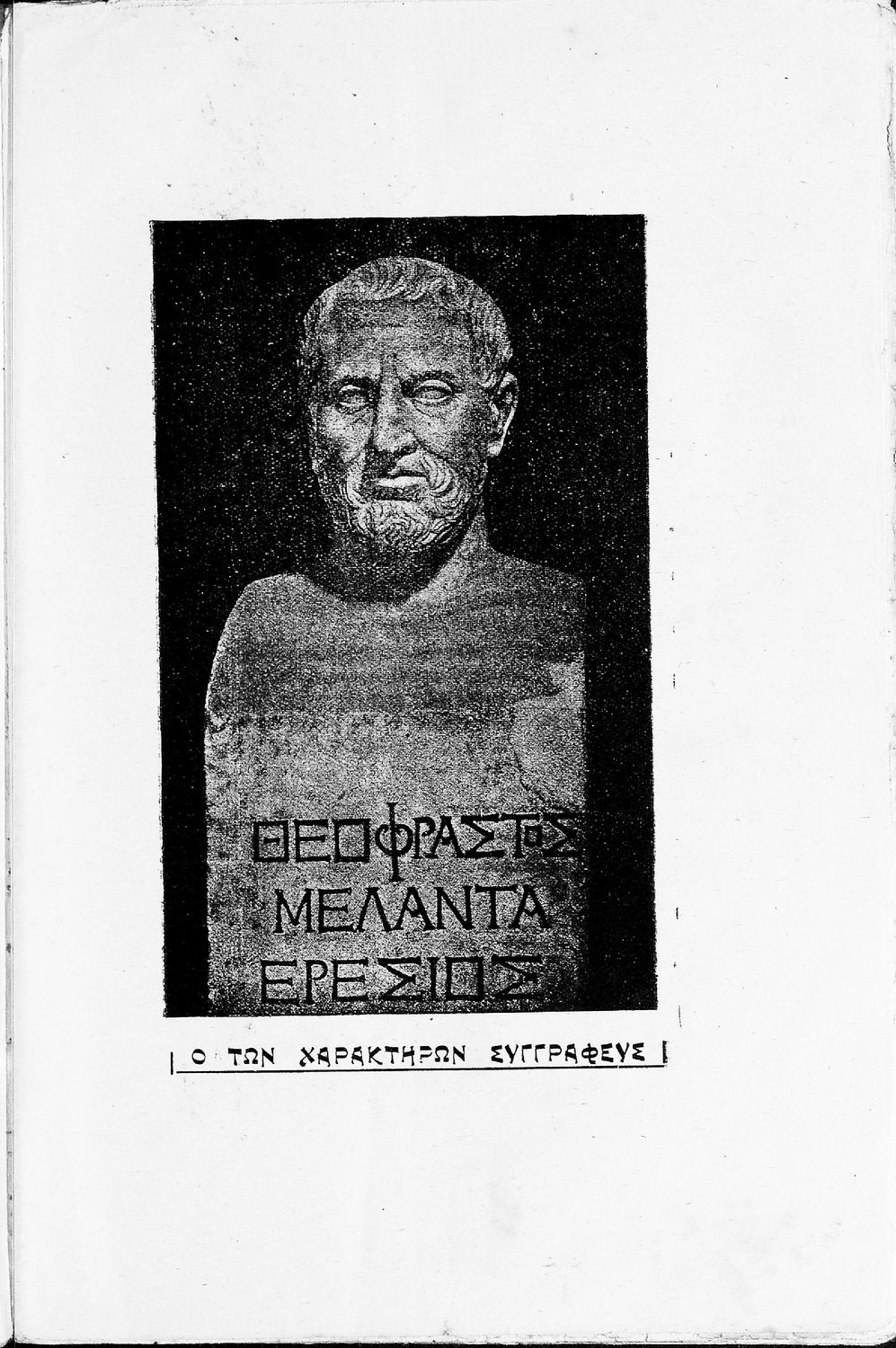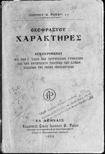 Βαθμίδα εκπαίδευσης: Δευτεροβάθμια Τάξη: Γ' Γυμνασίου Μάθημα: Αρχαία Ελληνικά Γλώσσα: Καθαρεύουσα Παρουσίαση περιεχομένου: Σχολικό εγχειρίδιο Αρχαίων Ελληνικών Γ΄ Γυμνασίου που περιέχει τους Χαρακτήρες του Θεόφραστου, και ερμηνευτικές και πραγματολογικές παρατηρήσεις. |