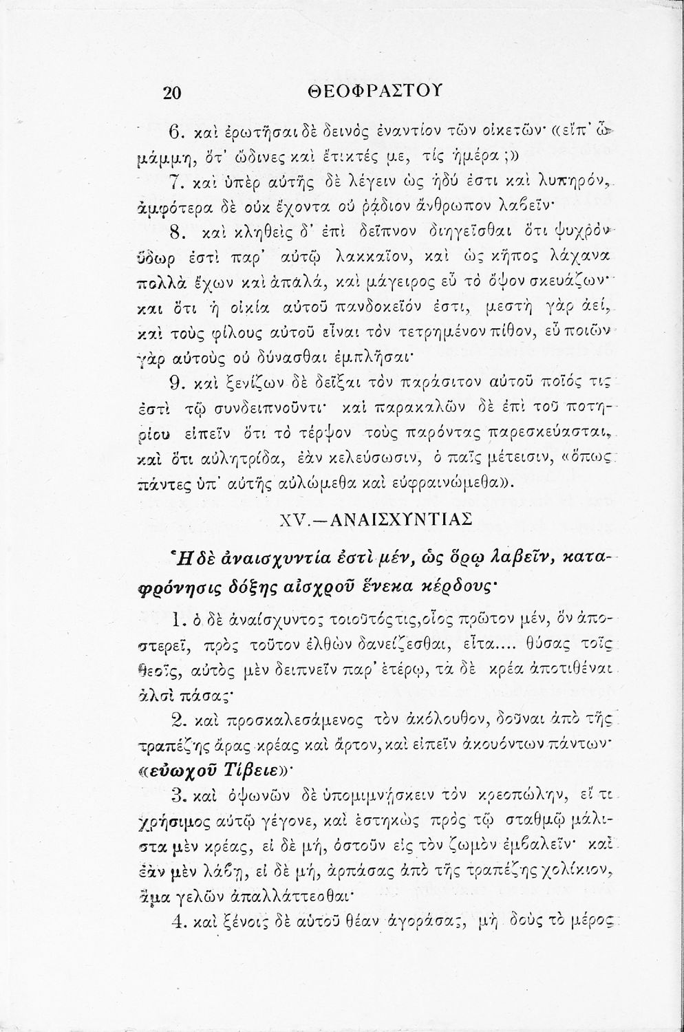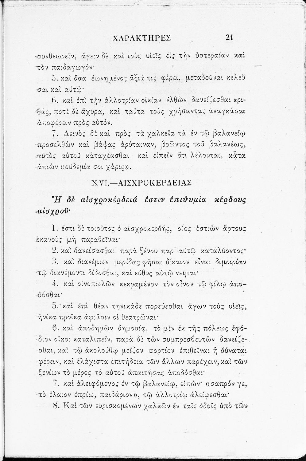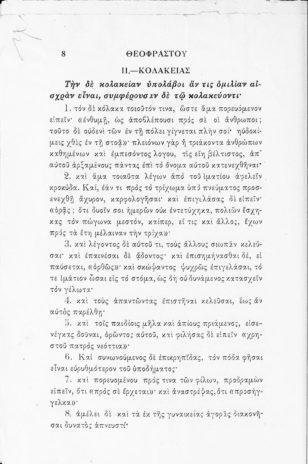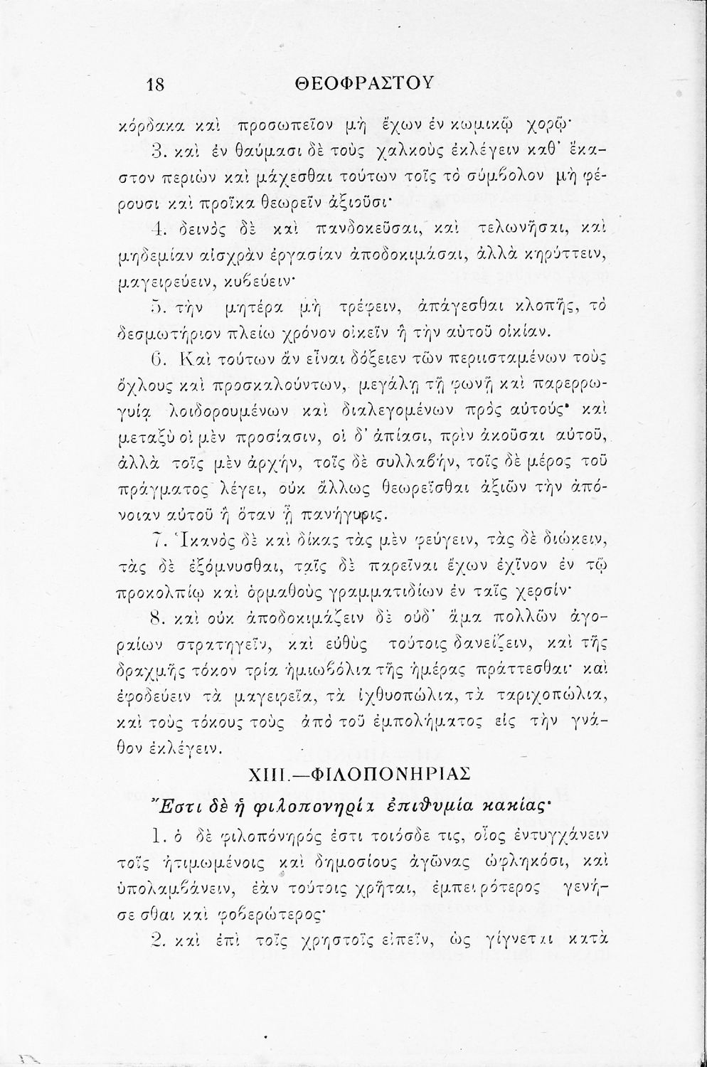 Βαθμίδα εκπαίδευσης: Δευτεροβάθμια Τάξη: Γ' Γυμνασίου Μάθημα: Αρχαία Ελληνικά Γλώσσα: Καθαρεύουσα Παρουσίαση περιεχομένου: Σχολικό εγχειρίδιο Αρχαίων Ελληνικών Γ΄ Γυμνασίου που περιέχει τους Χαρακτήρες του Θεόφραστου, και ερμηνευτικές και πραγματολογικές παρατηρήσεις. |