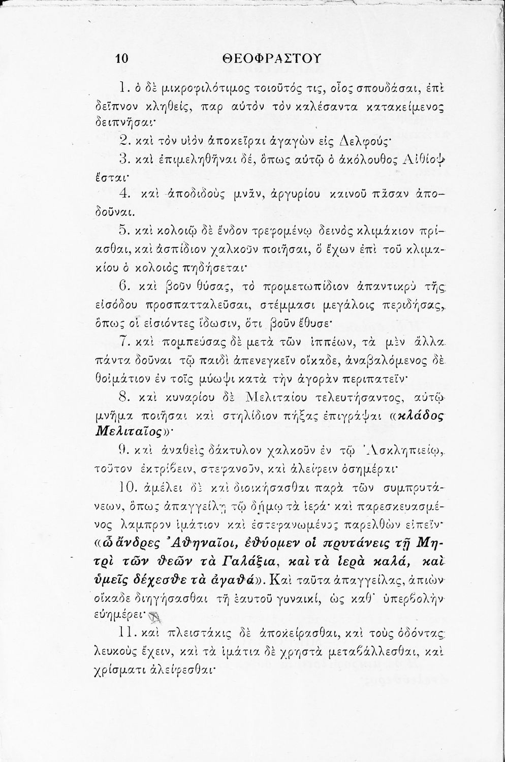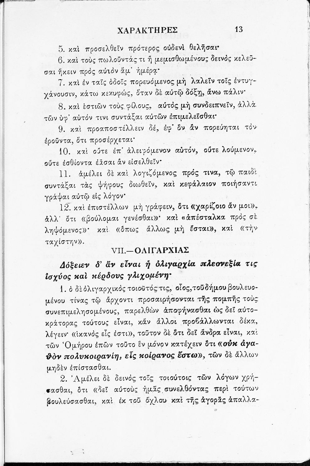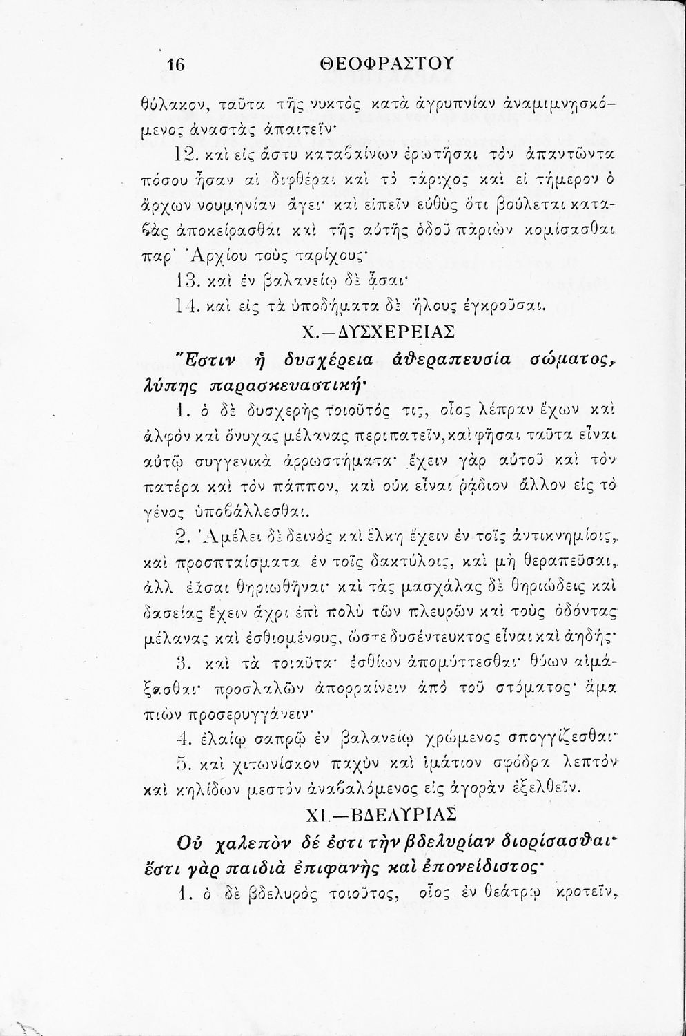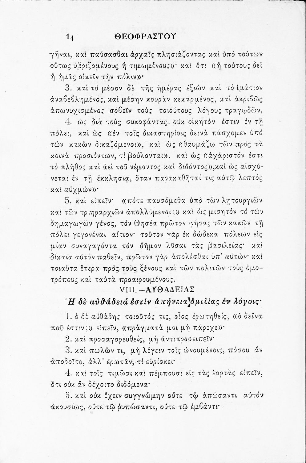 Βαθμίδα εκπαίδευσης: Δευτεροβάθμια Τάξη: Γ' Γυμνασίου Μάθημα: Αρχαία Ελληνικά Γλώσσα: Καθαρεύουσα Παρουσίαση περιεχομένου: Σχολικό εγχειρίδιο Αρχαίων Ελληνικών Γ΄ Γυμνασίου που περιέχει τους Χαρακτήρες του Θεόφραστου, και ερμηνευτικές και πραγματολογικές παρατηρήσεις. |