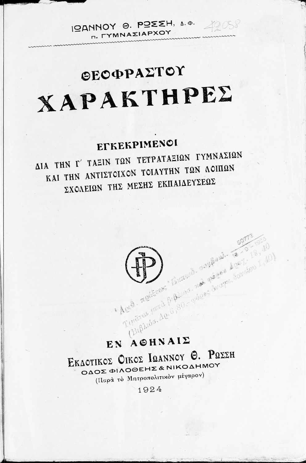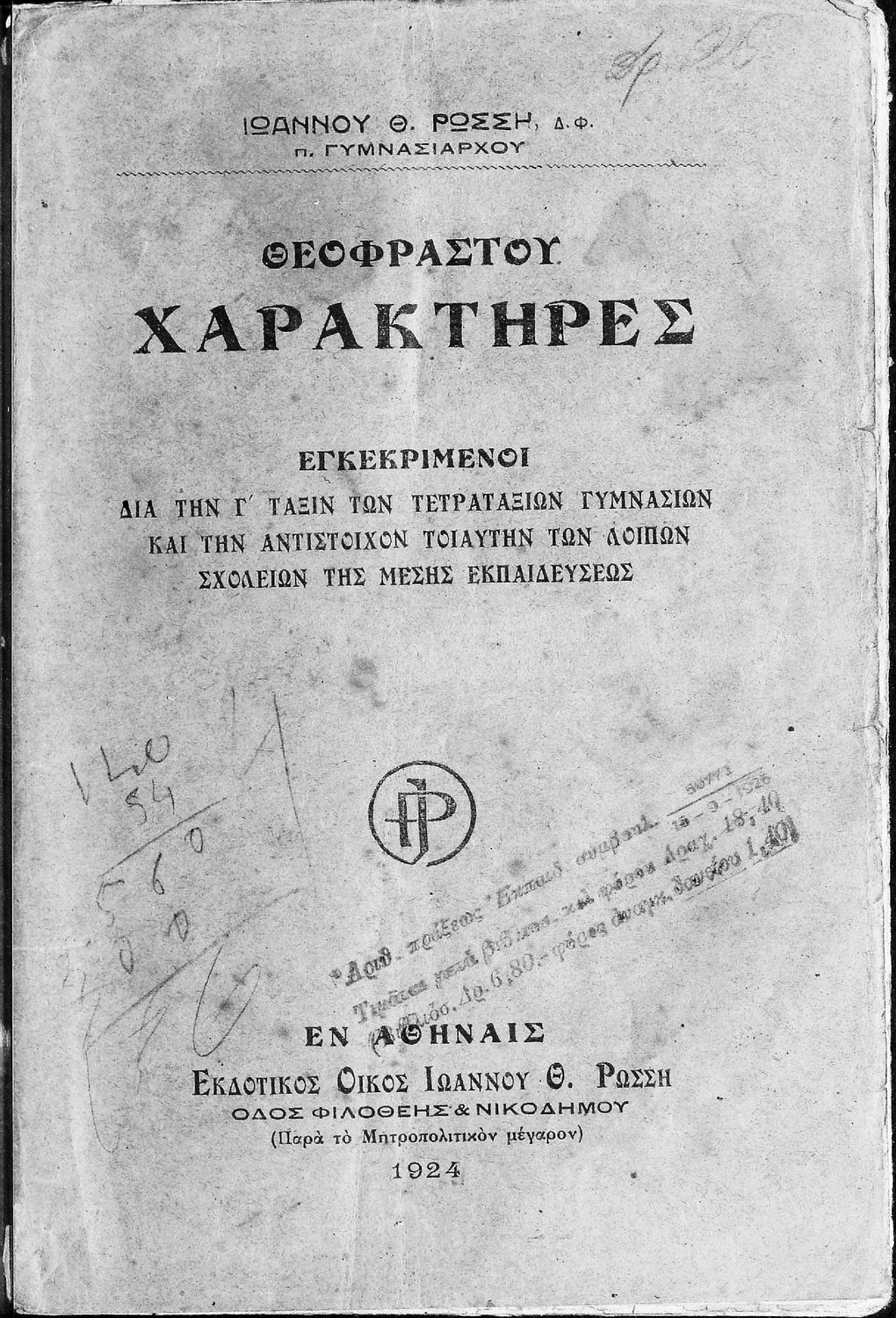 Κωδικός αναγνώρισης: 01-42058 Τίτλος: Θεόφραστου Χαρακτήρες. Εγκεκριμένοι δια την Γ΄ Τάξιν των Τετρατάξεων Γυμνασίων και την αντίστοιχον τοιαύτην των λοιπών σχολείων της Μέσης Εκπαιδεύσεως Συγγραφέας: Ιωάν. Θ. Ρώσσης (σχόλια) Μέγεθος και υπόστρωμα: Σχολικό εγχειρίδιο, μαλακό εξώφυλλο, 100 σελίδες. |