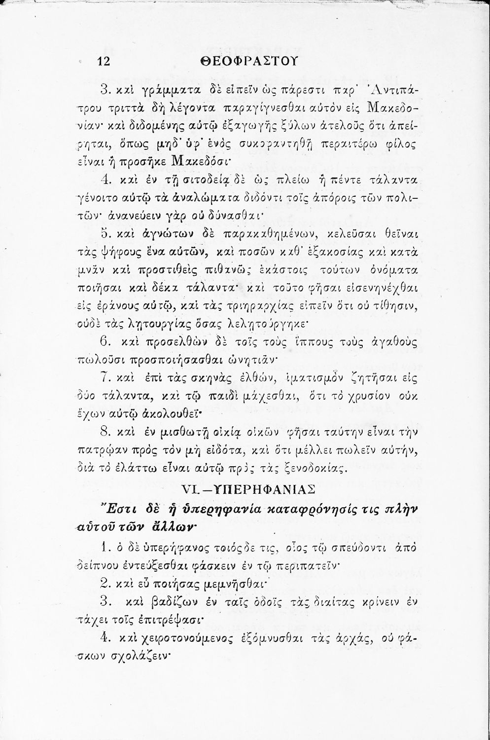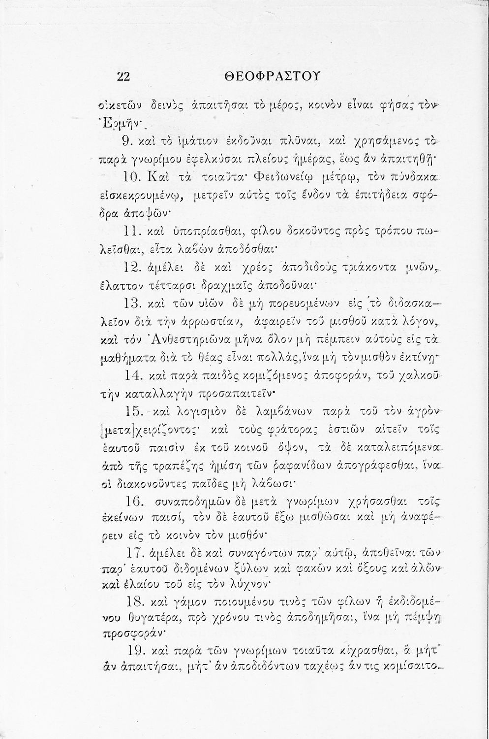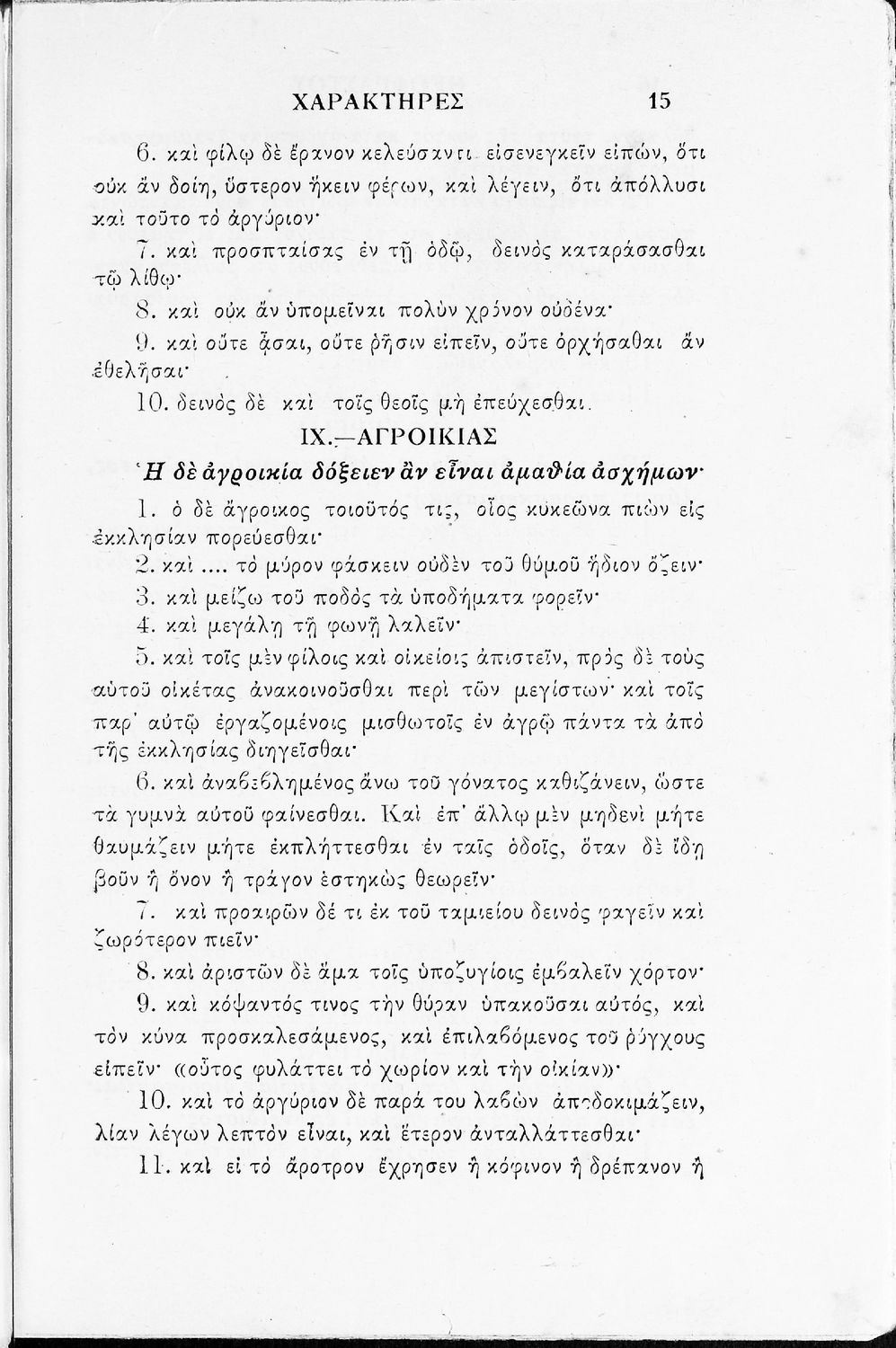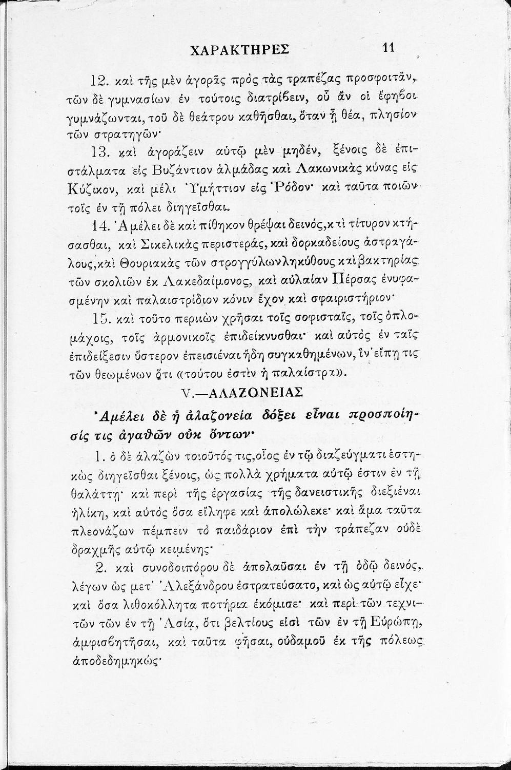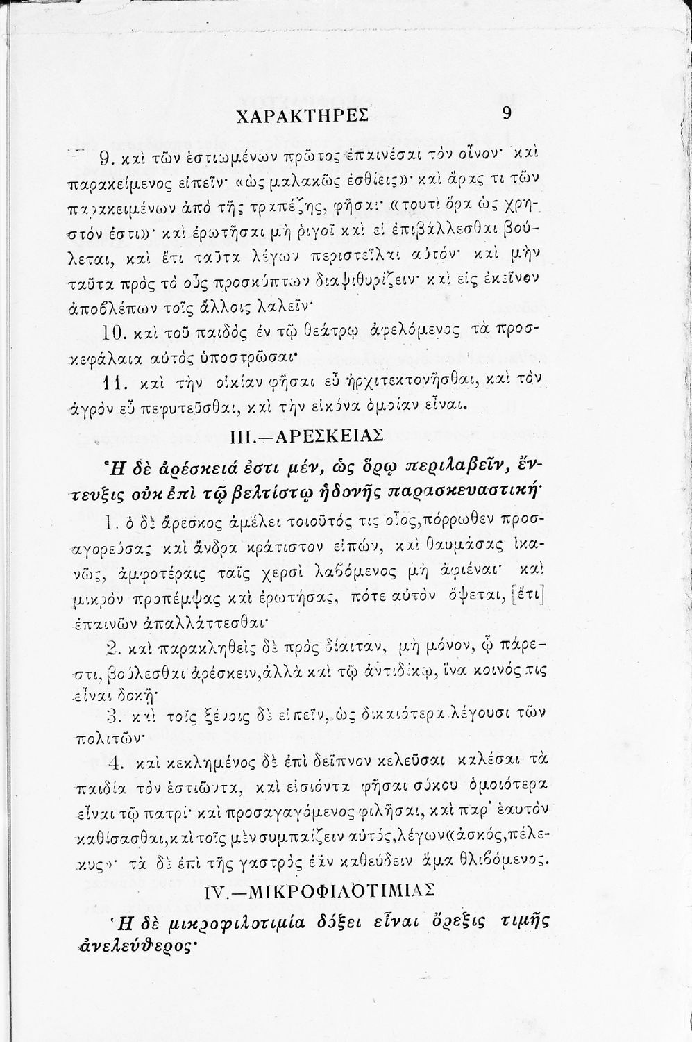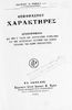 Σχολικό εγχειρίδιο Αρχαίων Ελληνικών Γ΄ Γυμνασίου που περιέχει τους Χαρακτήρες του Θεόφραστου, και ερμηνευτικές και πραγματολογικές παρατηρήσεις.