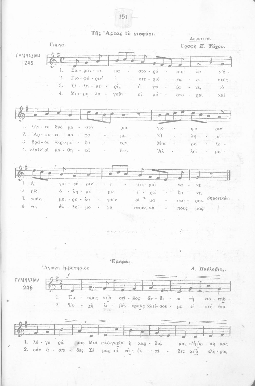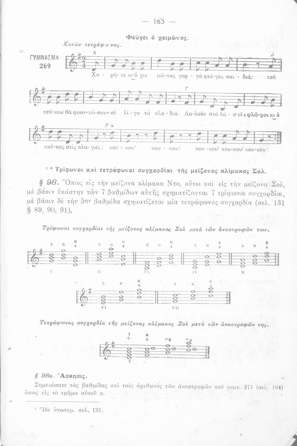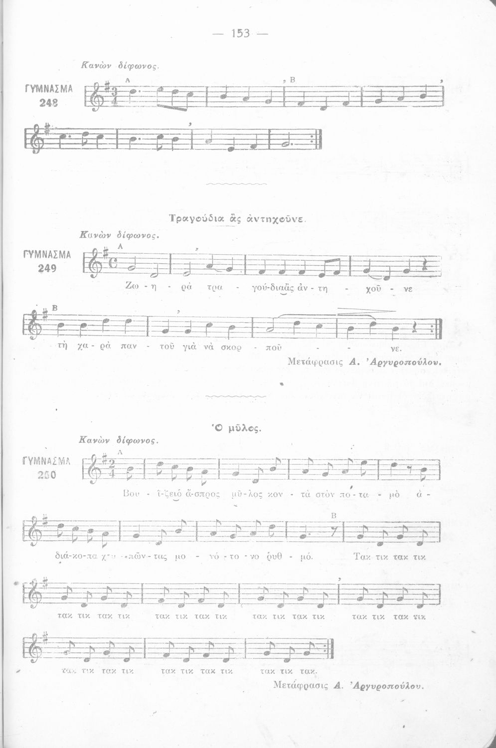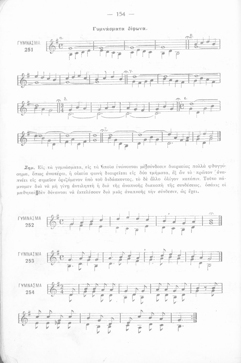 Σχολικό εγχειρίδιο Μουσικής για την Β' τάξη Εξαταξίων και Γ', Δ' τάξη Οκταταξίων σχολείων Μέσης Εκπαιδεύσεως. Περιέχει μείζονες κλίμακες και αλλοιωμένους φθόγγους, μελωδικές ασκήσεις και δίφωνες μελωδικές ...
