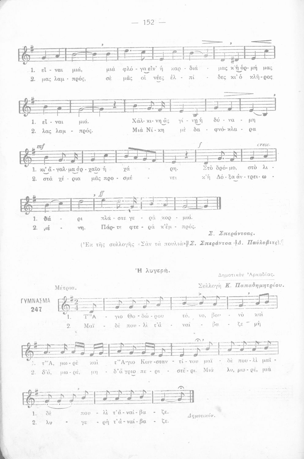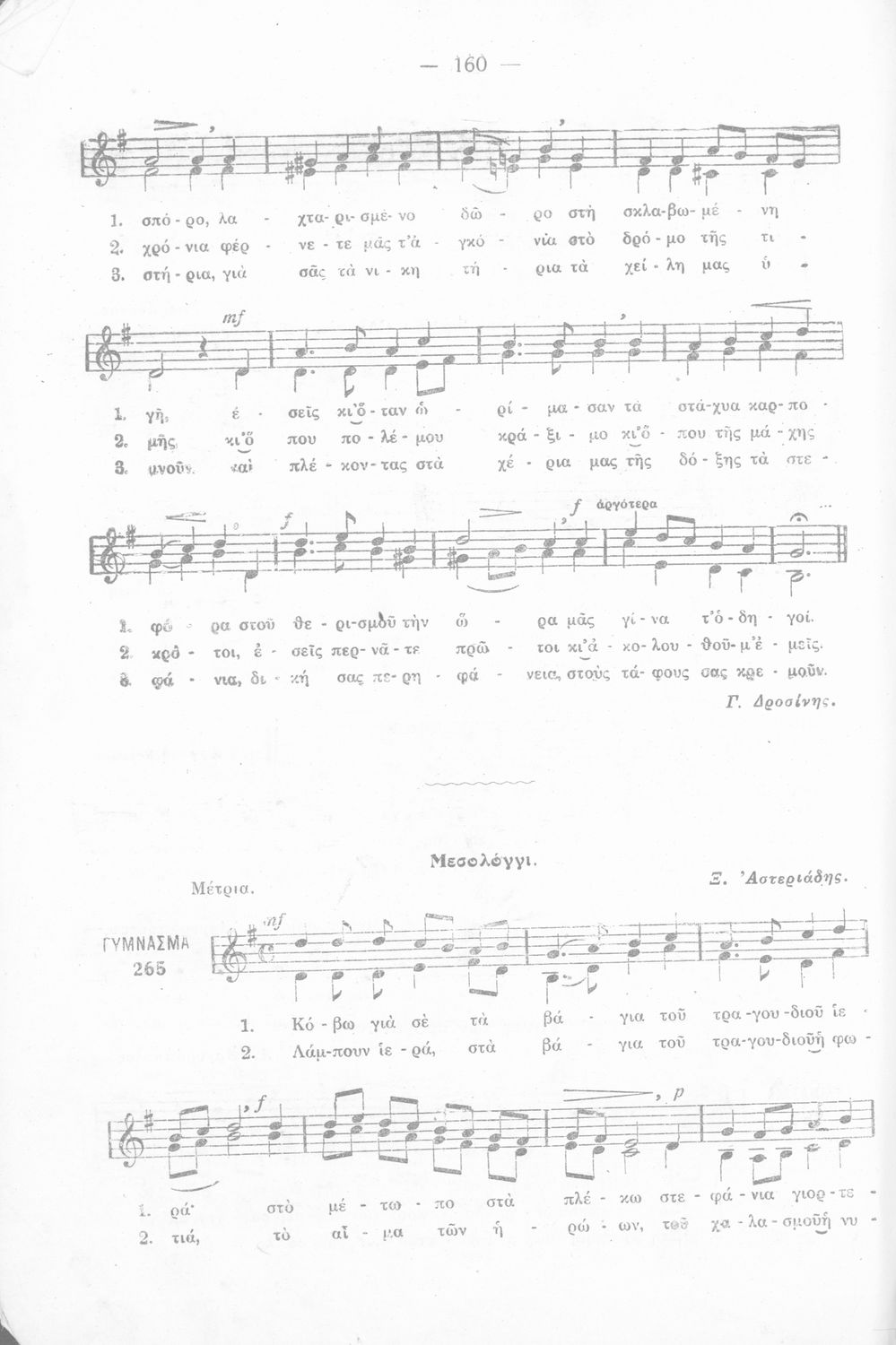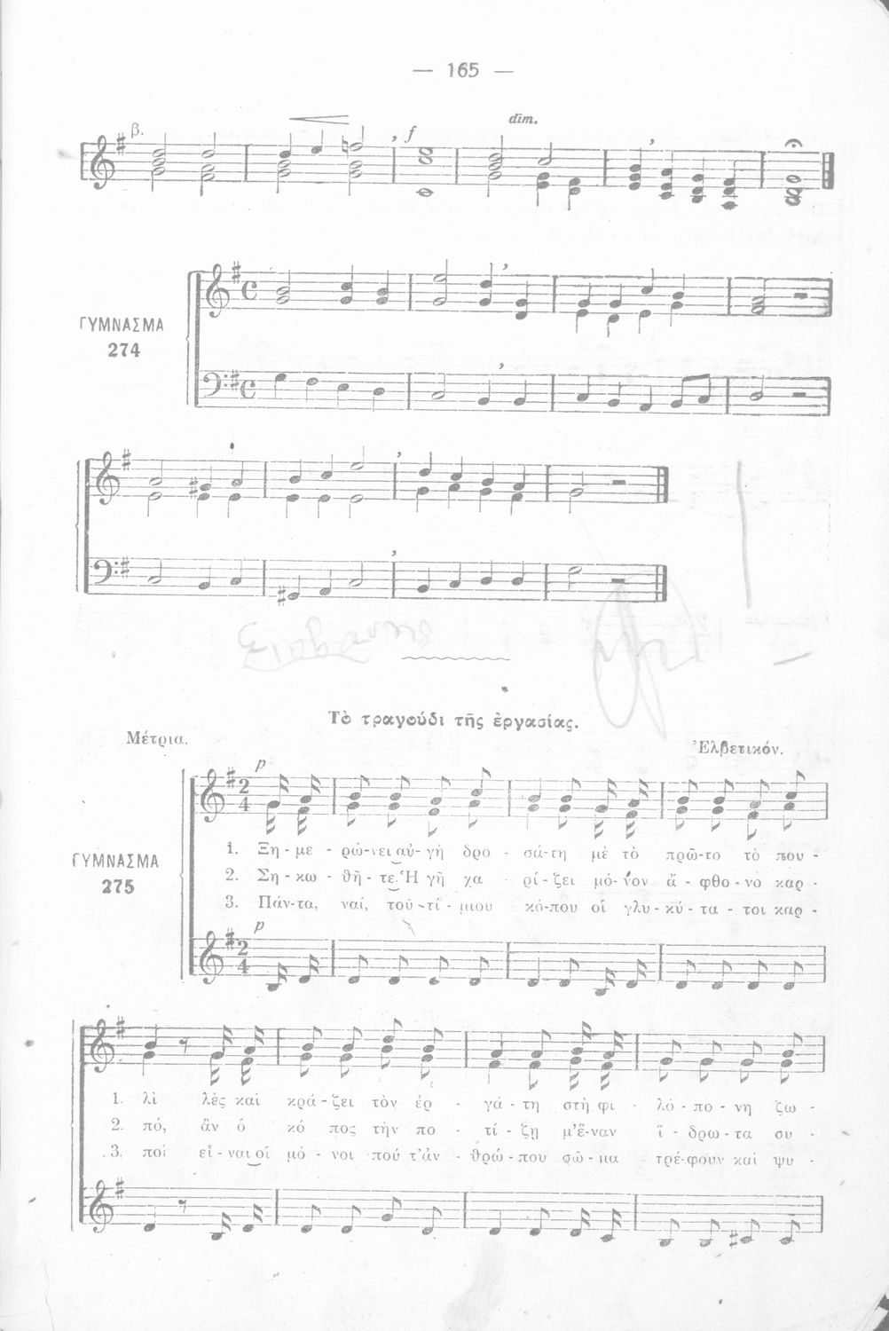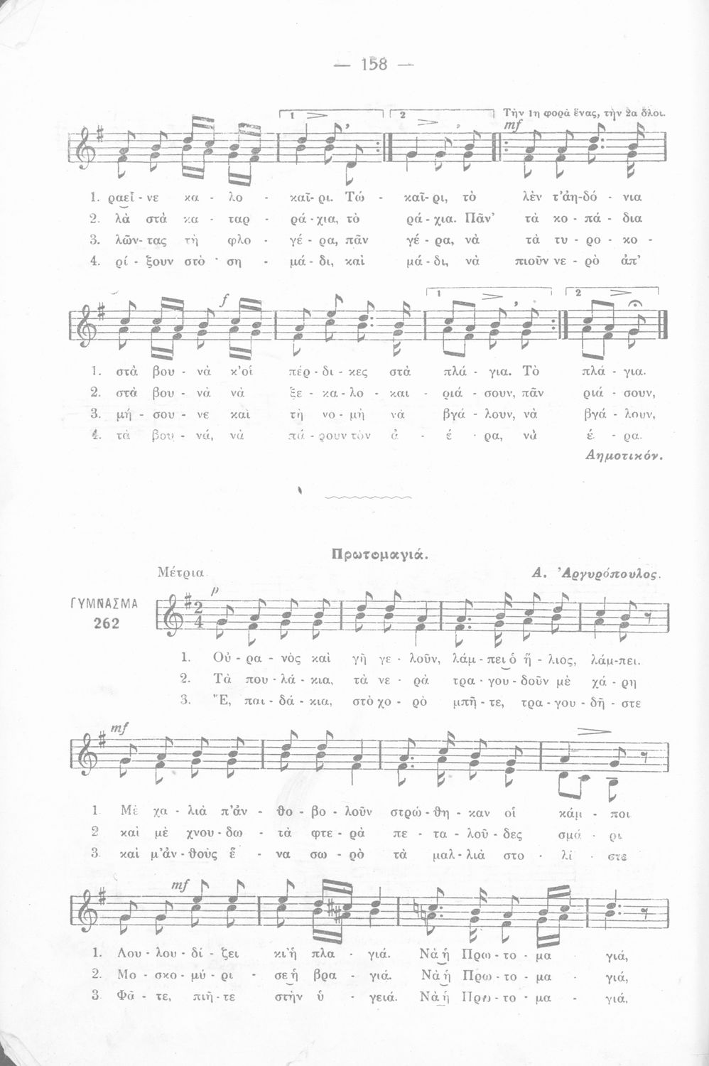 Σχολικό εγχειρίδιο Μουσικής για την Β' τάξη Εξαταξίων και Γ', Δ' τάξη Οκταταξίων σχολείων Μέσης Εκπαιδεύσεως. Περιέχει μείζονες κλίμακες και αλλοιωμένους φθόγγους, μελωδικές ασκήσεις και δίφωνες μελωδικές ...