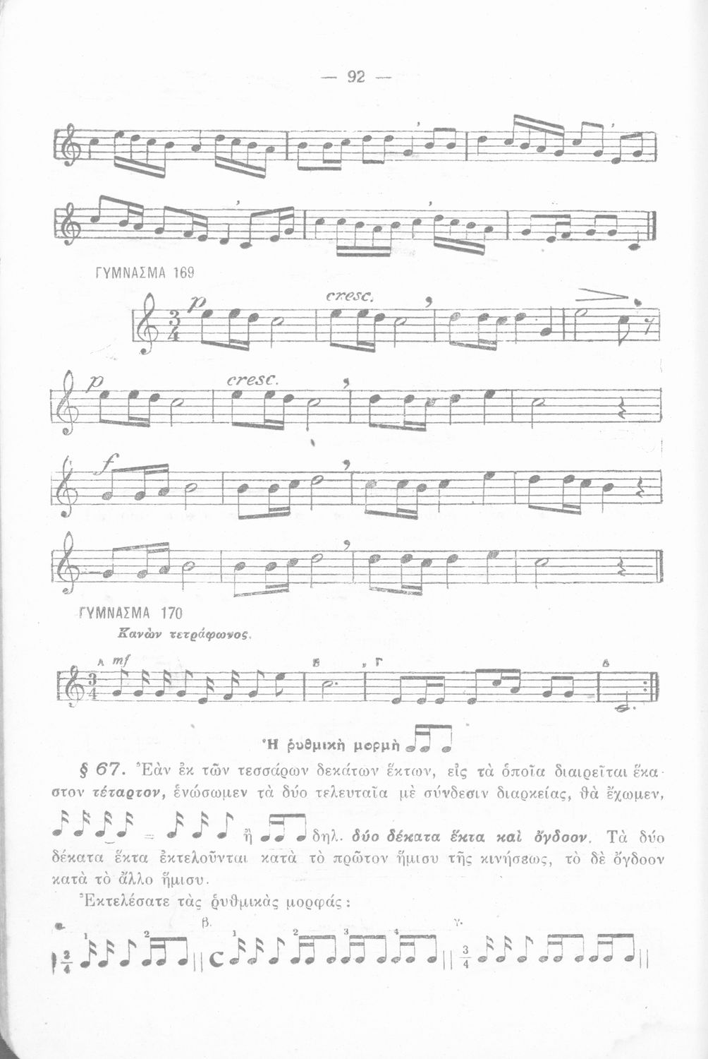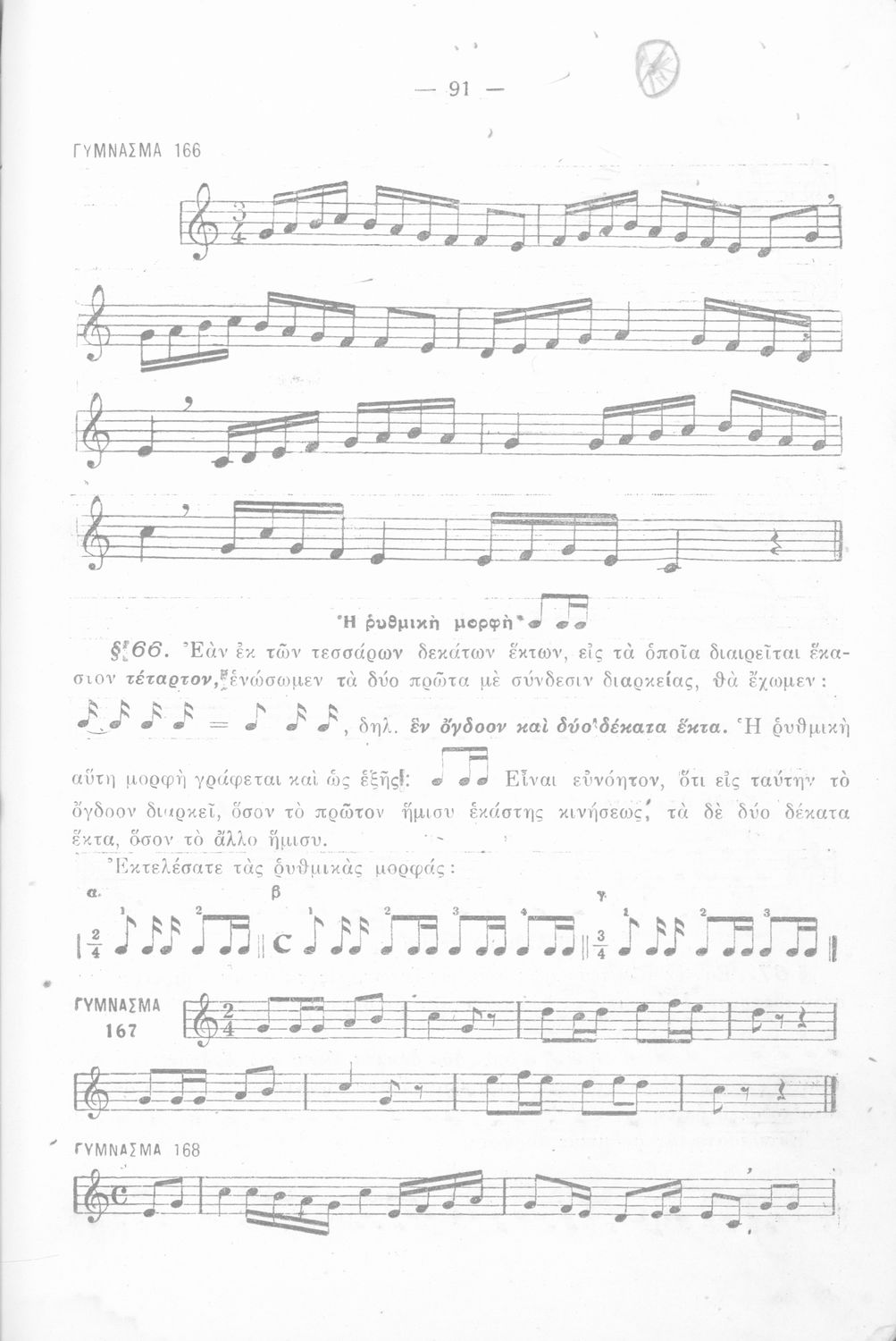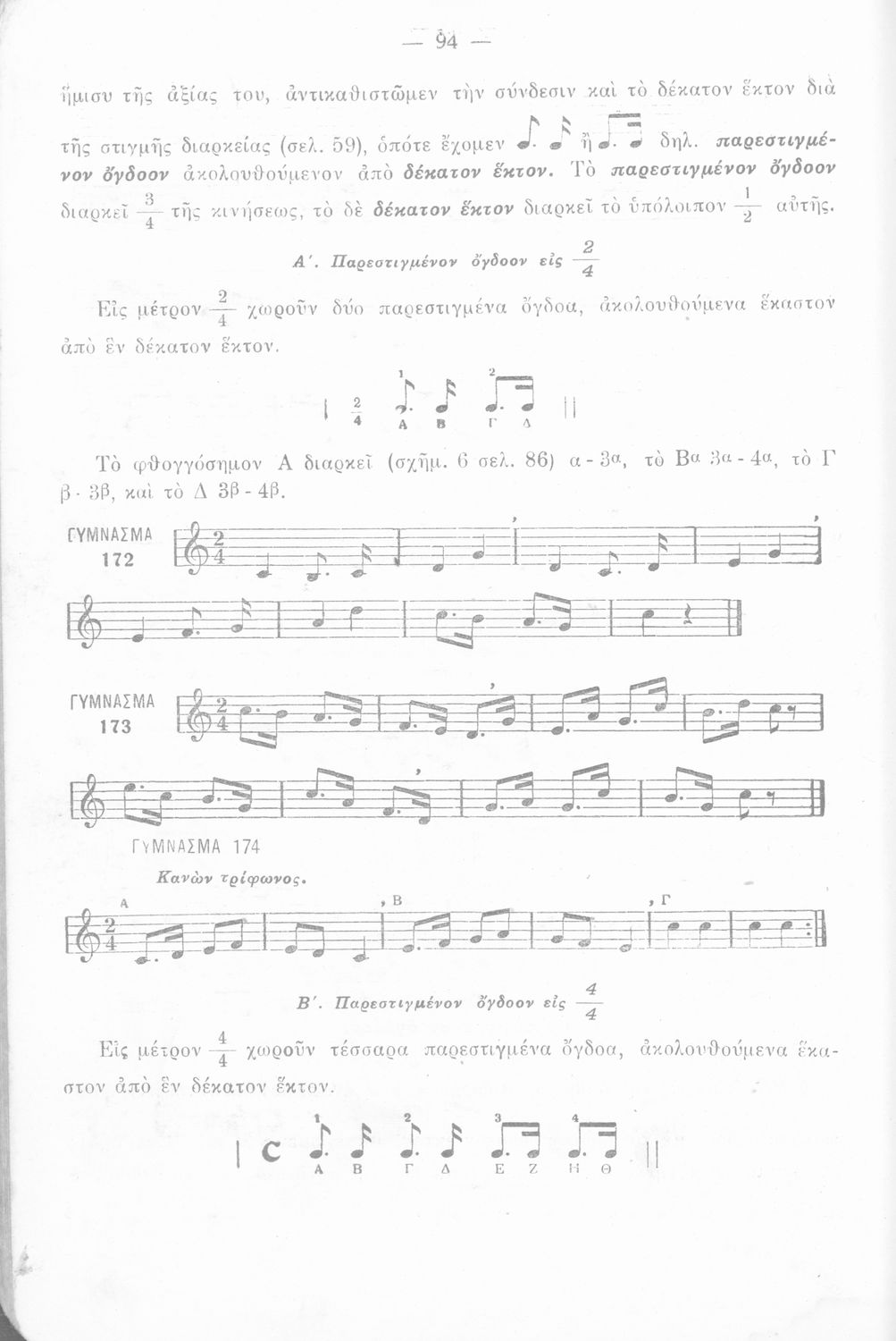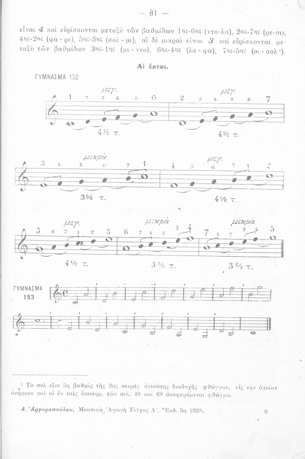 Σχολικό εγχειρίδιο Μουσικής για την Β' τάξη Εξαταξίων και Γ', Δ' τάξη Οκταταξίων σχολείων Μέσης Εκπαιδεύσεως. Περιέχει μείζονες κλίμακες και αλλοιωμένους φθόγγους, μελωδικές ασκήσεις και δίφωνες μελωδικές ...