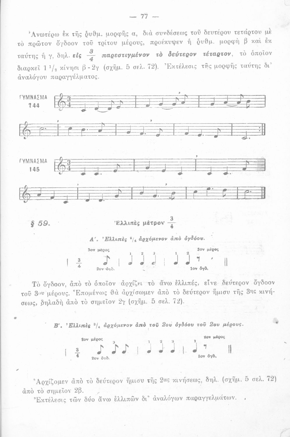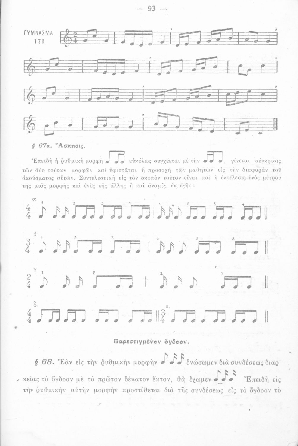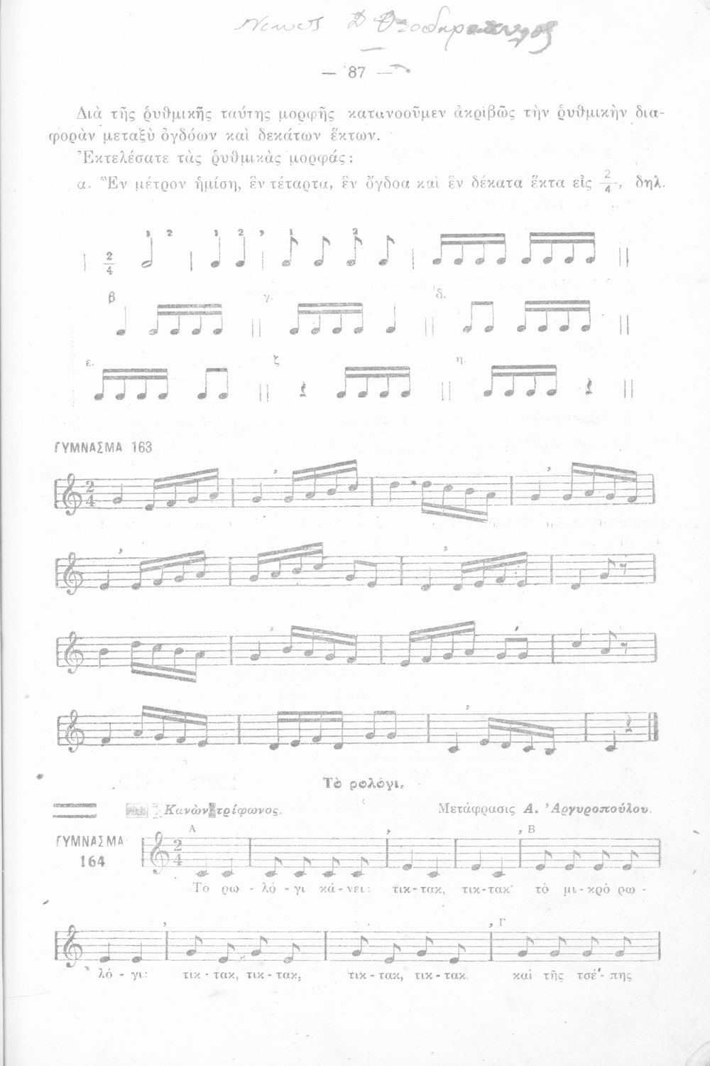 Σχολικό εγχειρίδιο Μουσικής για την Β' τάξη Εξαταξίων και Γ', Δ' τάξη Οκταταξίων σχολείων Μέσης Εκπαιδεύσεως. Περιέχει μείζονες κλίμακες και αλλοιωμένους φθόγγους, μελωδικές ασκήσεις και δίφωνες μελωδικές ...