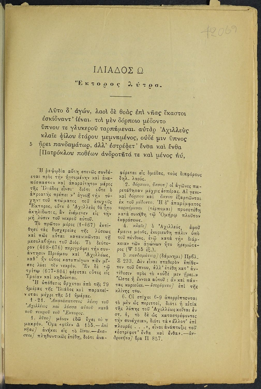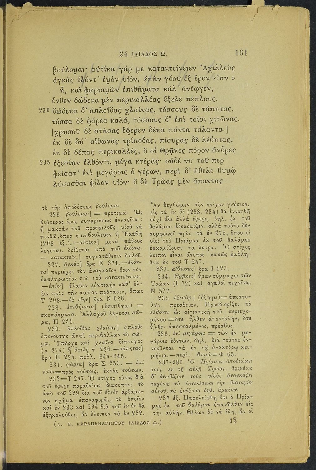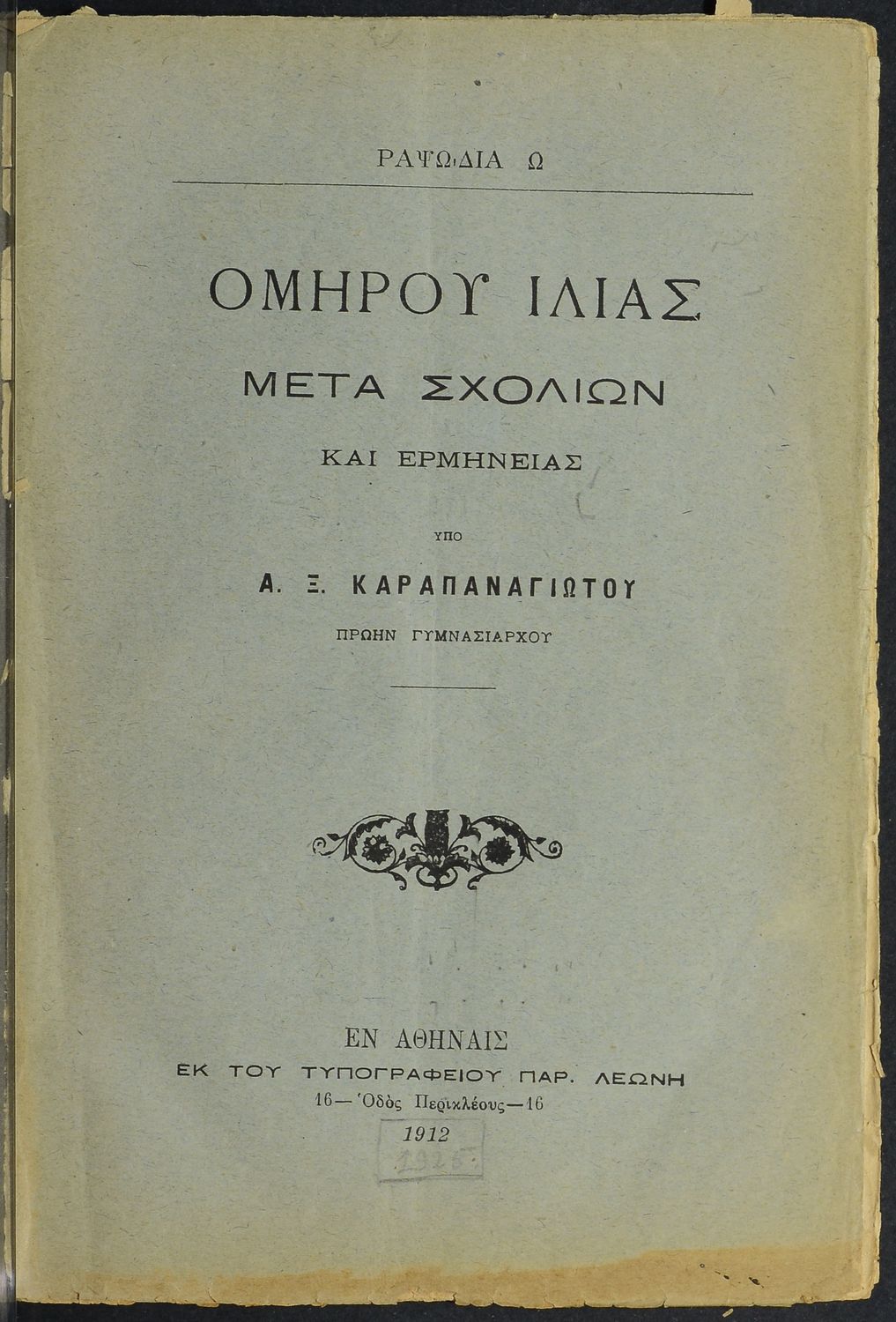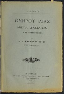 Παιδαγωγικό βοήθημα Αρχαίων Ελληνικών. Περιέχει την Ιλιάδα του Ομήρου με ερμηνεία του Γυμνασιάρχη Α. Ξ. Καραπαναγιώτη. Περιέχει την ραψωδία Γ'.