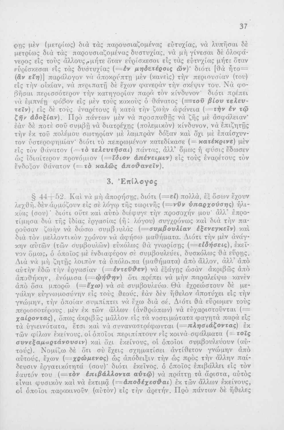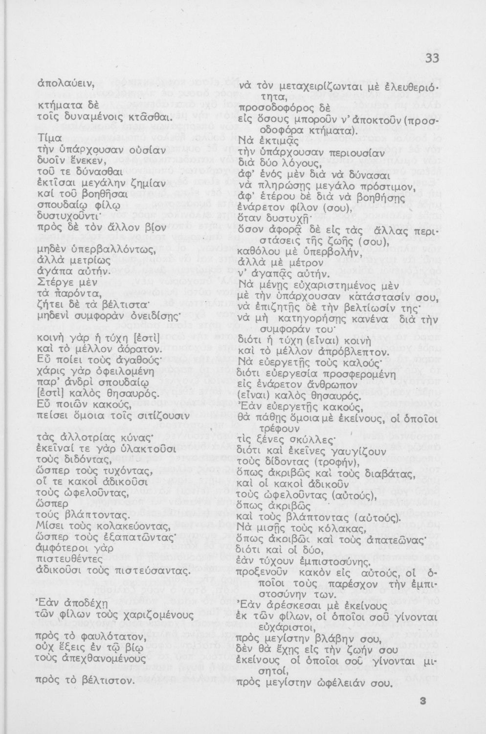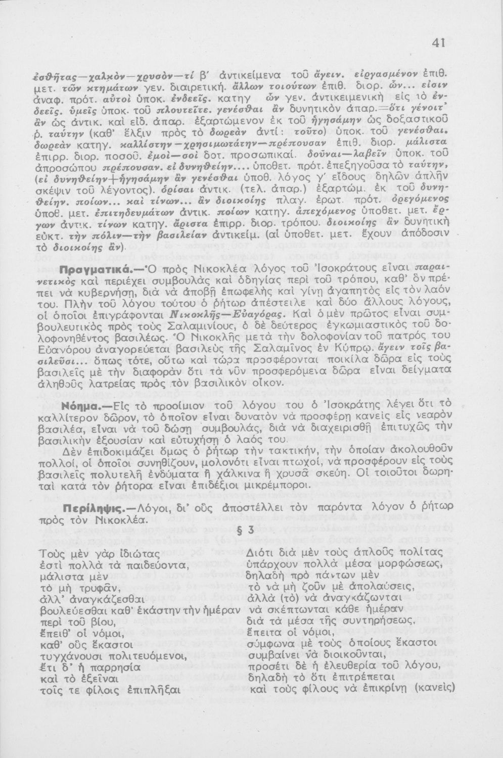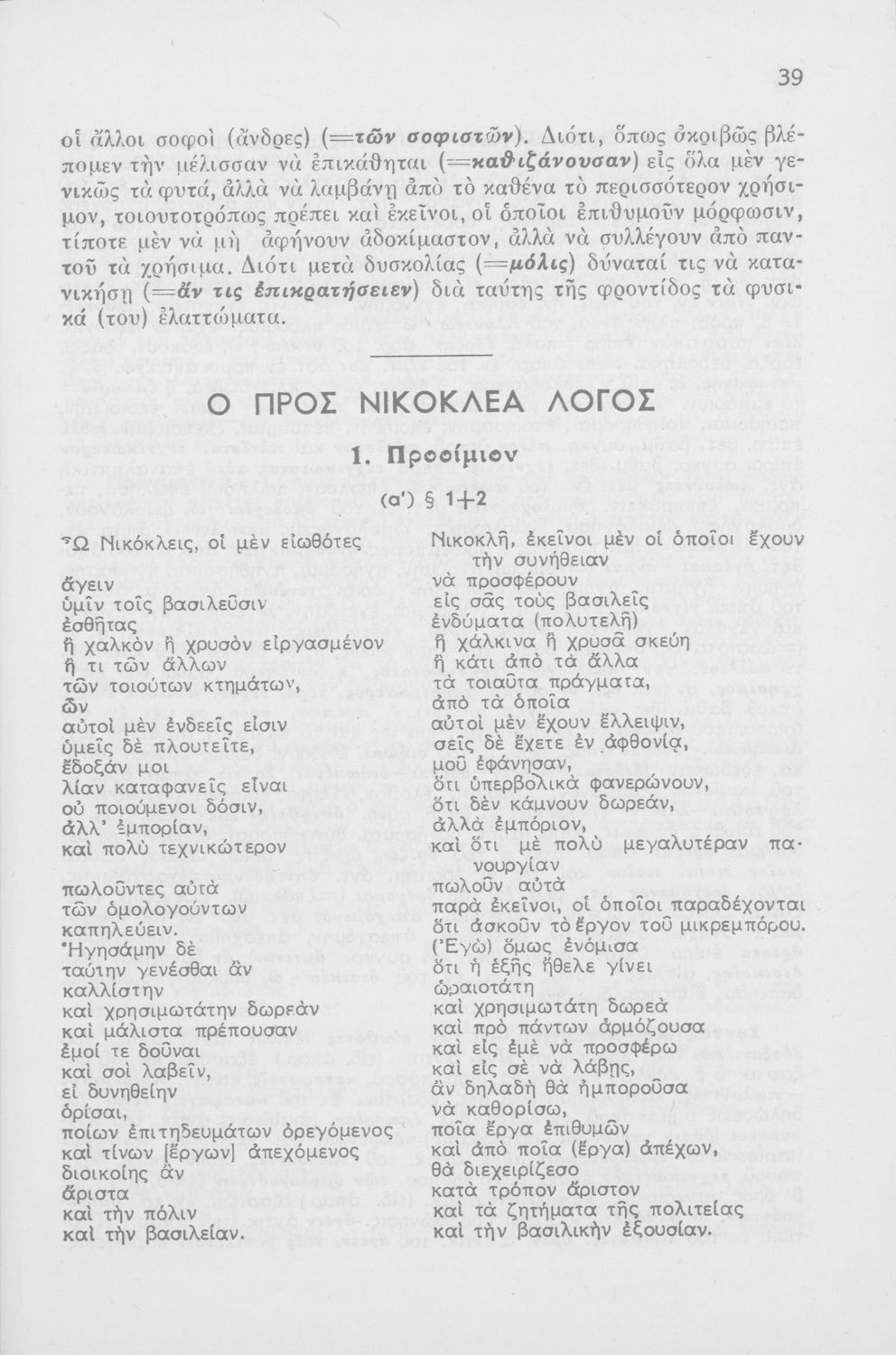 Μαθητικό βοήθημα Αρχαίων Ελληνικών για τους μαθητές της Ε΄ Οκταταξίου Γυμνασίου που περιλαμβάνει τους Λόγους του Ισοκράτη Προς Δημόνικον και Προς Νικοκλέα, μετάφραση, γραμματικά και συντακτικά σχόλια και ερμηνευτικές σημειώσεις.