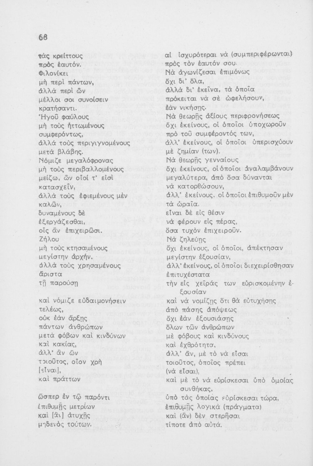 Μαθητικό βοήθημα Αρχαίων Ελληνικών για τους μαθητές της Ε΄ Οκταταξίου Γυμνασίου που περιλαμβάνει τους Λόγους του Ισοκράτη Προς Δημόνικον και Προς Νικοκλέα, μετάφραση, γραμματικά και συντακτικά σχόλια και ερμηνευτικές σημειώσεις.