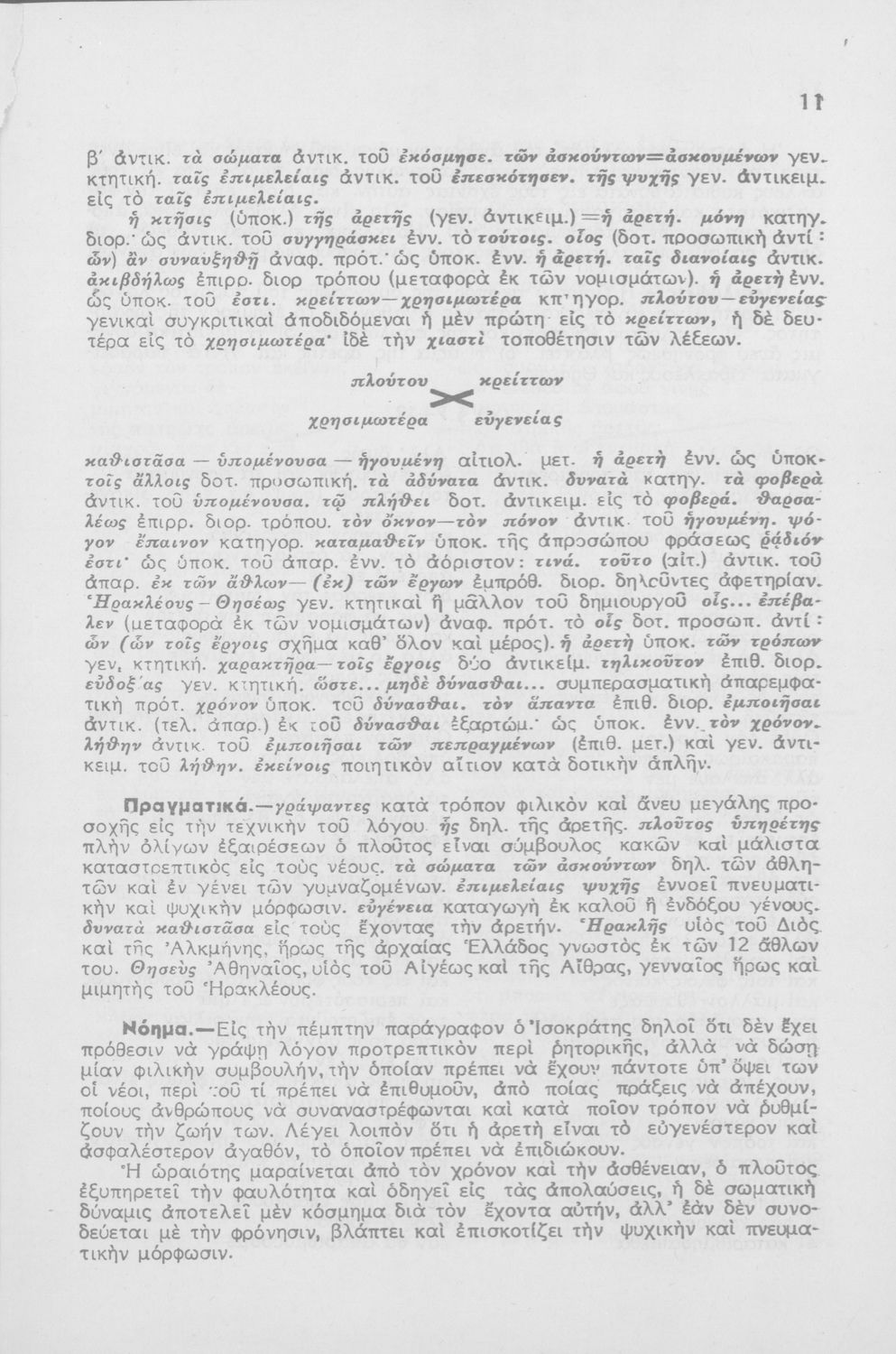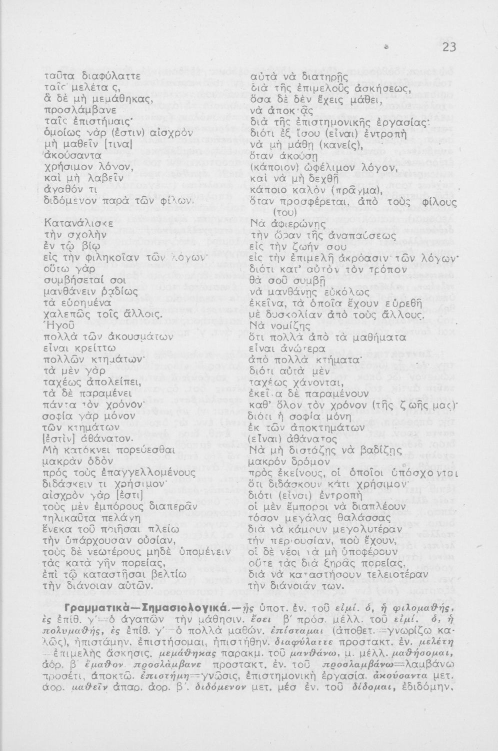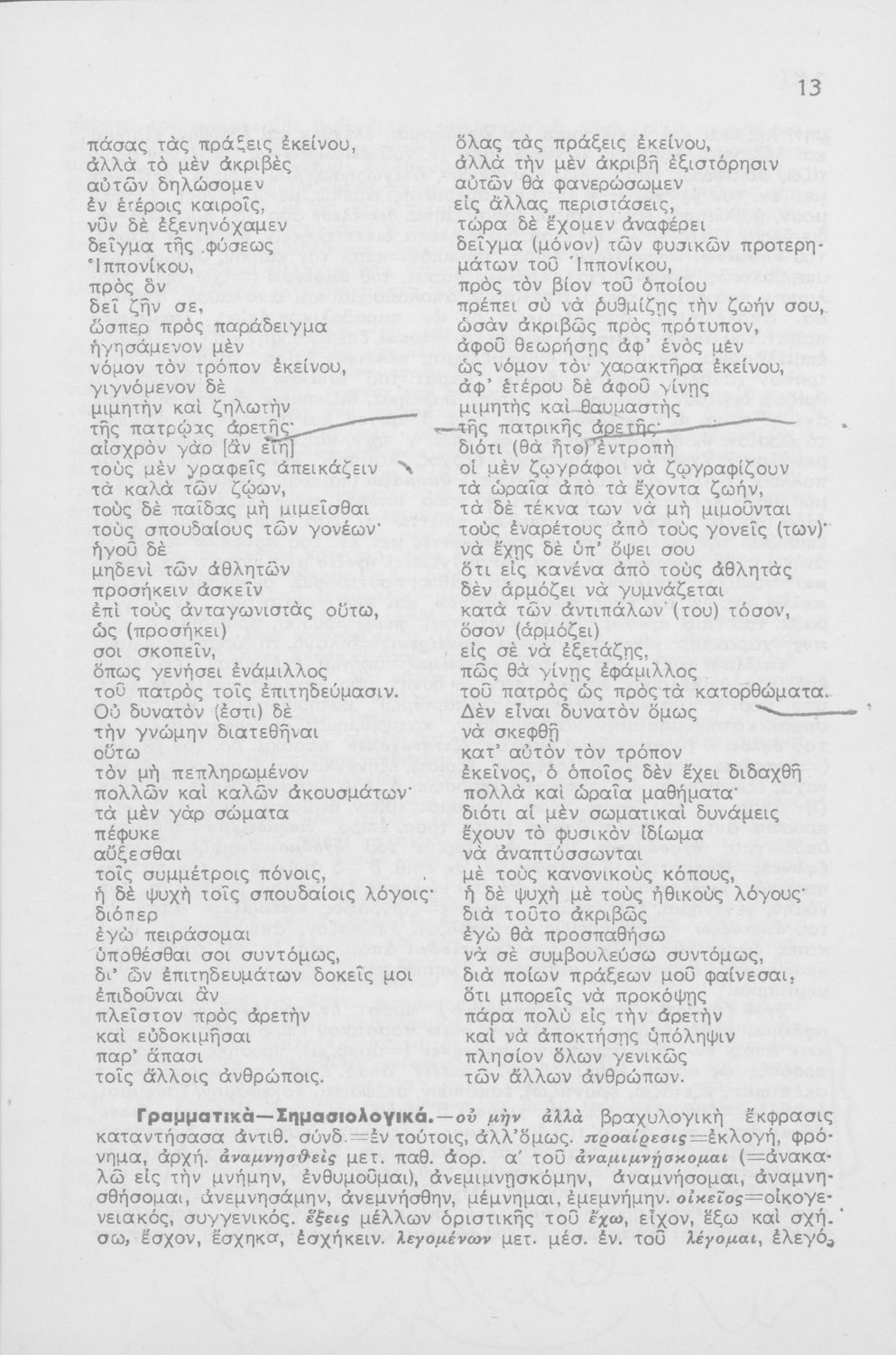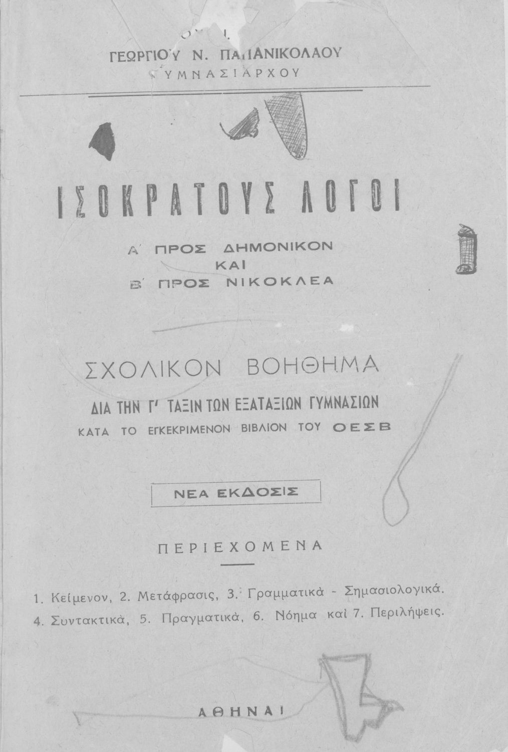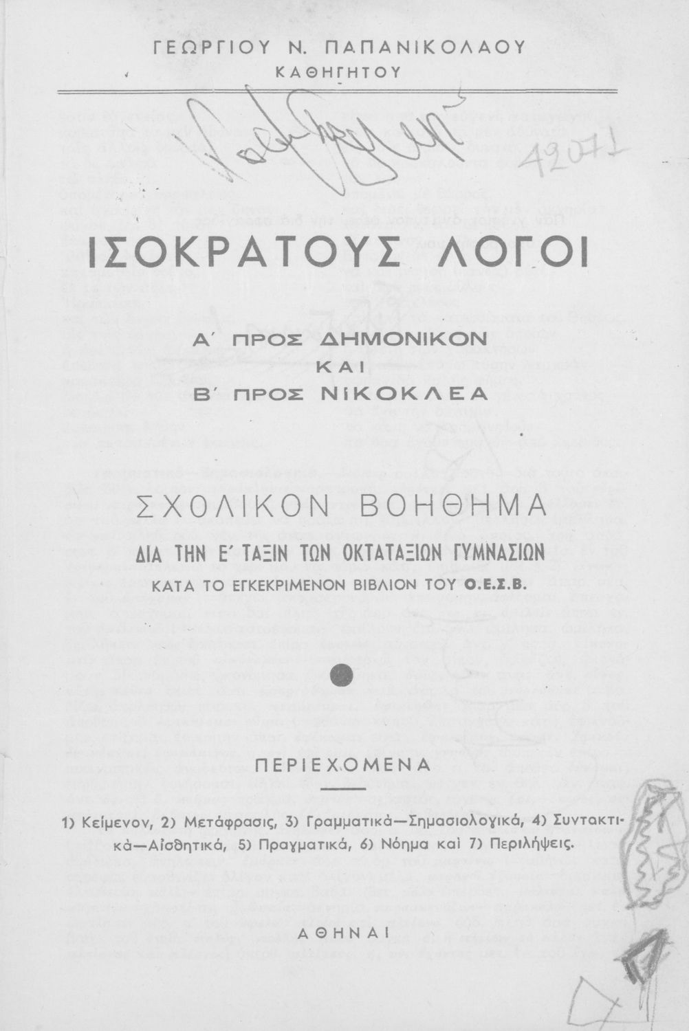 Μαθητικό βοήθημα Αρχαίων Ελληνικών για τους μαθητές της Ε΄ Οκταταξίου Γυμνασίου που περιλαμβάνει τους Λόγους του Ισοκράτη Προς Δημόνικον και Προς Νικοκλέα, μετάφραση, γραμματικά και συντακτικά σχόλια και ερμηνευτικές σημειώσεις.