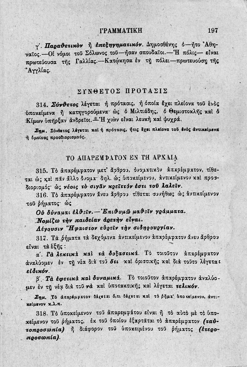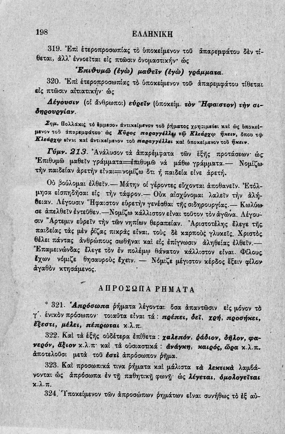 Σχολικό εγχειρίδιο που περιλαμβάνει τη γραμματική της αρχαίας ελληνικής, λεξικό ρημάτων και τους βασικότερους κανόνες του συντακτικού.