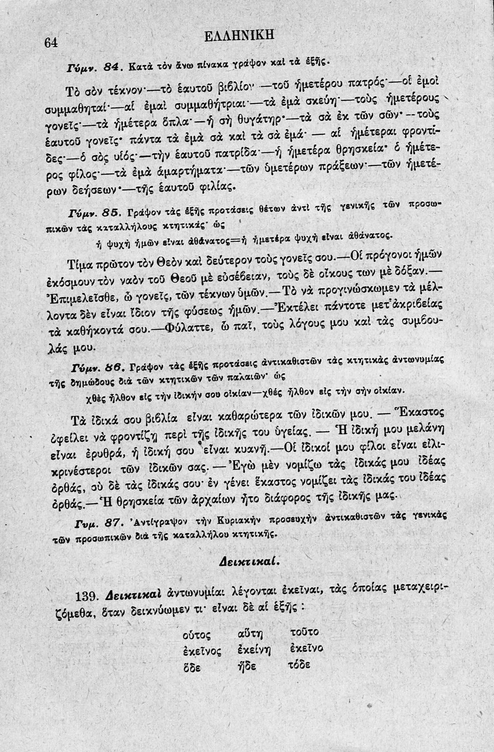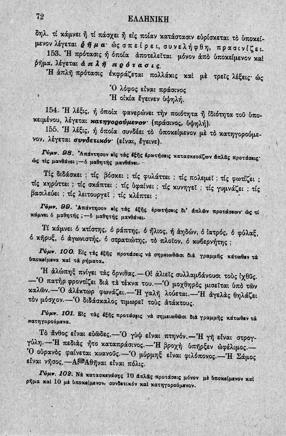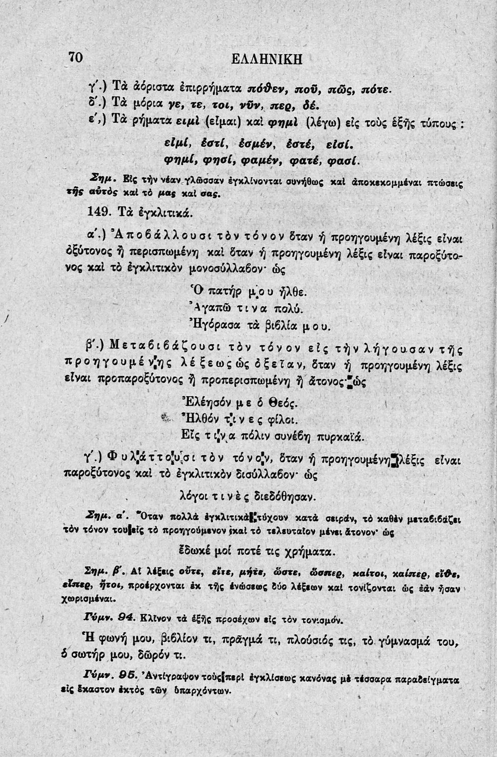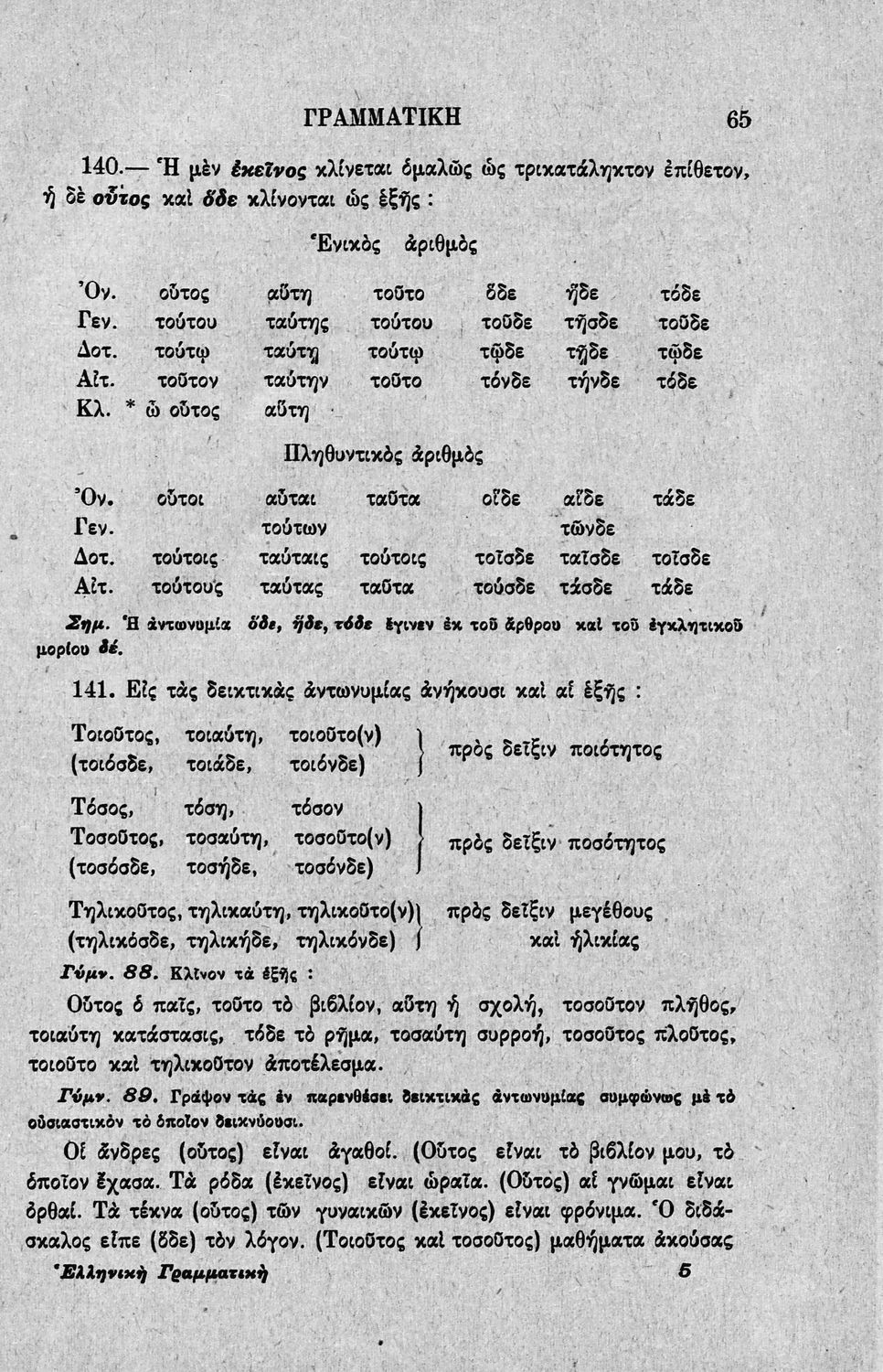 Βαθμίδα εκπαίδευσης: Πρωτοβάθμια Τάξη: Ε' Δημοτικού / ΣΤ' Δημοτικού Μάθημα: Νέα Ελληνικά Γλώσσα: Καθαρεύουσα Παρουσίαση περιεχομένου: Σχολικό εγχειρίδιο Γλώσσας Ε΄ και ΣΤ΄ Δημοτικού που περιλαμβάνει τους κανόνες γραμματικής της νέας ελληνικής. |