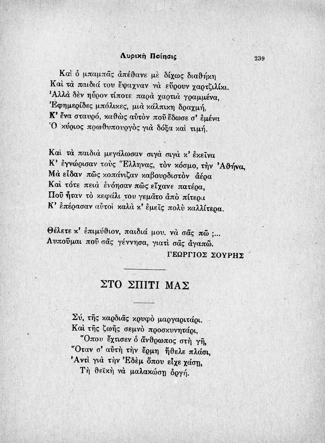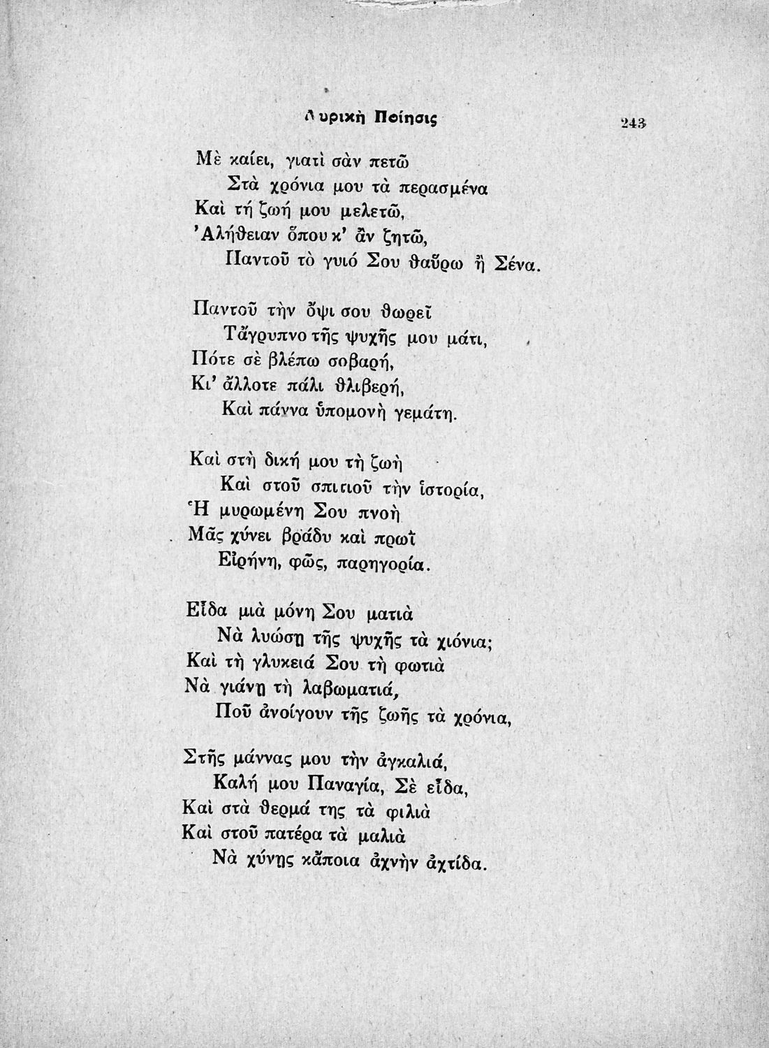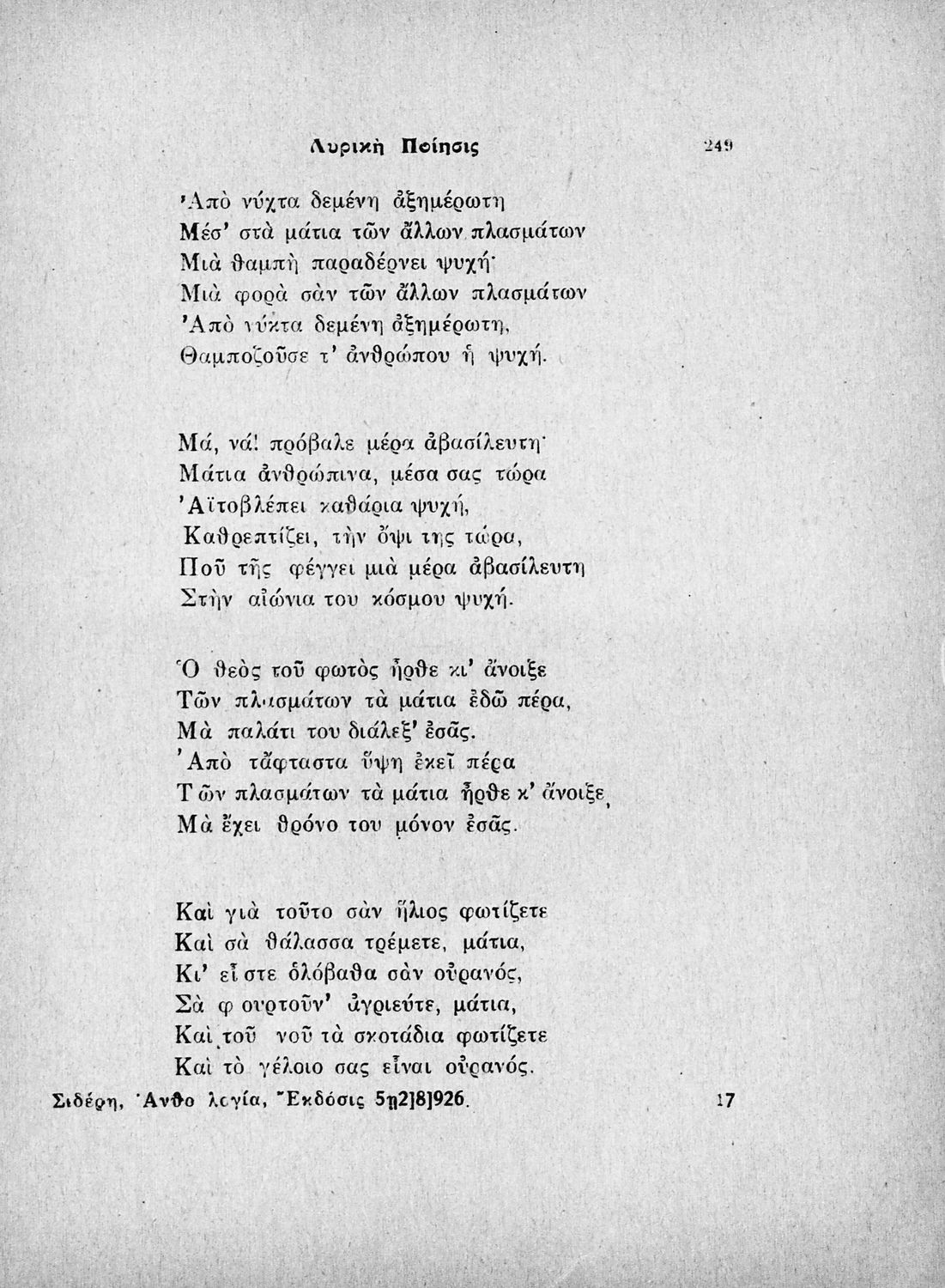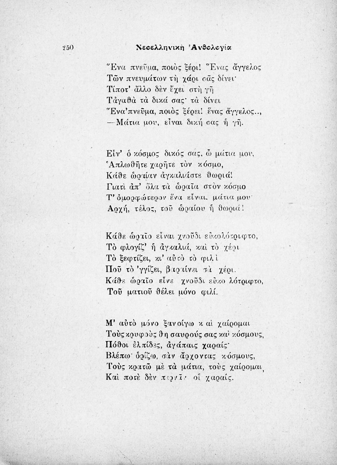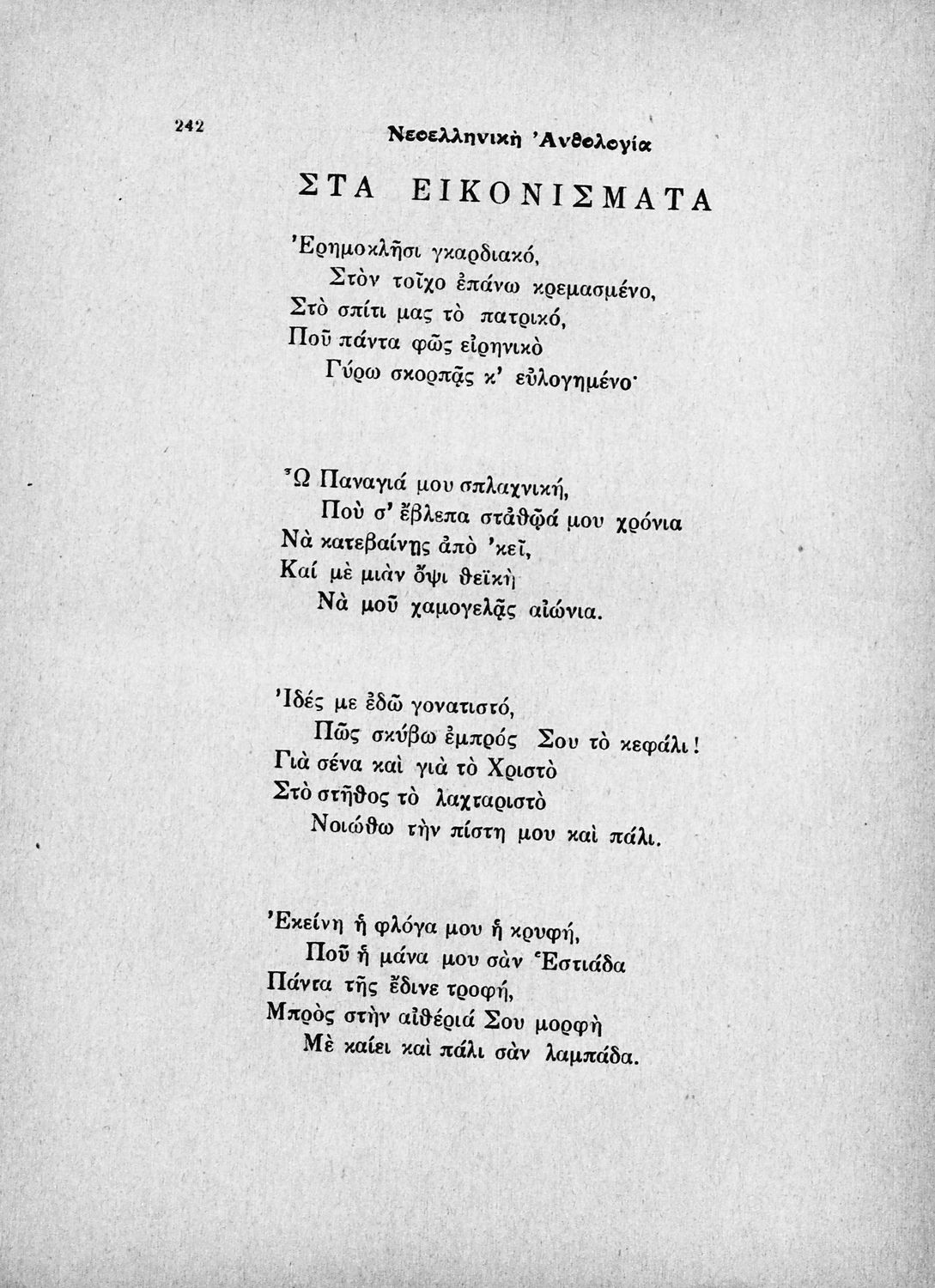 Σχολικό εγχειρίδιο Νέων Ελληνικών για τους μαθητές των Διδασκαλείων. Περιλαμβάνει ποιήματα Ελλήνων λογοτεχνών. Στο τέλος του βιβλίου υπάρχουν βιογραφίες των ποιητών.