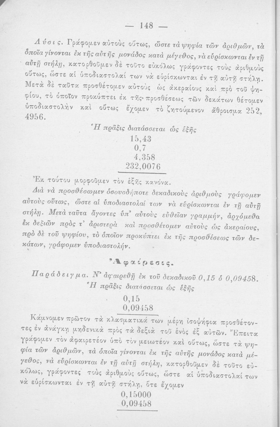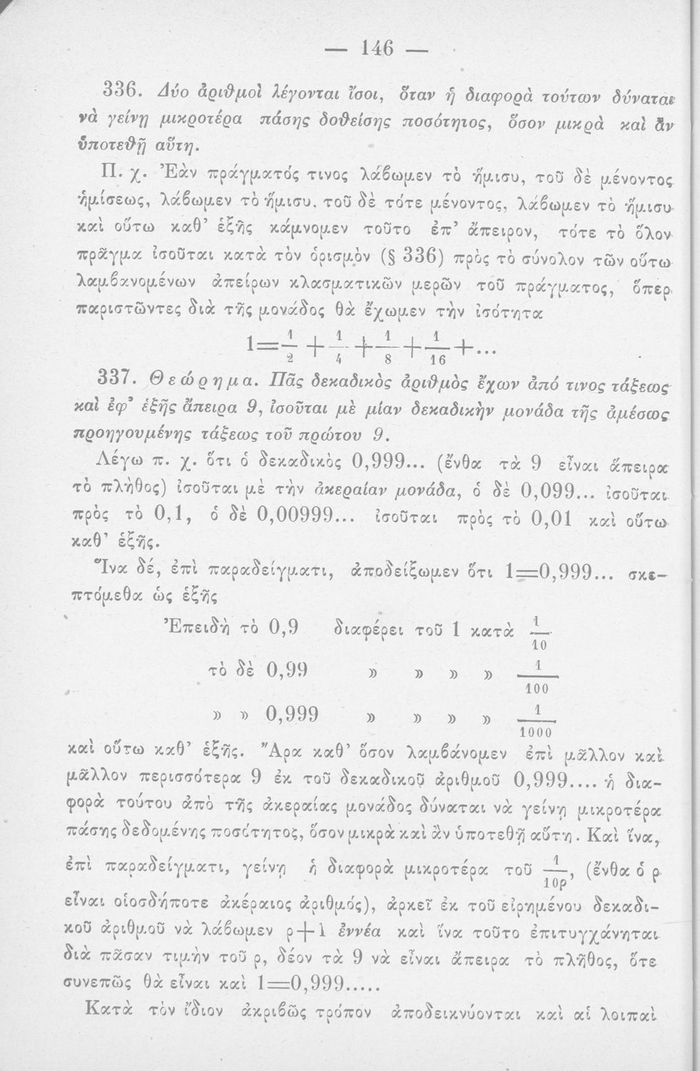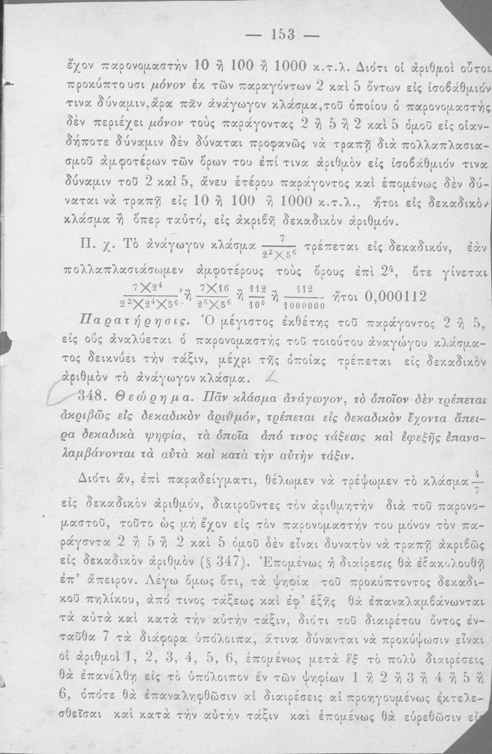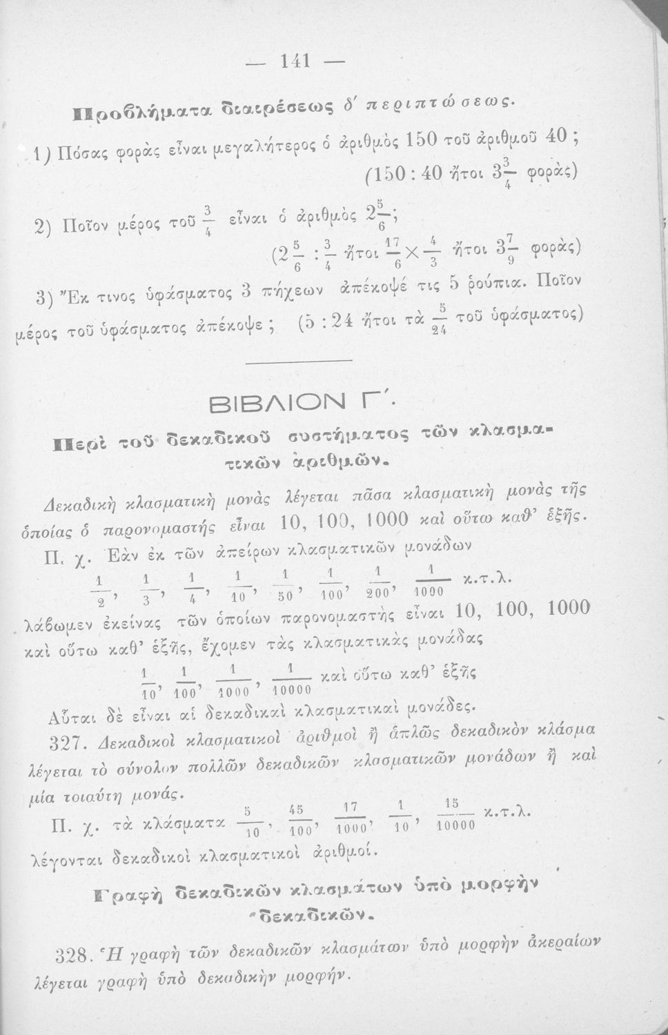 Βαθμίδα εκπαίδευσης: Δευτεροβάθμια Τάξη: Γυμνάσιο Μάθημα: Μαθηματικά Γλώσσα: Απλή καθαρεύουσα Παρουσίαση περιεχομένου: Μαθητικό βοήθημα Αριθμητικής Γυμνασίου που περιέχει θεωρήματα, παραδείγματα και ασκήσεις και εστιάζει στις αριθμητικές πράξεις με ακέραιους αριθμούς και κλάσματα. Ο συγγραφέας ήταν διευθυντής στην Δημόσια Εμπορική Σχολή Αθηνών. |