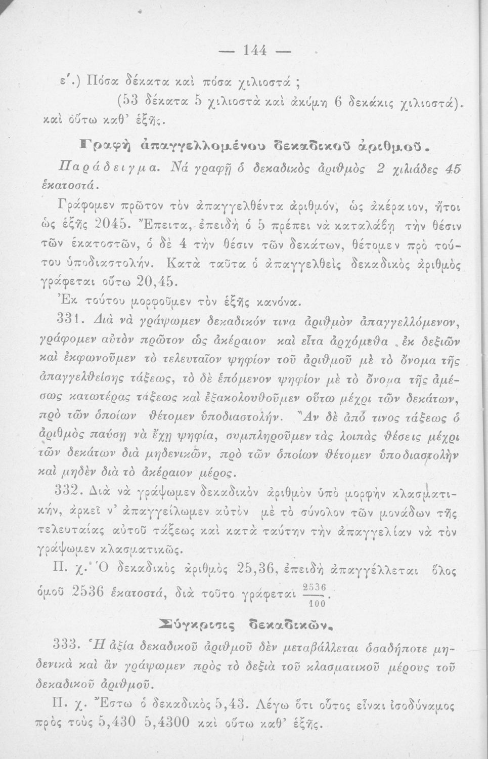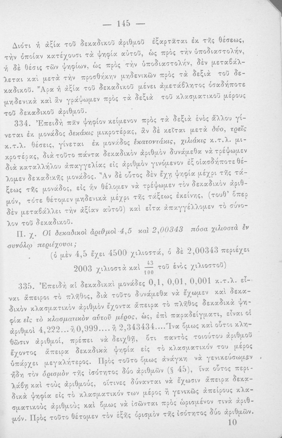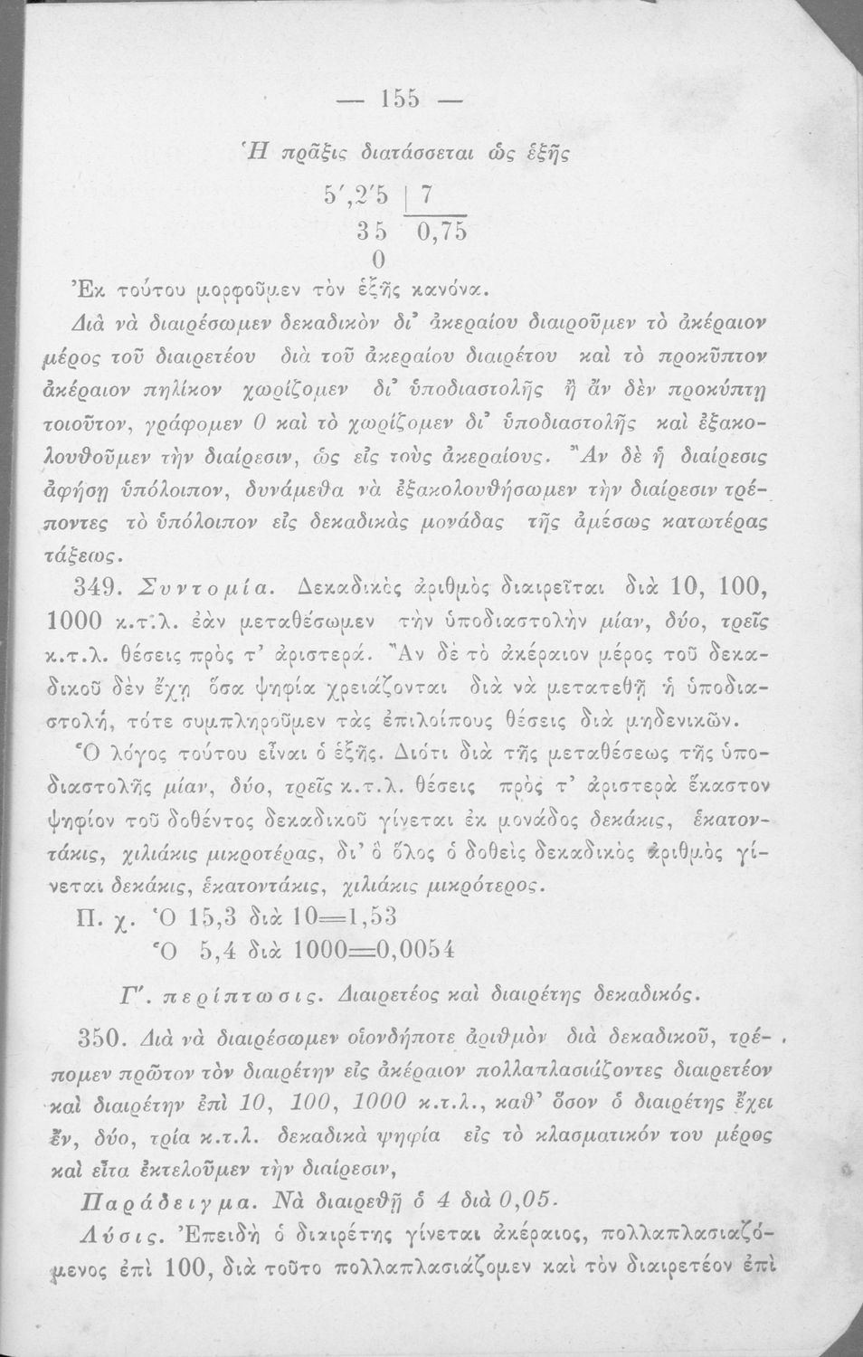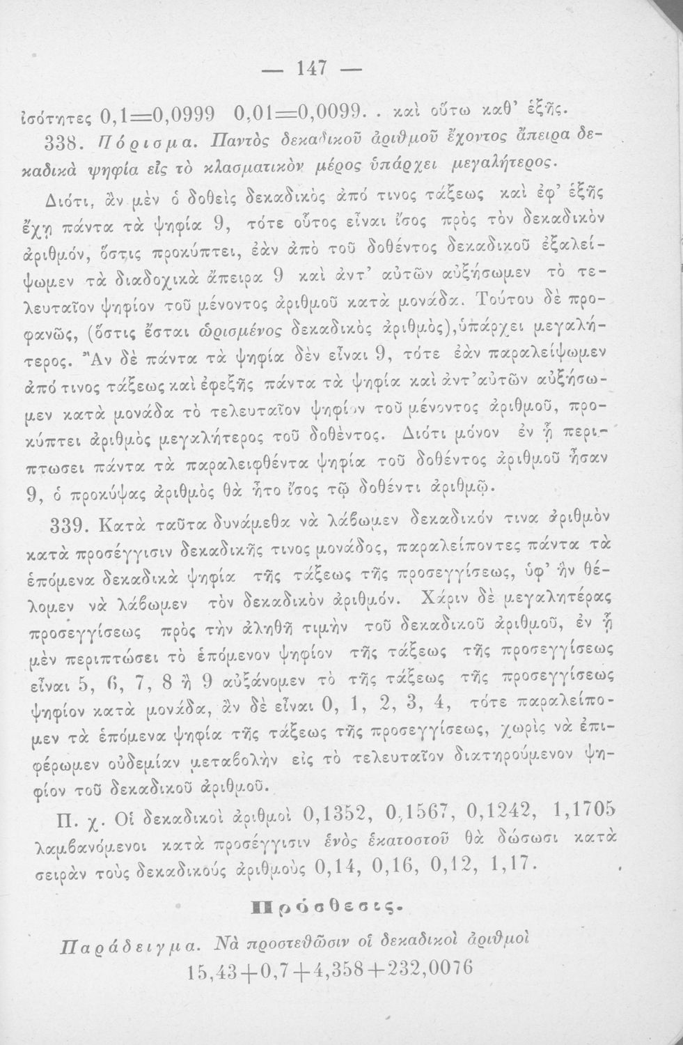Βαθμίδα εκπαίδευσης: Δευτεροβάθμια Τάξη: Γυμνάσιο Μάθημα: Μαθηματικά Γλώσσα: Απλή καθαρεύουσα Παρουσίαση περιεχομένου: Μαθητικό βοήθημα Αριθμητικής Γυμνασίου που περιέχει θεωρήματα, παραδείγματα και ασκήσεις και εστιάζει στις αριθμητικές πράξεις με ακέραιους αριθμούς και κλάσματα. Ο συγγραφέας ήταν διευθυντής στην Δημόσια Εμπορική Σχολή Αθηνών. |