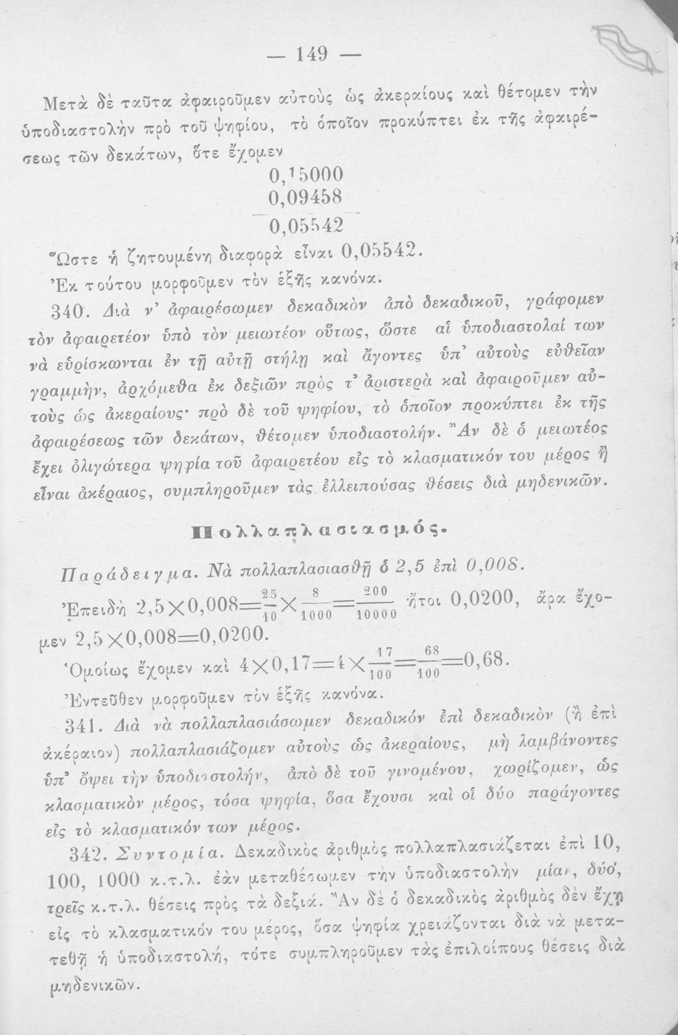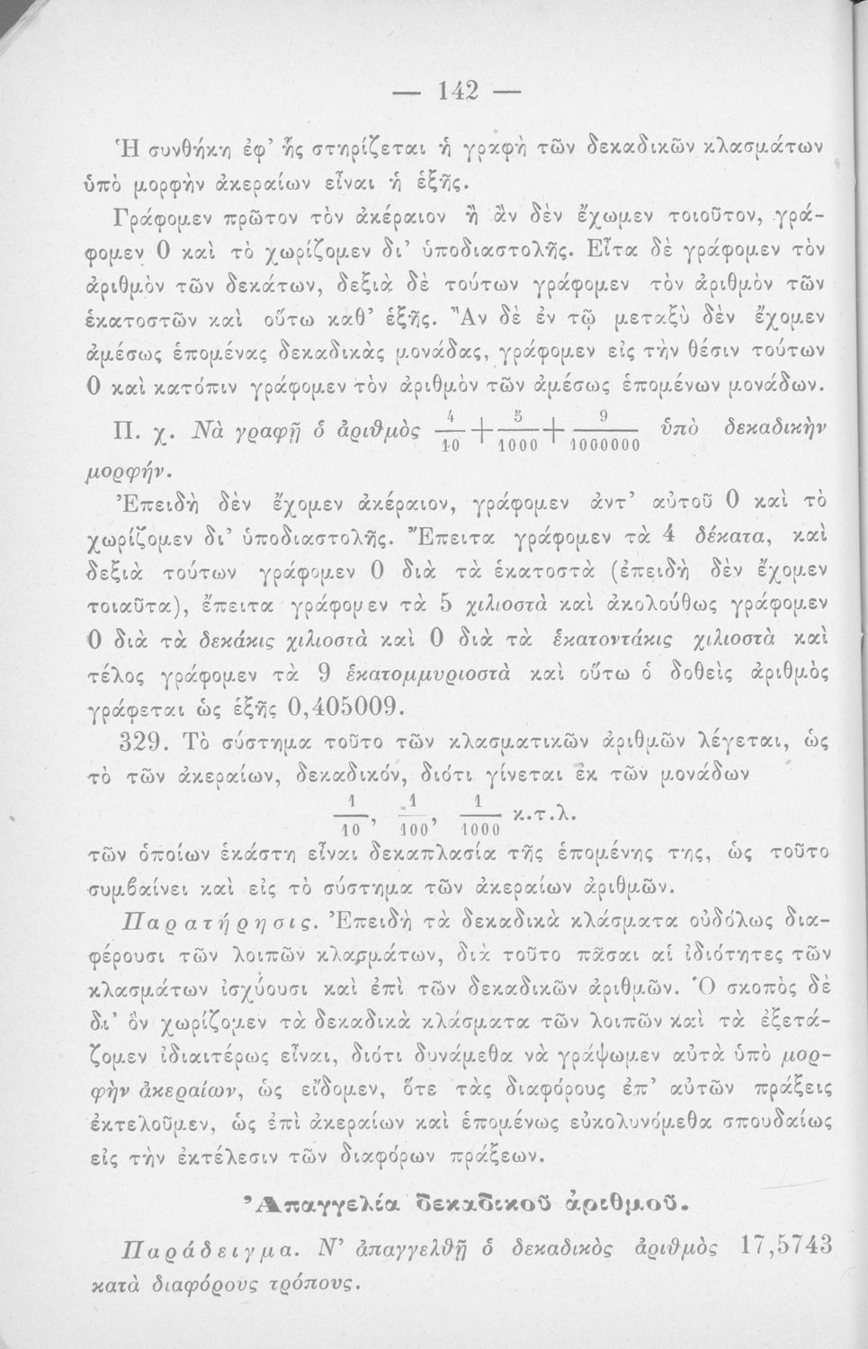 Μαθητικό βοήθημα Αριθμητικής Γυμνασίου που περιέχει θεωρήματα, παραδείγματα και ασκήσεις και εστιάζει στις αριθμητικές πράξεις με ακέραιους αριθμούς και κλάσματα. Ο συγγραφέας ήταν διευθυντής στην Δημόσια Εμπορική Σχολή Αθηνών.